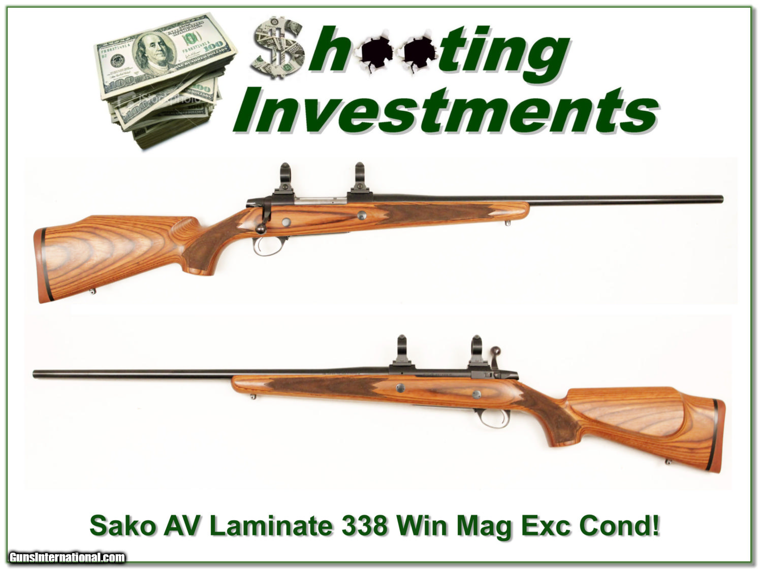 Description: This is a no longer made but sought after Sako AV Laminate. This one is chambered in the hard hitting 338 Win Mag. It comes as shown with high end Tally 1 in rings. This gun has no marks I see and I am sure never fired more than a few rounds. Will make a very nice big game rifle and is one you can expect to increase in value over time! That’s what a Shooting Investment is! Shipping and insurance is $30 or $18 more if you want it shipped in a new Plano hard case. Please email me with any questions or larger pictures. (I now consign quality firearms only 10%! Let me know if you have any you would like to sell!) [15-1469] Payment: Payment is by Money Order, Cashiers Check or Personal Check. I can now also accept MasterCard and Visa with a 3% convenience fee. PayPal can be used for some items but never firearms. Please let us know if you would like to pay via PayPal. Shipping: The shipping charge will be listed in each description. It is $30 for most guns. Some heavy guns or those insured for over $2000 may be higher. Shipments to Alaska and Hawaii are higher because air shipment is required. Most firearms are shipped within 5 days of receipt of payment. We prefer shipping at the beginning of the week to avoid firearms in transit over weekends. We package all shipments carefully and insure them for the full purchase price, rounded up to the next $100. In the unlikely event that damage occurs, it is important that you save all packaging material for the claims process. Optics are shipped Priority Mail and most other non-firearm shipments are shipped First Class. Returns: Our return policy is simple. If for any reason you are not pleased with your purchase, you may return your item for a refund. The only exception is ammunition, it cannot be returned. It is important to us that you are happy. Guns cannot be fired or dissembled before returning them and must be returned in the same condition as received. Notification of a return must occur with-in 3 days of receipt at your dealer. Shipping, convenience and dealer fees are not refundable and are the responsibility of the buyer. Lay-a-way: If needed, we offer a 60 day lay-a-way option on most firearms. It is 1/3 now, 1/3 in 30 days and 1/3 in 60 days. Lay-a-way firearm sales are final. Consigning your firearms with Shooting Investments: We will help you get top dollar for your firearms. While most local guns shops charge 20% or more, our fee is only 10% with a minimum of $50. At your local gun shop it might take months to sell. Selling on-line provides instant access to thousands of interested buyers. You won’t find any other on-line dealer willing to sell your firearms for only 10% or listing every gun on 4 separate s. Selling through an House typically costs the seller 15% and the buyer an addition 15% (so 30%) and you have to wait several months to sell and longer to receive funds. If properly priced, we will sell your firearms in a week or two. Send us an email or give us a call and we’ll explain how easy it is for you to get top dollar. Trading: We collect guns and usually just trade for guns we want to add to our collections. We often sell guns for others wanting to purchase one of ours. We find this the most fair to both of us. Our Commission is only 10% and we hold the gun you want until yours sells. Please contact us if you want to sell one of yours to buy one of ours. Help for California Buyers: We are happy to ship to California. It is the buyer’s responsibility to make sure any item you buy is legal in your state. We are also happy to help with your purchase of a firearm from someone other than us. If you see a gun you would like to buy but the seller can’t or won’t ship to California we can help. You buy the gun and have it shipped to us. We’ll then ship it to your California dealer. The cost for this service is only $30 + shipping. Let me know if we can help! SOLD |