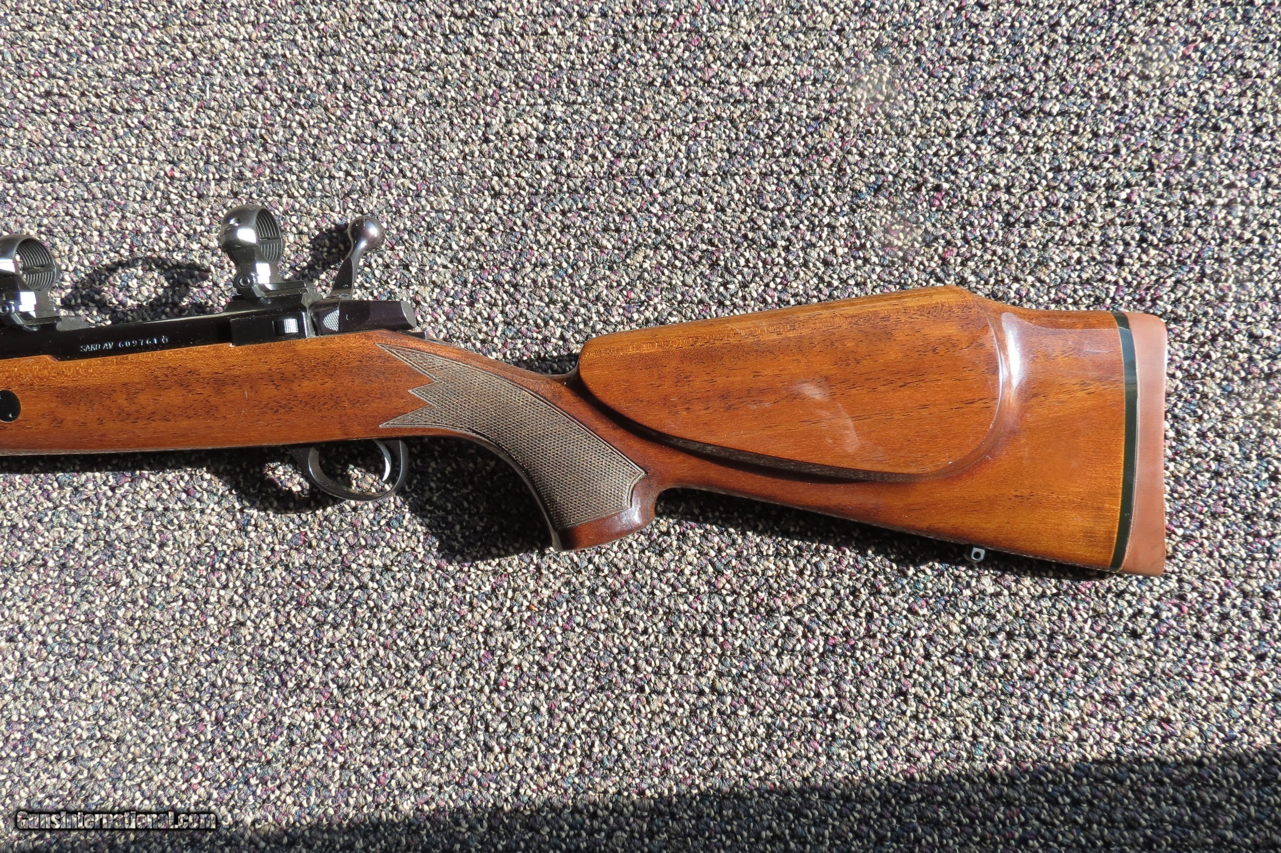 Description: Lightly used Sako AV in 270 Winchester, 24" barrel with adjustable rear sight and hooded front sight, Hinged floorplate, Rings, Metal in excellent condition with deep blueing, Checkered High Gloss finish with one nick below bolt handle (see photo) Raised cheek piece. Sako recoil pad. Rifle shows to be in excellent condition with on lite usage. Shipping/Insurance $40, Shipped in hard case add $15 SOLD Rifle Caliber: .270 Winchester Manufacturer: Sako Barrel Length: 24 Condition: Very Good |