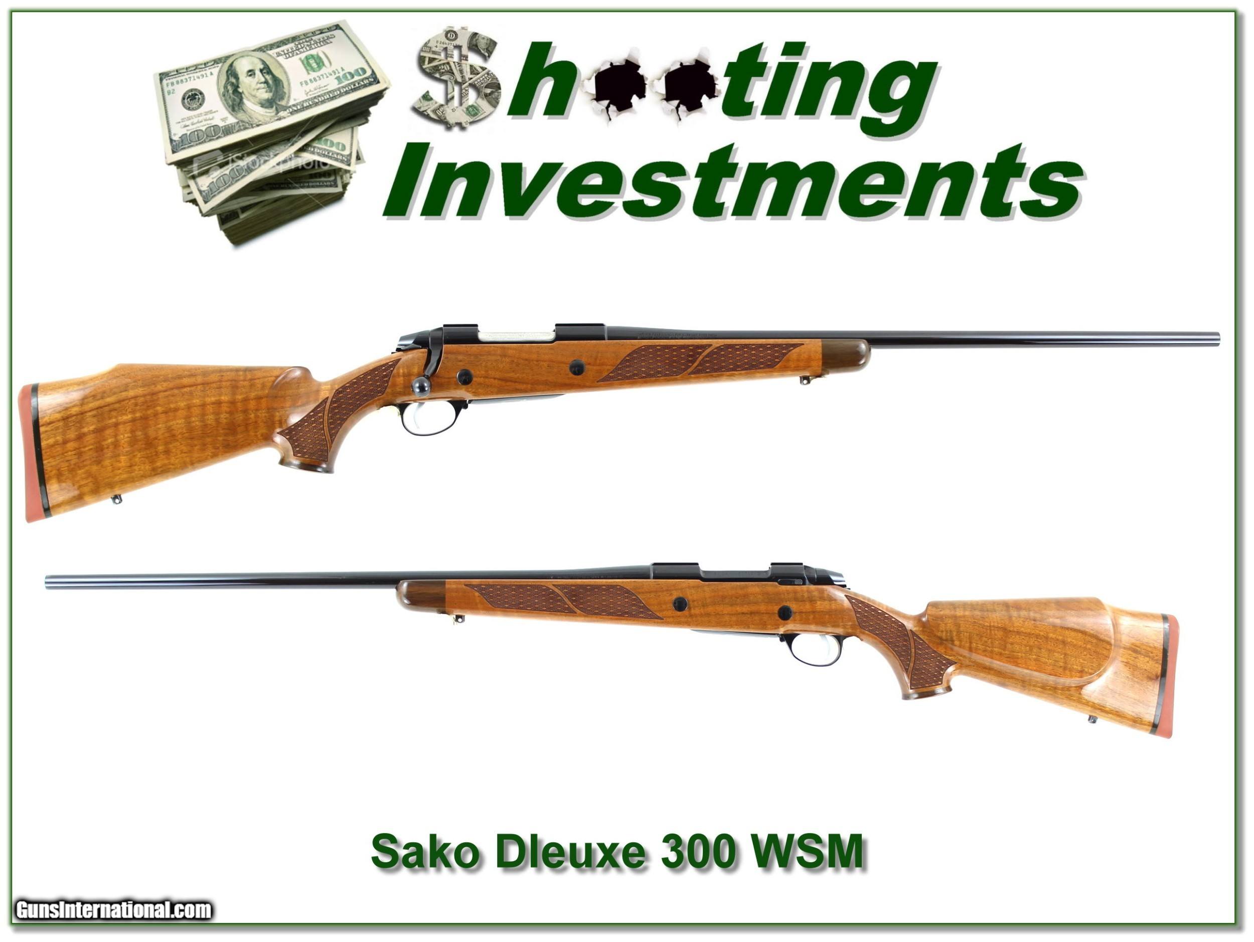 Description: Collectors, shooter and high-end hunters, this is a beautiful Sako Deluxe in the RARE 300 WSM. I believe it is unfired and I find no marks on wood or metal. The wood has outstanding colors and figure. It has a 24in barrel and packs a big punch in the short action 300! You’ll look a long time to find another one. It is a real Shooting Investments! Shipping with insurance is $39. Please email me with any questions or larger pictures. (Consign your quality firearms with Shooting Investments for only 12%! Let me know if you have any you would like to sell!) 20-0685 Payment: Payment is by Money Order, Cashiers Check or Personal Check. I can now also accept Credit Cards (MasterCard, Visa, Discover & American Express) with a 3% convenience fee. Shipping: The shipping charge will be listed in each description. It is $39 for most firearms. Some heavy guns or those insured for over $2000 will be higher. Shipments to Alaska and Hawaii are higher because air shipment is required. Most firearms are shipped on Tuesday and Thursday and usually in 5 days of receipt of payment. We package all shipments carefully and insure them. Optics are shipped Priority Mail and most other non-firearm shipments are shipped First Class. Returns: Our return policy is simple. If for any reason you are not pleased with your purchase, you may return your item for a full refund of purchase price. Ammunition cannot be returned. It is important to us that you are happy. Guns cannot be fired or dissembled before returning them and they must be returned in the same condition as received. Notification of a return must occur with-in 3 days of receipt at your dealer. Shipping, convenience and dealer fees are not refundable and are the responsibility of the buyer. Lay-a-way: If needed, we offer a 60 day lay-a-way option on most firearms. It is 1/3 now, 1/3 in 30 days and 1/3 in 60 days. Lay-a-way firearm sales are final and if not completed the first payment cannot be returned. Consigning your firearms with Shooting Investments: We will help you get top dollar for your firearms. While most local guns shops charge 20% or more, our fee is only 12% with a minimum of $75. At your local gun shop it might take months to sell. Selling on-line provides instant access to thousands of interested buyers. You won’t find any other on-line dealer willing to sell your firearms for only 12% or listing every gun on 3 separate s. Selling through an House typically costs the seller 15% and the buyer an addition 15% (so 30%) and you have to wait several months to sell and longer to receive funds. If properly priced, we will sell your firearms in a few weeks. Send us an email or give us a call and we’ll explain how easy it is for you to get top dollar. Trading: Trading for use is really just buying your gun to re-sell. If you have a gun you want to trade, please email a picture and we will let you know what we can give or it. You will always get more if we sell it for you on consignment. Help for California Buyers: We are happy to ship to California. It is the buyer’s responsibility to make sure any item you buy is legal in your state. We are also happy to help with your purchase of a firearm from someone other than us. If you see a gun you would like to buy but the seller can’t or won’t ship to California they can ship to use and we’ll then ship it to your California dealer. The cost for this service is only $30 + shipping. Let us know if we can help! SOLD |