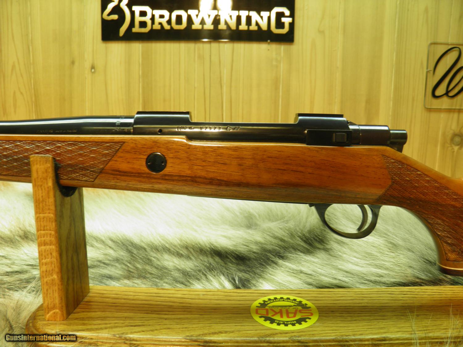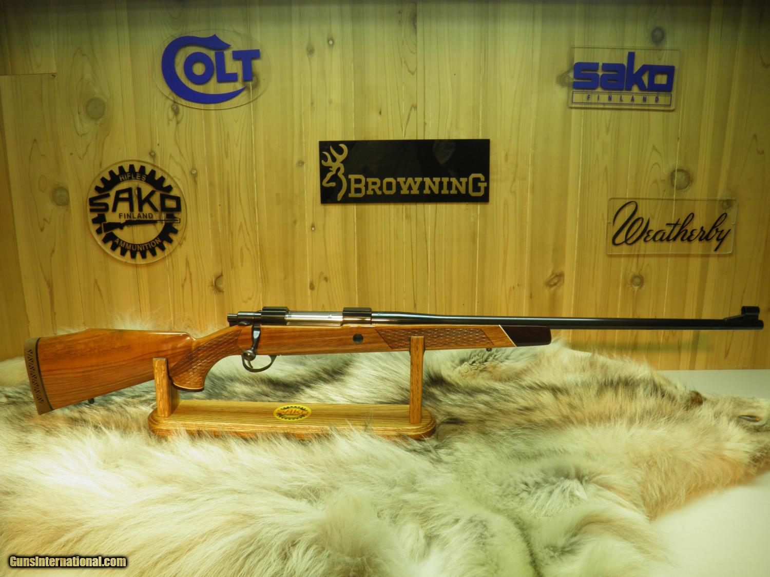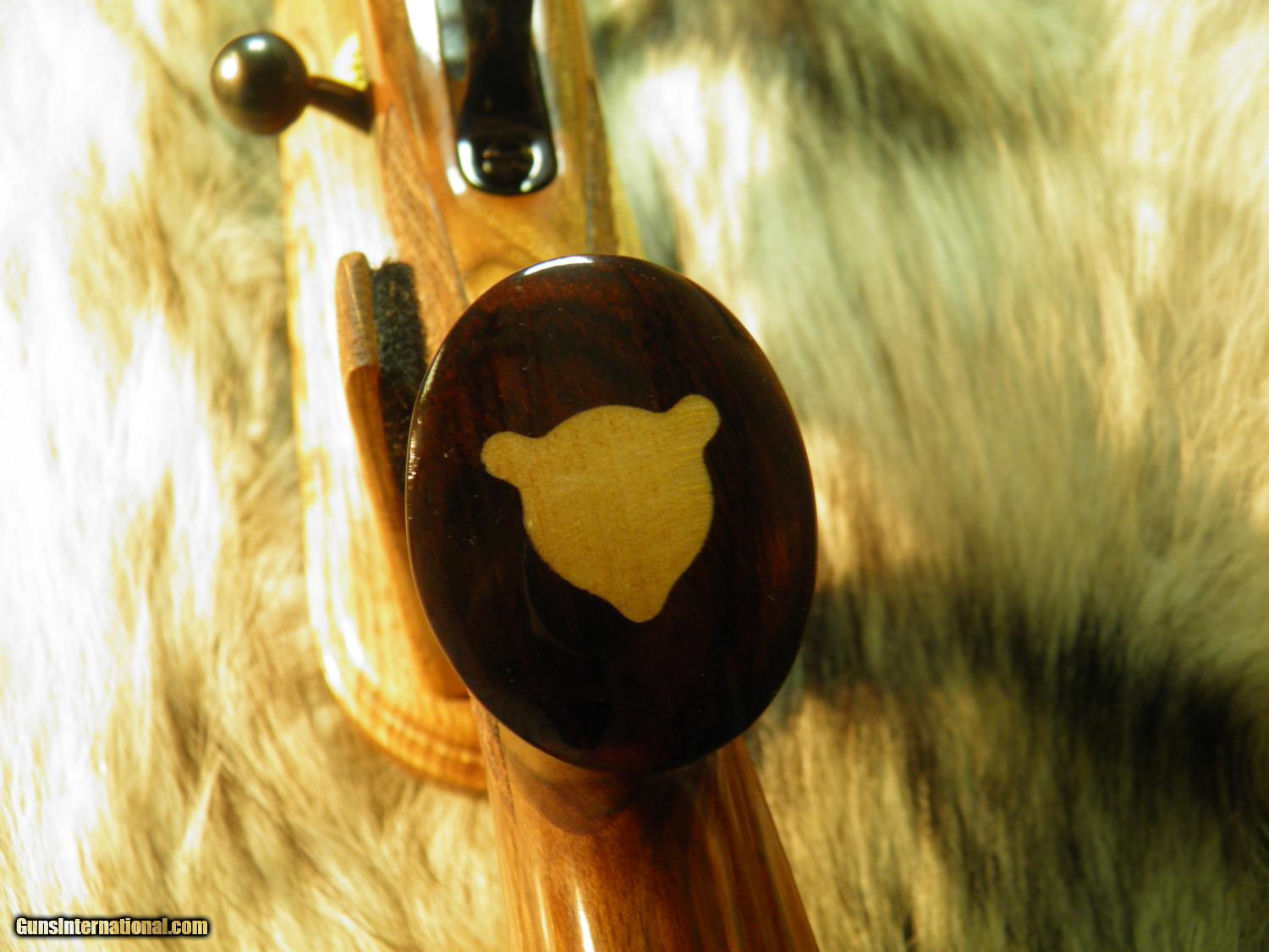 Description: SAKO DELUXE FINNBEAR MODEL L61R, CAL: 25/06 MANF: 1970, BARREL LENGTH 24" WITH A 1 - 10" TWIST, SIGHTS FRONT- RAMPED AND HOODED, OVERALL LENGTH 44 3/4", APPROX: WEIGHT 8 LBS; LENGTH OF PULL 13 1/2", MAGAZINE CAPACITY 4 ROUNDS, CLEAN AND CRISP ADJUSTABLE TRIGGER, WITH SLIDING THUMB SAFTEY, RECEIVER HAS INTEGRAL TAPERED DOVETAIL RAILS, FOR SCOPE RING MOUNTIG, BEAUTIFUL FIGURE EUROPEAN WALNUT, IN THE MONTE-CARLO STYLE CHEECK-PIECE, FORE-END-TIP AND GRIP CAP, FITTED WITH ROSEWOOD WITH WHITE-LINE SPACERS, GRIP CAP HAS A WOOD INLAY , OF A BEARS HEAD, BEAUTIFUL DELUXE GRADE HAND-CUT SKIP-LINE DIAMOND CHECKERING, ATTACHED SWIVELS, WOOD FINISHED IN HIGH GLOSS, TRIGGER GUARD WITH HINDGED FLOOR-PLATE, IS HIGHLIGHTED WITH ENGRAVING , AND SILVER-OVER-LAID, BOLT HAS THE THIRD LOCKING LUG AT THE REAR, BOLT BODY AND BOLT GUIDE, ARE HIGHLY POLISHED, FOR SMOOTH AND EASE OPERATION, REMAINING METAL SURFACES ARE HIGHLY POLISHED AND EXPERTLY BLUED TO PROVIDE THE DEEPEST MOST BRILLIANTY AND LUSTROUS MIRROR BLUE FINISH!! "CONDITION" BLUE AND WOOD 99.5 % +++, COLLECTOR QUALITY+++ POSSIBLE TEST FIRED ONLY!!! SOLD |