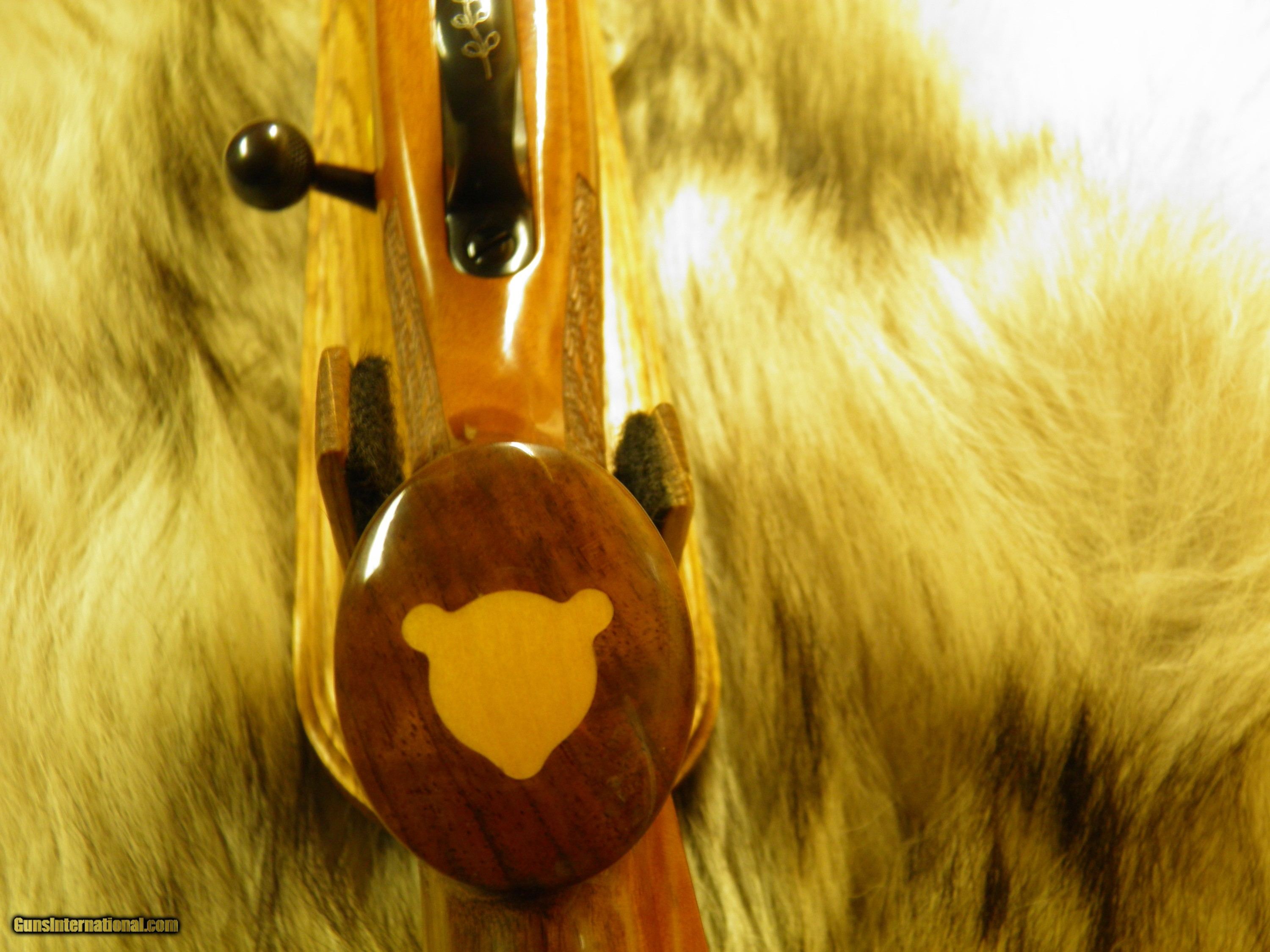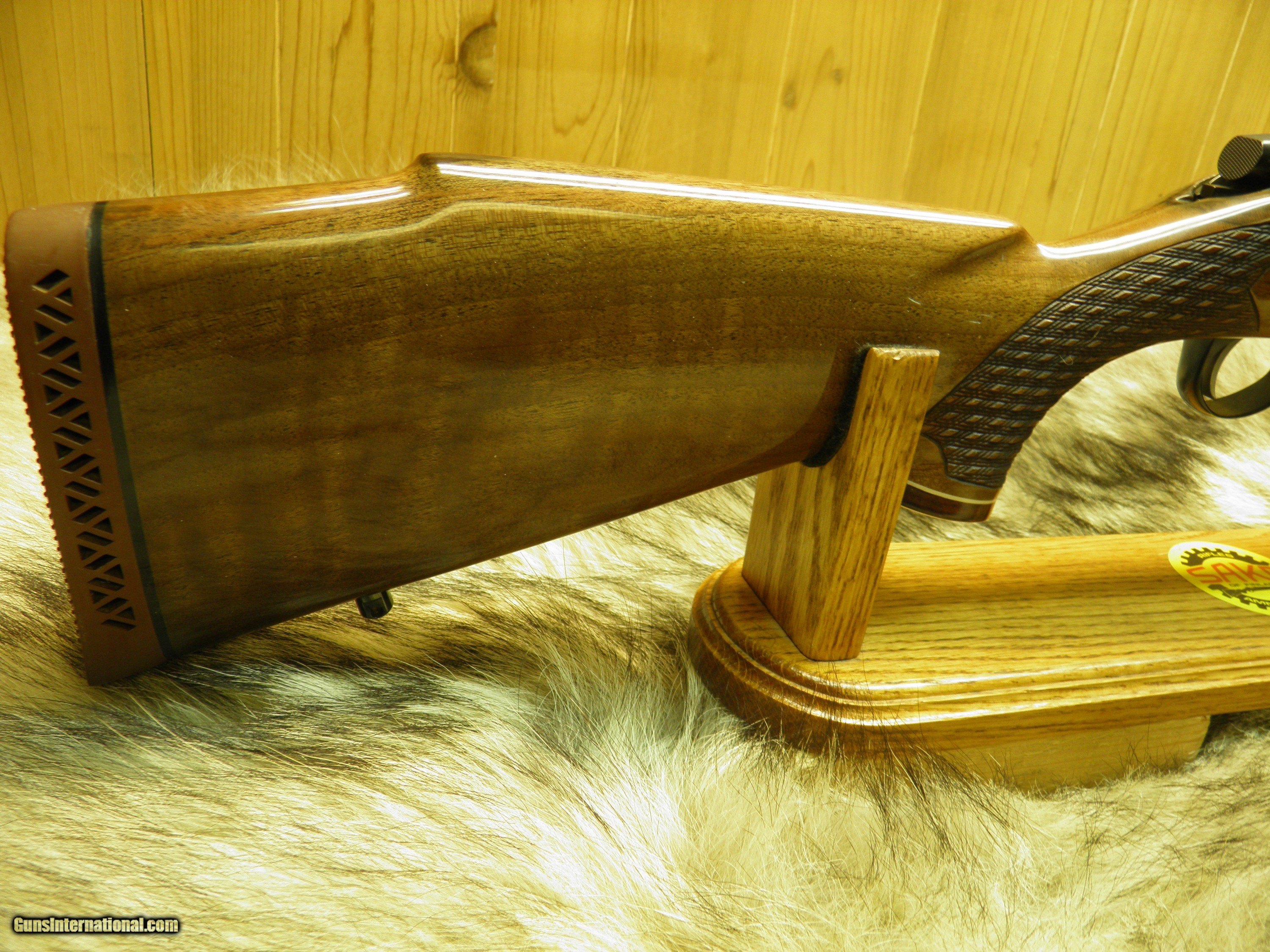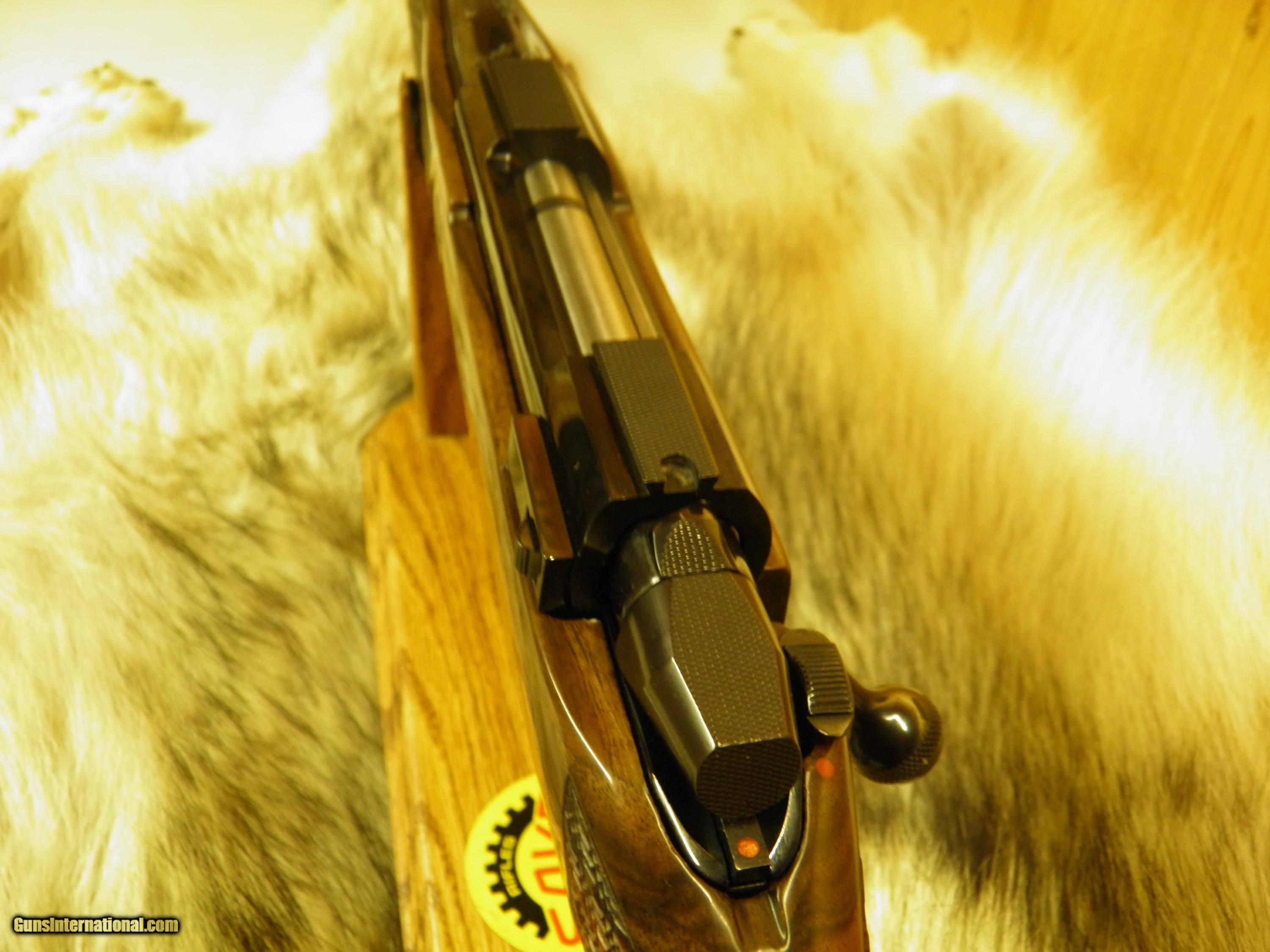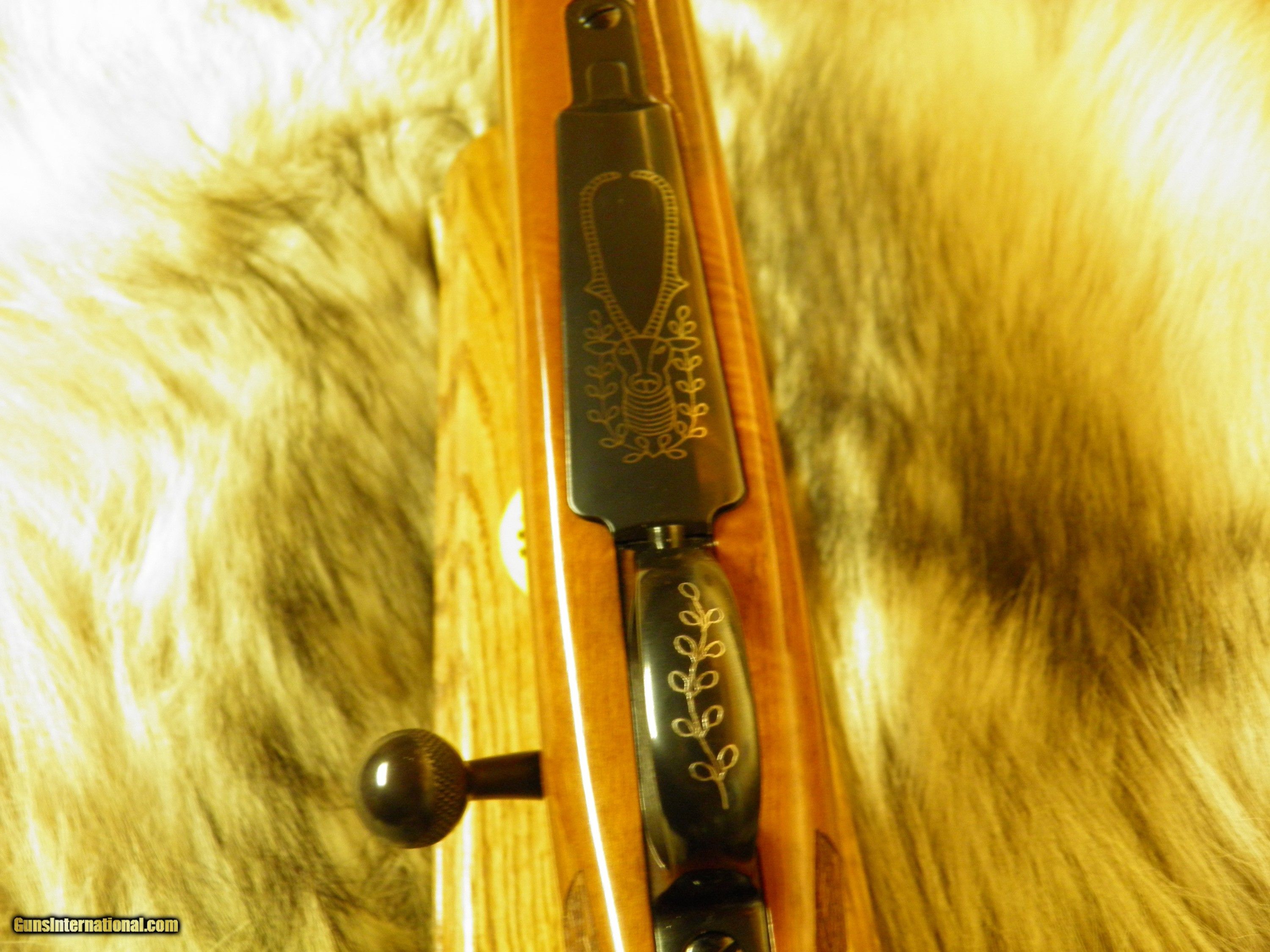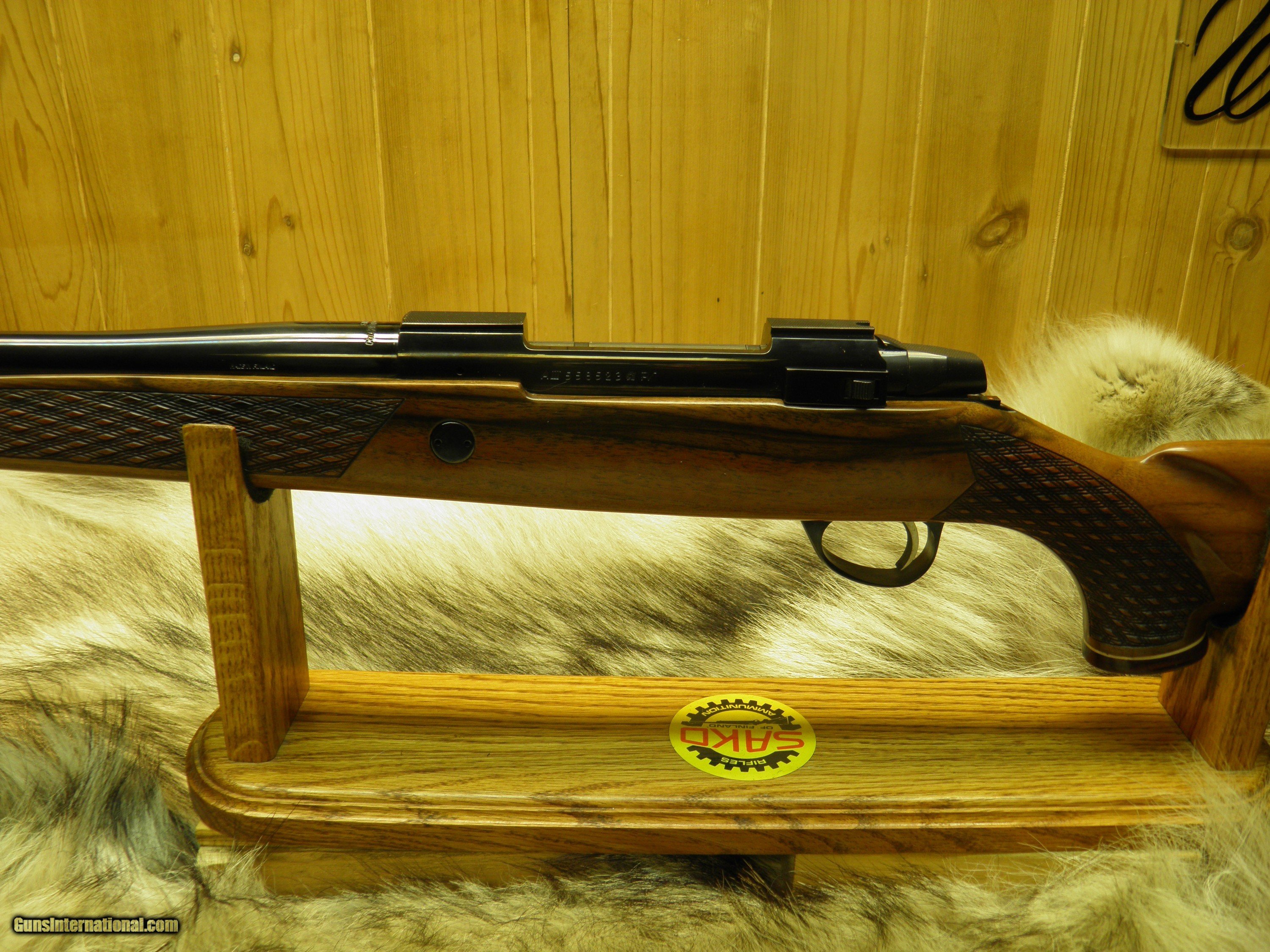 Description: Description: SAKO FINNBEAR DELUXE GRADE, IN 300 WIN. MAG., MANF: 1980, BARREL LENGTH 24" WITH A - 10" TWIST, OVERALL LENGTH 44 3/4", APPROXMENT WEIGHT 8 LBS, LENGTH OF PULL IS 13 3/4",MAGAZINE CAPACITY 4 ROUNDS, CLEAN AND CRISP ADJUSTABLE TRIGGER WITH SLIDING THUMB SAFTEY, INTEGRAL DOVETAIL RAILS FOR SCOPE RING MOUNTING, BOLT AND BOLT GUIDE ARE HIGHLY POLISHED, FOR SMOOTH AND EASE OPERATION OF LOADING AND EXTRACTION, STEEL TRIGGER GUARD WITH HINDGED FLOORPLATE ,THAT ARE HAND ENGRAVED AND SILVER OVER-LAID, BEAUTIFUL BLONDE EUROPEAN WALNUT WITH MONTE- CARLO, CHEEK-PIECE, PALM- SWELL PISTOL GRIP, ROSEWOOD FOREND TIP, AND GRIP CAP WITH BEARS HEAD INLAY, BEAUTIFUL HAND CUT, SKIP LINE DIAMOND CHECKERING, ATTACHED SWIVEL STUDS, STOCK FINISHED IN A HIGH GLOSS POLYURETHANE, METAL SURFACES ARE POLISHED TO A HIGH GLOSS AND EXPERTLY BLUED TO PROVIDE THE DEEPEST MOST BRILLIANTY LUSTROUS MIRROR BLUE FINISH. "CONDITION" NEW AND UNFIRED! "NOTE" WE HAVE THE BIGGEST INVENTORY OF COLLECTOR QUALITY SAKOS IN THE GOOD OLD USA!!! SOLD |