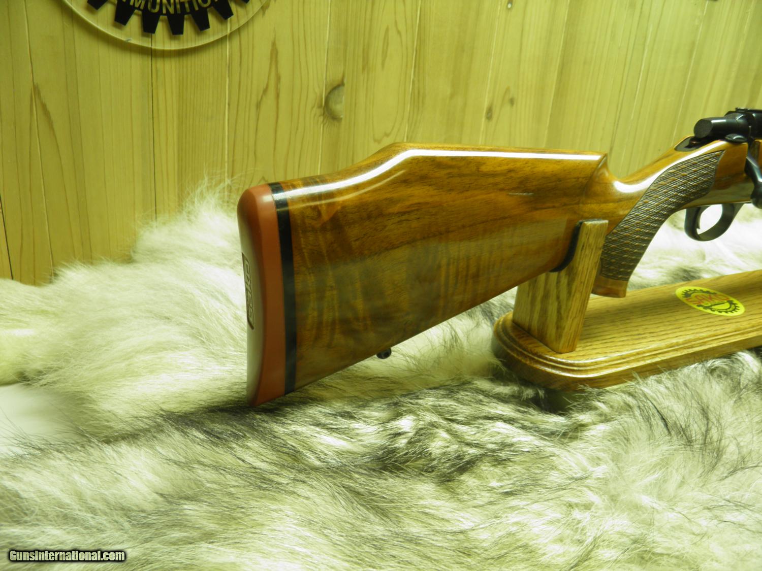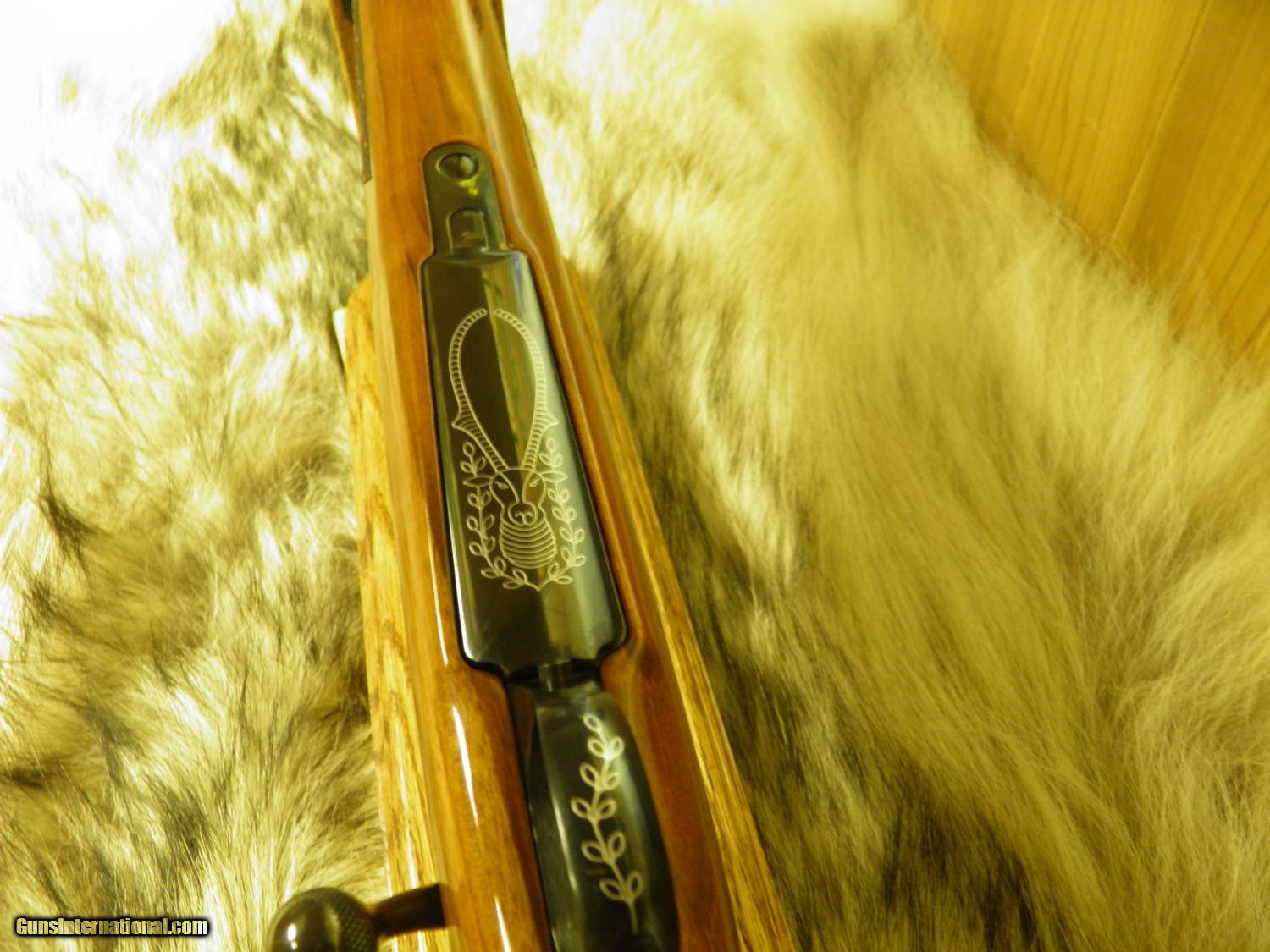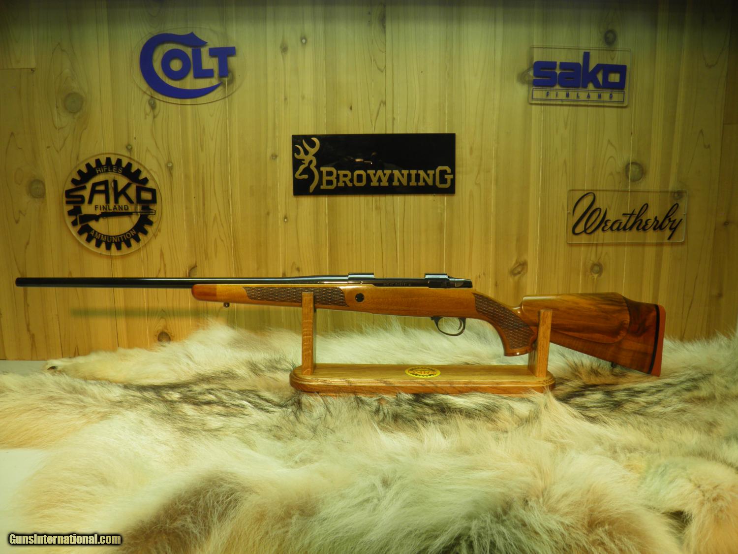 Description: SAKO DELUXE GRADE LIGHTWEIGHT FINNBEAR CAL: 25/06 MFG: 1986, BARREL LENGTH 22 1/2" TWIST 1 - 10", OVERALL LENGTH 43 1/2", APPROX: WEIGHT 7 1/4 LBS, LENGTH OF PULL 14", MAGAZINE CAPACITY 4 ROUNDS, RECEIVER HAS INTEGRAL DOVETAIL RAILS FOR SCOPE RING MOUNTING, CLEAN AND CRISP ADJUSTABLE TRIGGER WITH THUMB SAFTEY, BEAUTIFUL DELUXE GRADE EUROPEAN WALNUT WITH EXOTIC WOOD FOREND TIP AND GRIP CAP WITH BEARS HEAD INLAY, MONTE-CARLO STYLE COMB, WITH CHEECK-PIECE, BEAUTIFUL HAND-CUT SKIP-LINE DIAMOND CUT CHECKERING, ATTACHED SWIVEL STUDS, WOOD FINISHED IN A HIGH QUALITY HIGH GLOSS, BOLT BODY AND GUIDE ARE HIGHLY POLISHED TO A CHROME LIKE FINISH FOR SMOOTH AND EASE OPERATION OF LOADING AND UNLOADING, STEEL TRIGGER AND HINDGED FLOOR PLATE THATS ENGRAVED AND SILVER OVER-LAID, METAL SURFACES ARE HIGHLY POLISHED AND EXPERTLY BLUED TO PROVIDE THE DEEPEST MOST BRILLIANTLY LUSTROUS MIRROR BLUE FINISH!! "CONDITION" BLUEING 99.5%+++, WOOD 99%+++ A COUPLE SMALL LITTLE HANDLING MARKS, BORE IS BRIGHT AND SHINNEY WITH SHARP PRONOUNCED RIFLING, MABEY TEST FIRED?? SOLD |