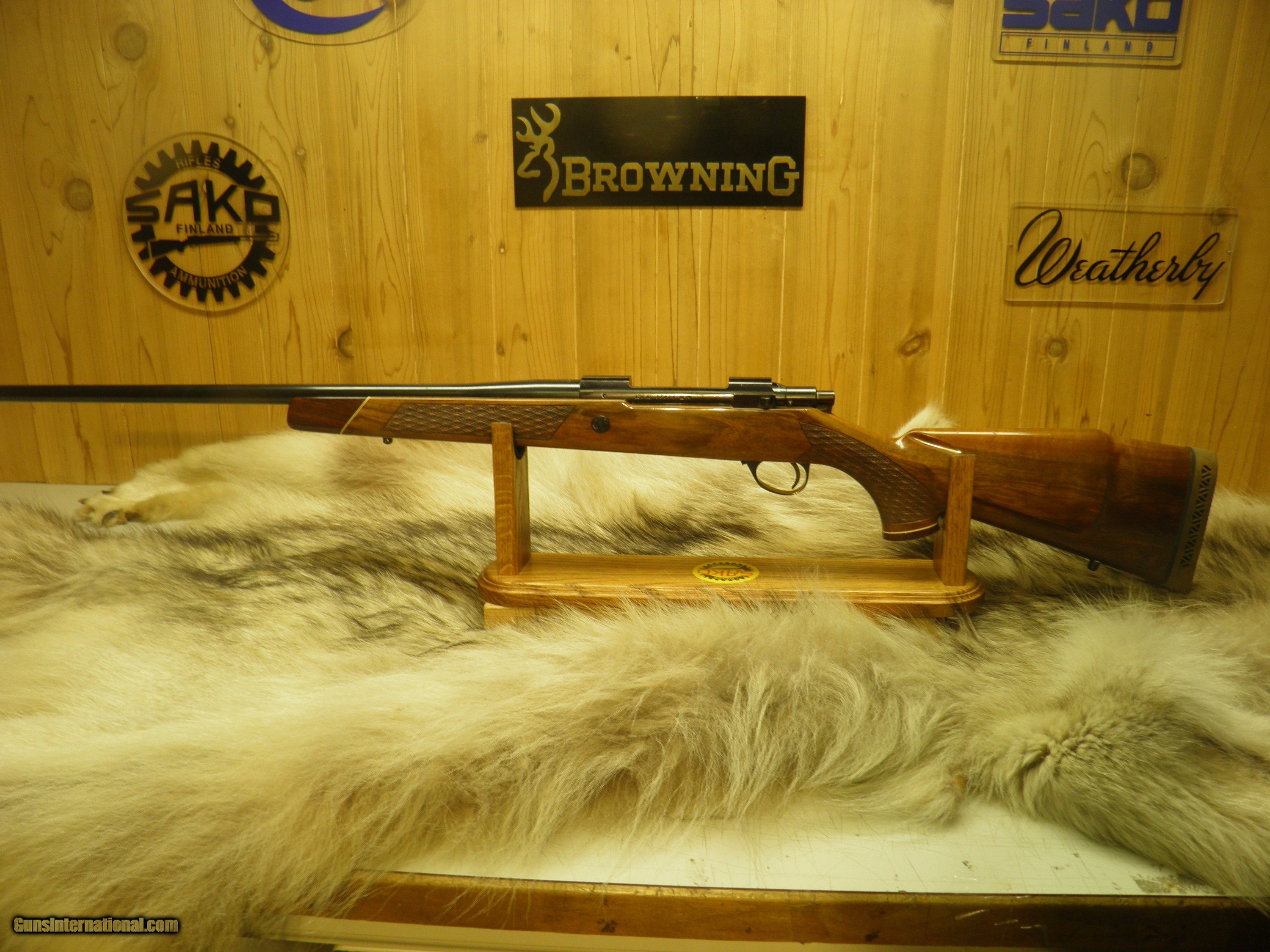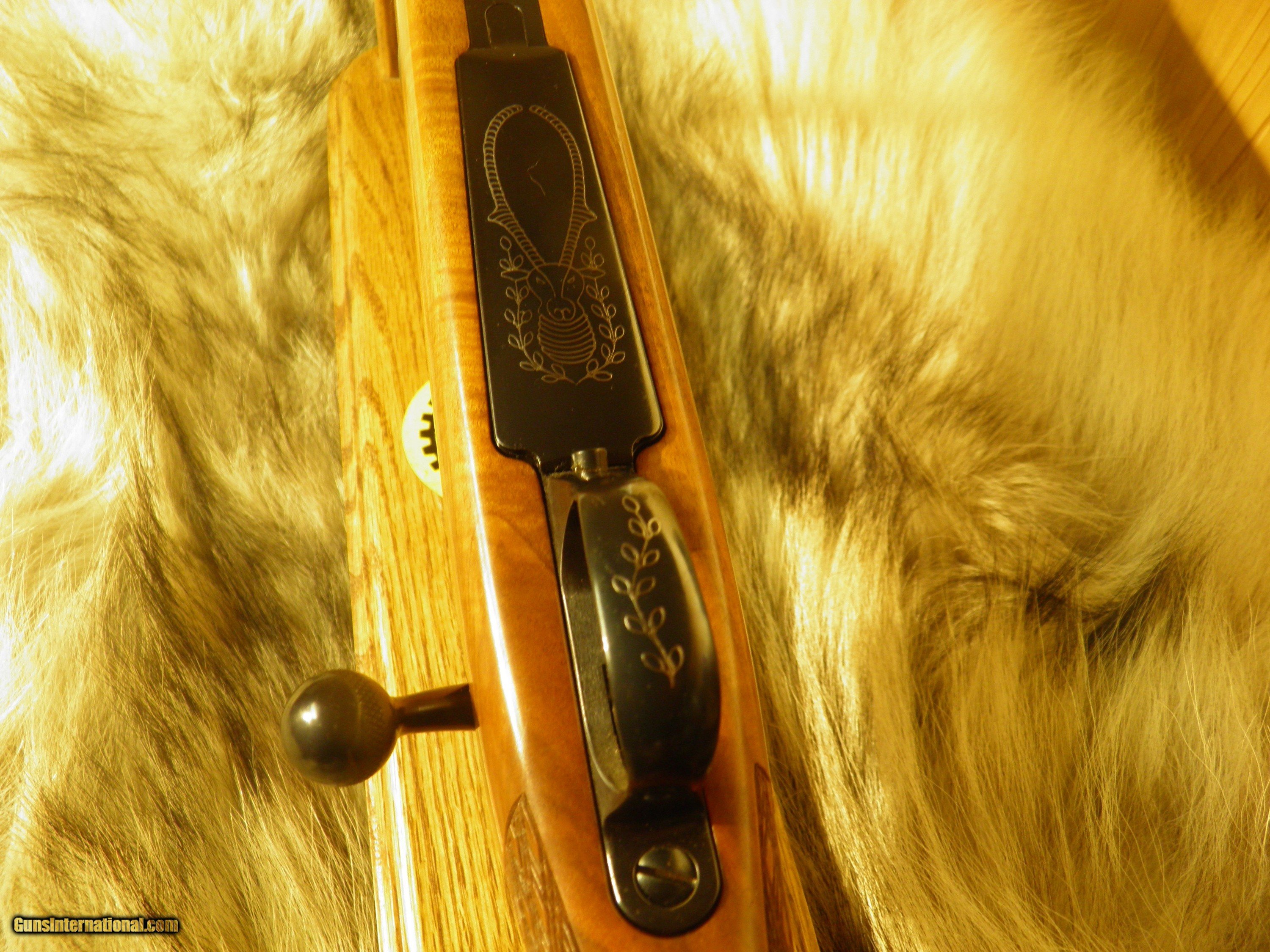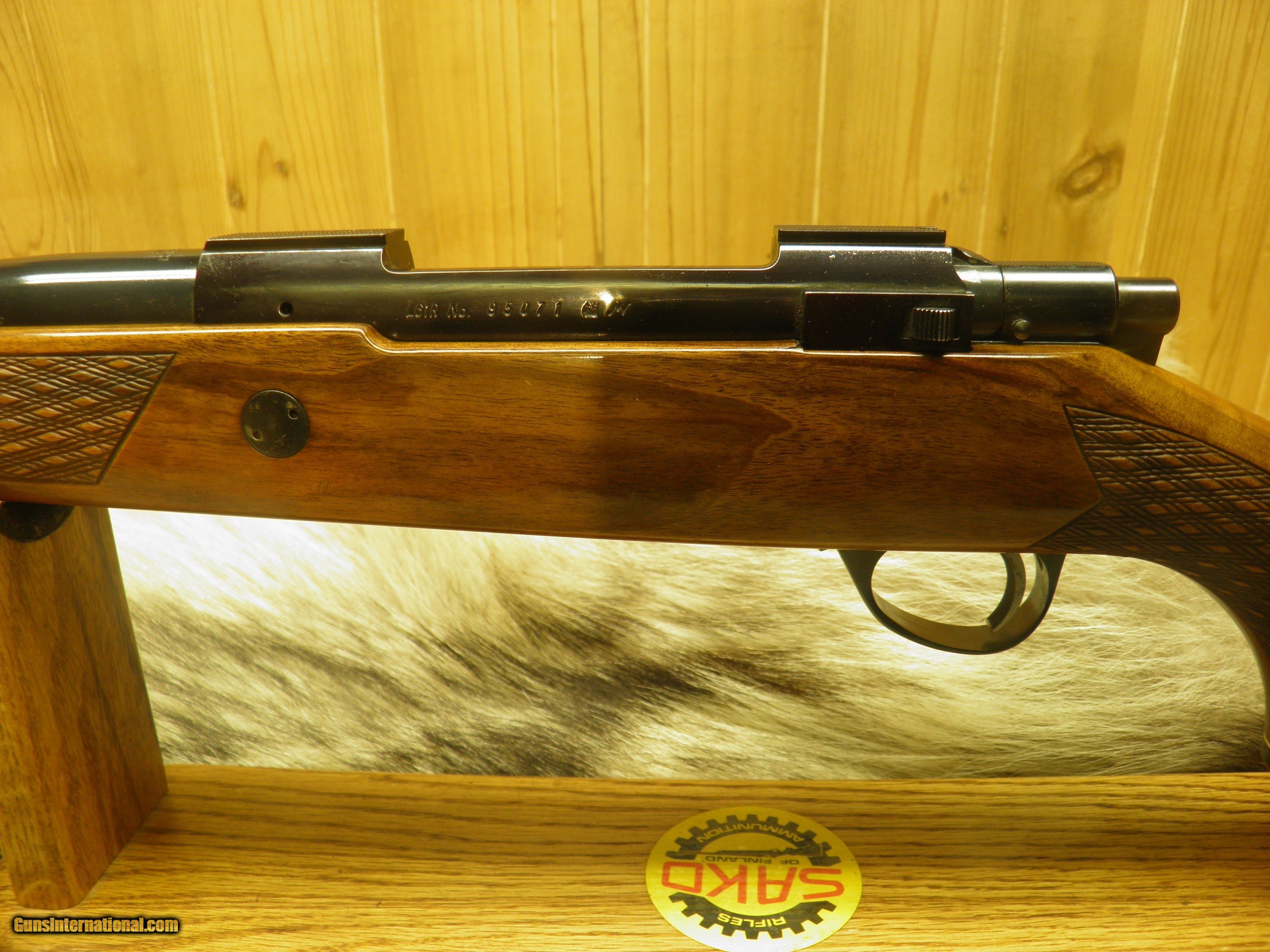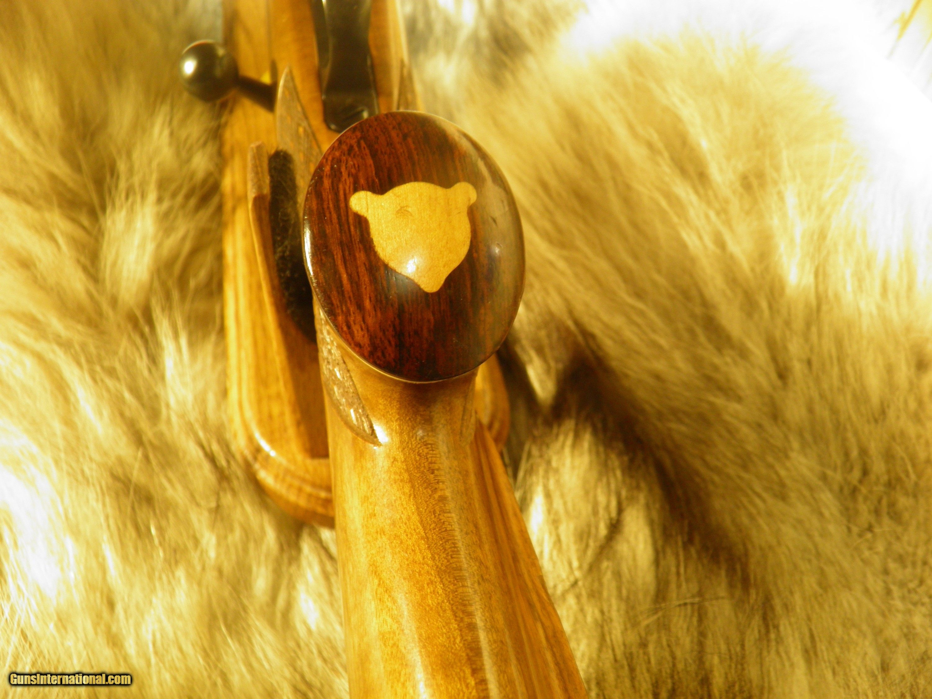 Description: Description: SAKO MODEL FINNBEAR DELUXE GRADE, IN 30-06., MANF: 1974, BARREL LENGTH 24" WITH A - 10" TWIST, OVERALL LENGTH 44 1/2", APPROXMENT WEIGHT 7 1/2 LBS, LENGTH OF PULL IS 13 3/4",MAGAZINE CAPACITY 4 ROUNDS, CLEAN AND CRISP ADJUSTABLE TRIGGER WITH SLIDING THUMB SAFTEY, INTEGRAL DOVETAIL RAILS FOR SCOPE RING MOUNTING, BOLT AND BOLT GUIDE ARE HIGHLY POLISHED, FOR SMOOTH AND EASE OPERATION OF LOADING AND EXTRACTION, STEEL TRIGGER GUARD WITH HINDGED FLOORPLATE ,THAT ARE HAND ENGRAVED AND SILVER OVER-LAID, BEAUTIFUL EUROPEAN WALNUT WITH MONTE- CARLO, CHEEK-PIECE,AND PISTOL GRIP, ROSEWOOD FOREND TIP, AND GRIP CAP WITH BEARS HEAD INLAY, BEAUTIFUL HAND CUT, SKIP LINE DIAMOND CHECKERING, ATTACHED SWIVEL STUDS, STOCK FINISHED IN A GLOSS POLYURETHANE, METAL SURFACES ARE POLISHED TO A HIGH GLOSS AND EXPERTLY BLUED TO PROVIDE THE DEEPEST MOST BRILLIANTY LUSTROUS MIRROR BLUE FINISH. EXCELLENT CONDITION RIFLE HAS SEEN A FEW HUNTS. SOLD |