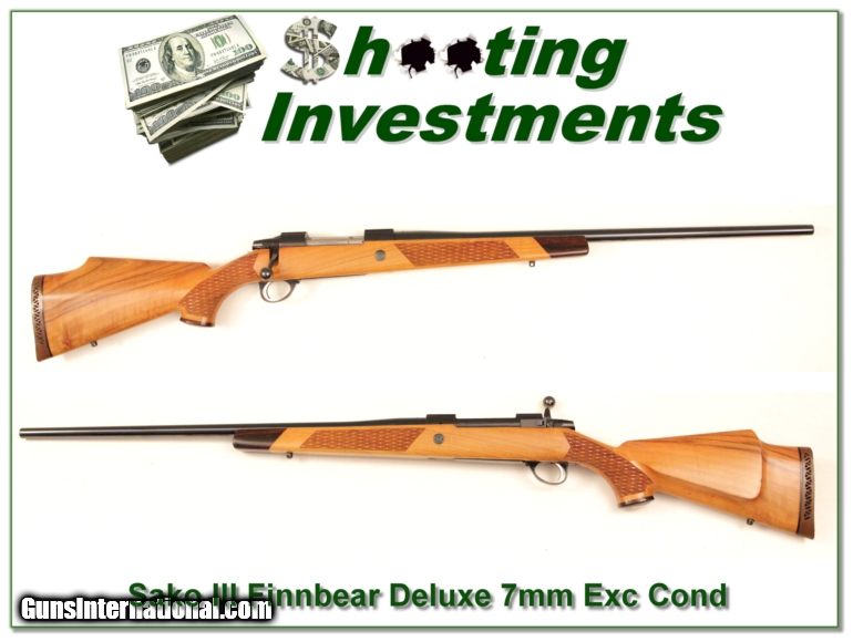 Description: Collectors and hunters, this is a beautiful Sako AIII in 7mm Remington Magnum. It is a Deluxe with blond wood and some dark streaks. It is in excellent condition with only a couple minor marks. It will make a nice addition to your collection or be a high end hunting gun. It is a Shooting Investment. Shipping and insurance is $30 or $18 more if you want it shipped in a new Plano hard case. Please email me with any questions or larger pictures. (I now consign quality firearms only 10%! Let me know if you have any you would like to sell!) [15-0390] Terms & Conditions Payment: Payment is by Money Order, Cashiers Check or Personal Check. I can now also accept MasterCard and Visa with a 3% convenience fee. PayPal can be used for some items but never firearms. Please let us know if you would like to pay via PayPal. Shipping: The shipping charge will be listed in each description. It is $30 for most guns. Some heavy guns or those insured for over $2000 may be higher. Shipments to Alaska and Hawaii are higher because air shipment is required. Most firearms are shipped within 5 days of receipt of payment. We prefer shipping at the beginning of the week to avoid firearms in transit over weekends. We package all shipments carefully and insure them for the full purchase price, rounded up to the next $100. In the unlikely event that damage occurs, it is important that you save all packaging material for the claims process. Optics are shipped Priority Mail and most other non-firearm shipments are shipped First Class. Returns: Our return policy is simple. If for any reason you are not pleased with your purchase, you may return your item for a refund. The only exception is ammunition, it cannot be returned. It is important to us that you are happy. Guns cannot be fired or dissembled before returning them and must be returned in the same condition as received. Notification of a return must occur with-in 3 days of receipt at your dealer. Shipping, convenience and dealer fees are not refundable and are the responsibility of the buyer. Lay-a-way: If needed, we offer a 60 day lay-a-way option on most firearms. It is 1/3 now, 1/3 in 30 days and 1/3 in 60 days. Lay-a-way firearm sales are final. Consigning your firearms with Shooting Investments: We will help you get top dollar for your firearms. While most local guns shops charge 20% or more, our fee is only 10% with a minimum of $50. At your local gun shop it might take months to sell. Selling on-line provides instant access to thousands of interested buyers. You won’t find any other on-line dealer willing to sell your firearms for only 10% or listing every gun on 4 separate s. Selling through an House typically costs 15% and you have to wait several months to sell and longer to receive funds. If properly priced, we will sell your firearms in a week or two. Send us an email or give us a call and we’ll explain how easy it is for you to get top dollar. Trading: We collect guns and usually just trade for guns we want to add to our collections. We often sell guns for others wanting to purchase one of ours. We find this the most fair to both of us. Our Commission is only 10% and we hold the gun you want until yours sells. Please contact us if you want to sell one of yours to buy one of ours. Help for California Buyers: We are happy to ship to California. It is the buyer’s responsibility to make sure any item you buy is legal in your state. We are also happy to help with your purchase of a firearm from someone other than us. If you see a gun you would like to buy but the seller can’t or won’t ship to California we can help. You buy the gun and have it shipped to us. We’ll then ship it to your California dealer. The cost for this service is only $30 + shipping. Let me know if we can help! SOLD |