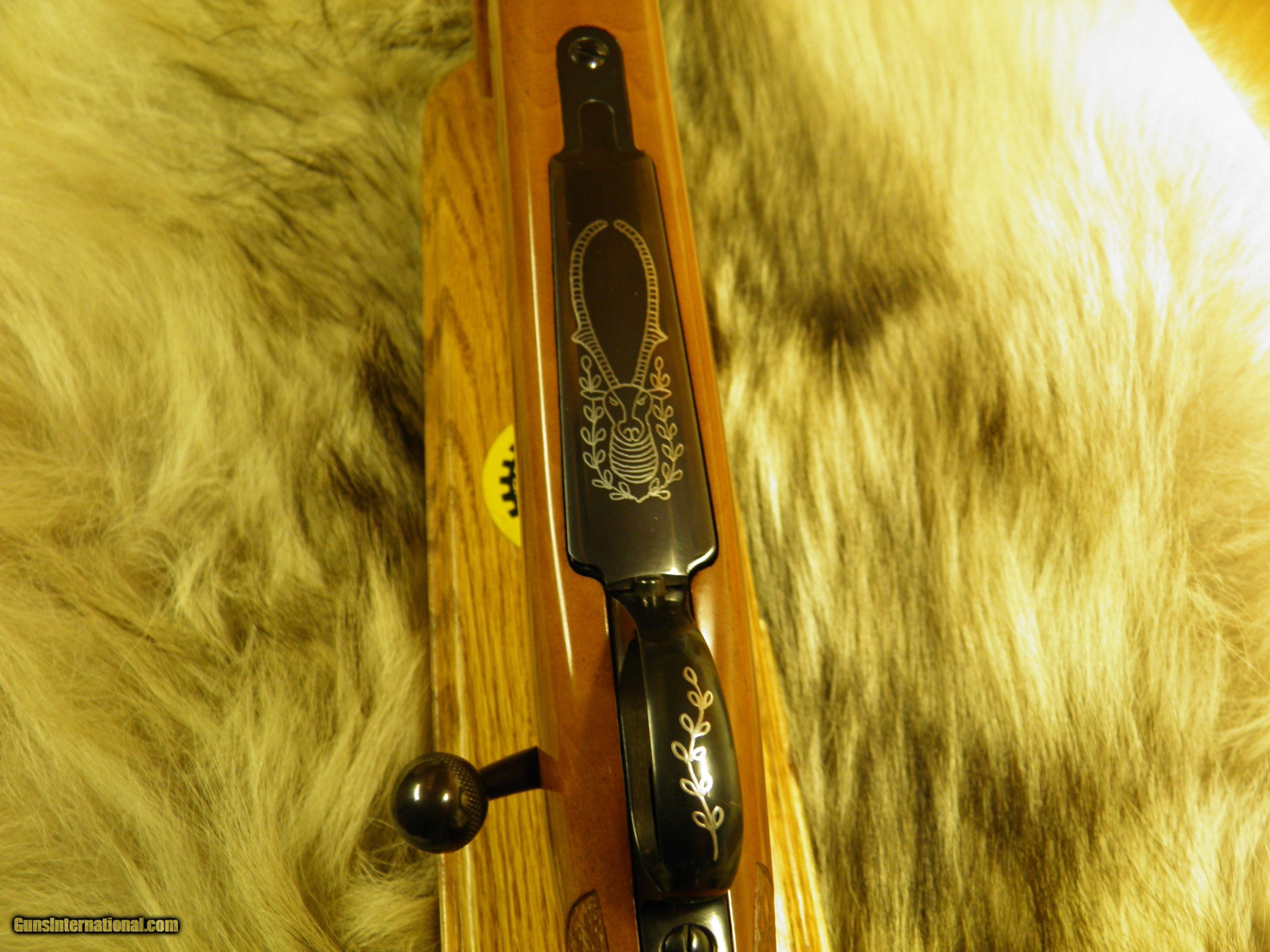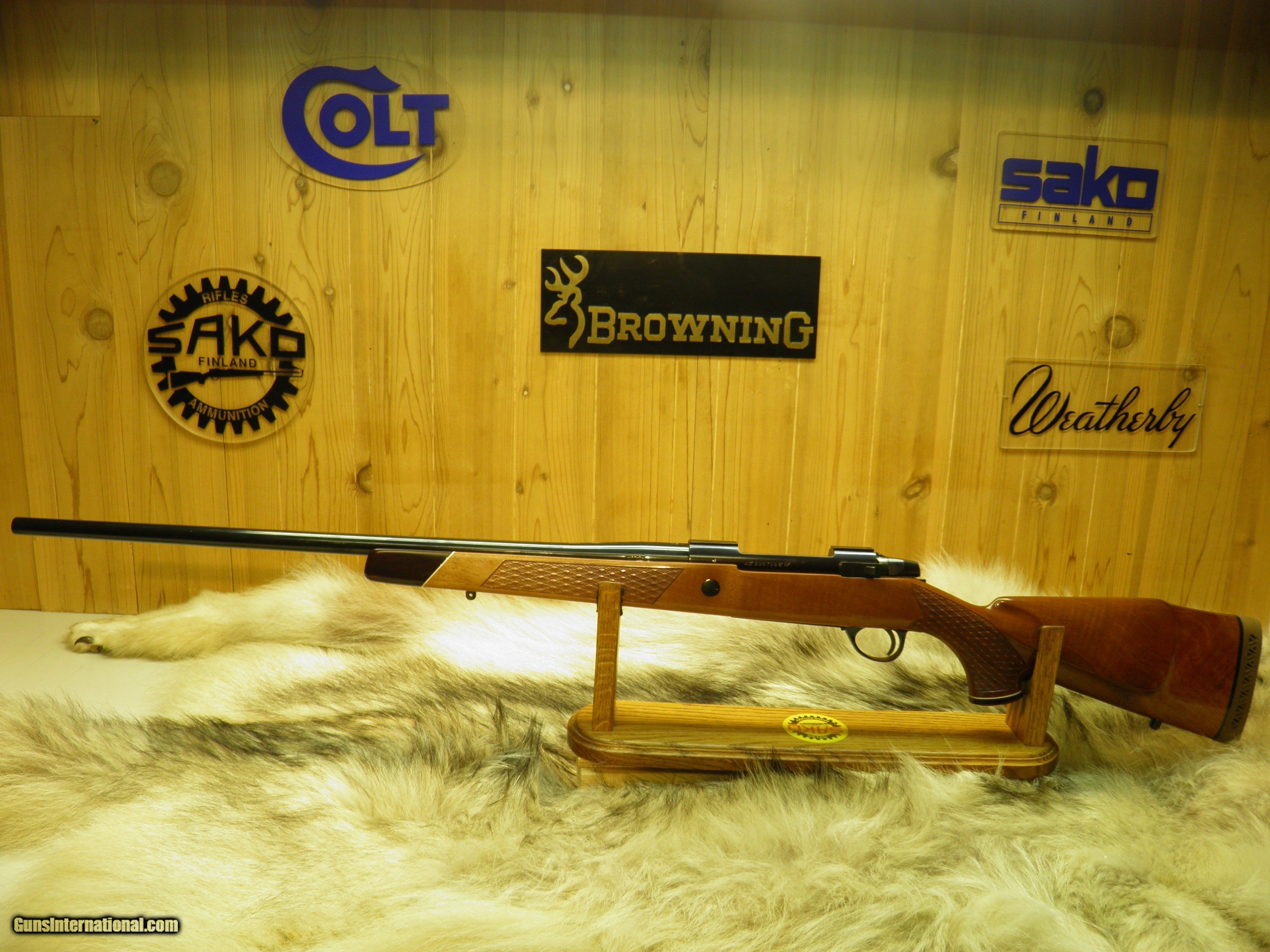 Description: SAKO FINNBEAR DELUXE GRADE CAL 270, MANF 1979 , BARREL LENGTH 24", WITH A 1 - 10" TWIST, LENGTH OF PULL 13 3/4" OVERALL LENGTH 43 3/4", APPROX: WEIGHT 8 LBS. MAGAZINE CAPACITY 5 ROUNDS, CLEAN AND CRISP ADJUSTABLE TRIGGER, WITH SLIDING THUMB SAFTEY, RECEIVER HAS INTEGRAL DOVE TAIL RAILS FOR SCOPE RING MOUNTING, NICE FIGURED EUROPEAN WALNUT, MONTE-CARLO STYLE STOCK WITH PISTOL GRIP AND , CHEECK-PIECE, BEAUTIFUL ROSEWOOD FOREND TIP AND GRIP CAP WITH BEARS HEAD INLAY, BEAUTIFUL HAND-CUT SKIP-LINE DIAMOND CUT CHECKERING, FINISHED IN A DURABLE HIGH GLOSS, ATTCHED SWIVEL STUDS, DELUXE RECOIL PAD, BOLT BODY AND GUIDE ARE HIGHLY POLISHED FOR SMOOTH AND EASE OPERATION, ELEGANT ENGRAVING ON TRIGGER GUARD AND FLOOR PLATE WHICH ARE SILVER OVER-LAID , FLOOR PLATE ON GUARD IS HINDGED, WHICH MAKE FOR QUICK UNLOADING ,ALL METAL SURFACES ARE HIGHLY POLISHED AND EXPERTLY BLUED, TO PROVIDE THE DEEPEST MOST BRILLIANTY LUSTROUS FINISH "CONDITION" BLUE 99% WOOD 99.5% APPEARS TO BE UNFIRED! "NOTE" WE HAVE THE BIGGEST INVENTORY OF COLLECTOR QUALITY SAKOS IN THE GOOD OLD USA!! SOLD |