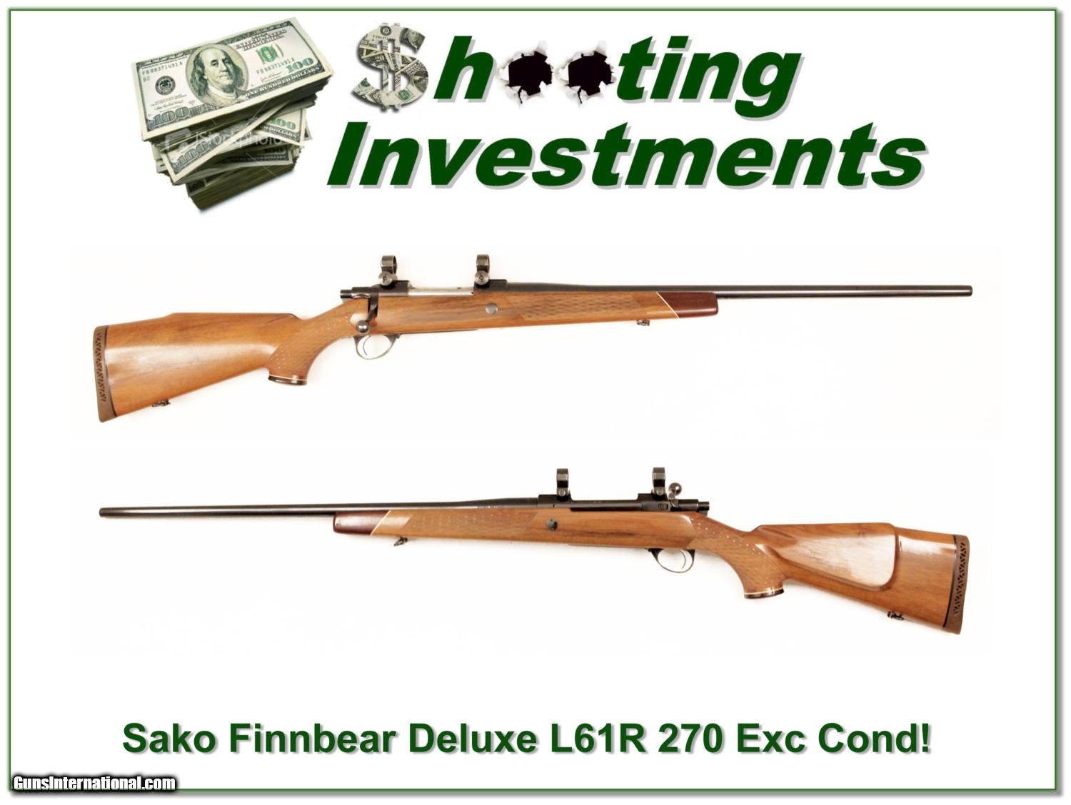 Description: Collectors and hunters, this is a Sako Deluxe L61R in 270 Winchester. It is in excellent collector condition and I am sure never fired more than a few rounds. I see no marks of note. It will make a nice addition to your collection and is a Shooting Investment. That means you can expect it to increase in value over time. Shipping and insurance is $30 or $18 more if you want it shipped in a new Plano hard case. Please email me with any questions or larger pictures. (I now consign quality firearms only 10%! Let me know if you have any you would like to sell!) [15-0777] Payment: Payment is by Money Order, Cashiers Check or Personal Check. I can now also accept MasterCard and Visa with a 3% convenience fee. PayPal can be used for some items but never firearms. Please let us know if you would like to pay via PayPal. Shipping: The shipping charge will be listed in each description. It is $30 for most guns. Some heavy guns or those insured for over $2000 may be higher. Shipments to Alaska and Hawaii are higher because air shipment is required. Most firearms are shipped within 5 days of receipt of payment. We prefer shipping at the beginning of the week to avoid firearms in transit over weekends. We package all shipments carefully and insure them for the full purchase price, rounded up to the next $100. In the unlikely event that damage occurs, it is important that you save all packaging material for the claims process. Optics are shipped Priority Mail and most other non-firearm shipments are shipped First Class. Returns: Our return policy is simple. If for any reason you are not pleased with your purchase, you may return your item for a refund. The only exception is ammunition, it cannot be returned. It is important to us that you are happy. Guns cannot be fired or dissembled before returning them and must be returned in the same condition as received. Notification of a return must occur with-in 3 days of receipt at your dealer. Shipping, convenience and dealer fees are not refundable and are the responsibility of the buyer. Lay-a-way: If needed, we offer a 60 day lay-a-way option on most firearms. It is 1/3 now, 1/3 in 30 days and 1/3 in 60 days. Lay-a-way firearm sales are final. Consigning your firearms with Shooting Investments: We will help you get top dollar for your firearms. While most local guns shops charge 20% or more, our fee is only 10% with a minimum of $50. At your local gun shop it might take months to sell. Selling on-line provides instant access to thousands of interested buyers. You won’t find any other on-line dealer willing to sell your firearms for only 10% or listing every gun on 4 separate s. Selling through an House typically costs the seller 15% and the buyer an addition 15% (so 30%) and you have to wait several months to sell and longer to receive funds. If properly priced, we will sell your firearms in a week or two. Send us an email or give us a call and we’ll explain how easy it is for you to get top dollar. Trading: We collect guns and usually just trade for guns we want to add to our collections. We often sell guns for others wanting to purchase one of ours. We find this the most fair to both of us. Our Commission is only 10% and we hold the gun you want until yours sells. Please contact us if you want to sell one of yours to buy one of ours. Help for California Buyers: We are happy to ship to California. It is the buyer’s responsibility to make sure any item you buy is legal in your state. We are also happy to help with your purchase of a firearm from someone other than us. If you see a gun you would like to buy but the seller can’t or won’t ship to California we can help. You buy the gun and have it shipped to us. We’ll then ship it to your California dealer. The cost for this service is only $30 + shipping. Let me know if we can help! SOLD |