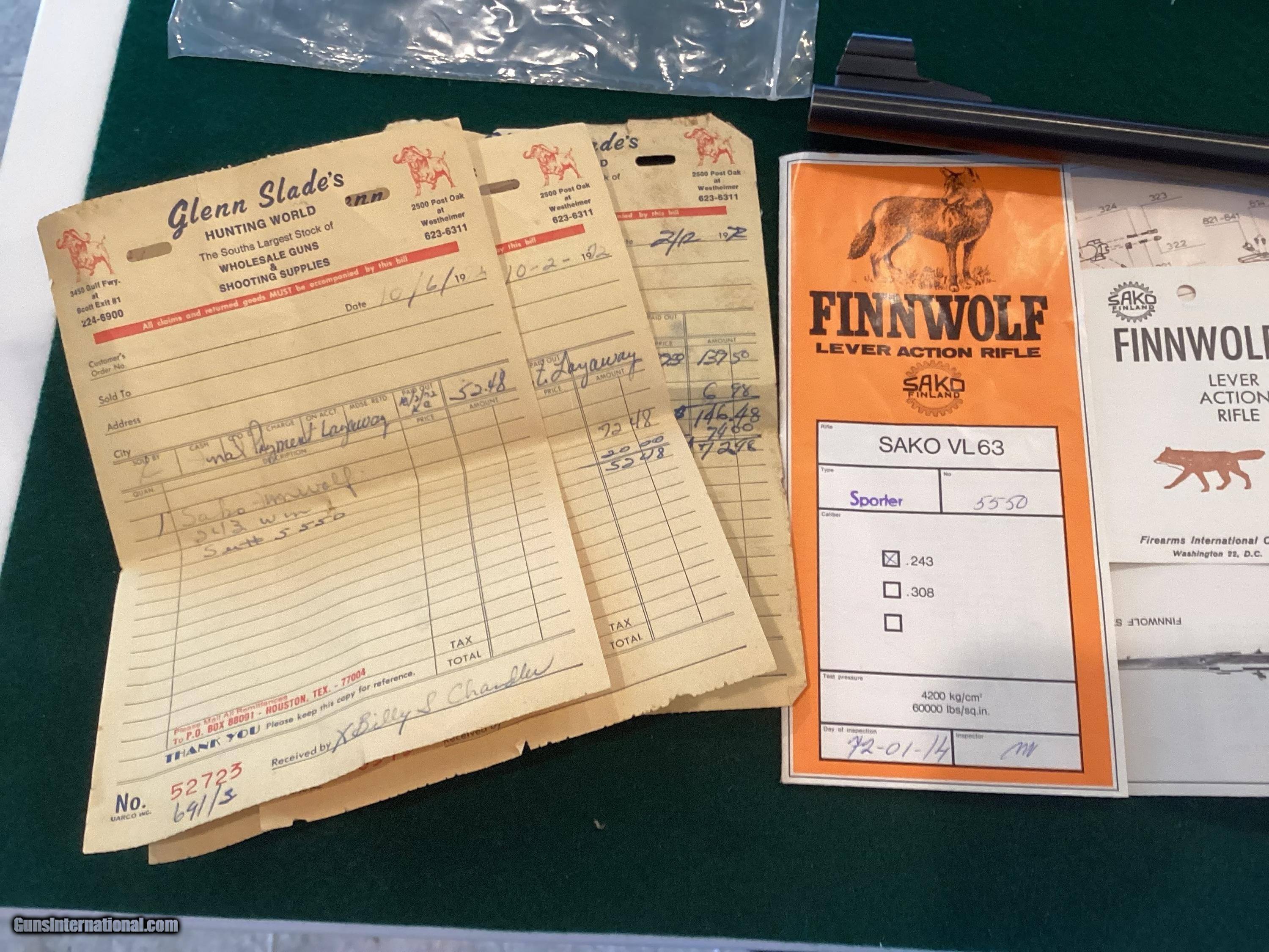 Description: This Sako Finnwolf was purchased new by my father in 1972. We have the receipt and papers as pictured. This gun is 95 percent with the only deficit being shown on the butt plate as pictured. It is equipped with a Redfield 6 power wide view scope that has been on the gun since 1972. The gun has not been fired in the last 30 years, so it is time to let it go Shipping will be UPS ground and insured for actual cost to your FFL dealer. SOLD Rifle Caliber: .243 Winchester Manufacturer: Sako Model: Finnwolf Serial Number: 5550 Condition: Excellent Metal Condition: Excellent Wood Condition: Excellent Bore Condition: Excellent Action: Lever Manufacture Date: 1971 |