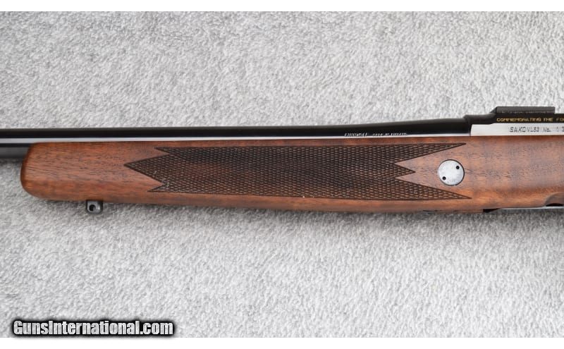 Description: This Sako Commemorates the Founding of the Sako Collectors Association 1982. This gun is number 108 of that 175 manufactured, and can be paired with the .243 Win. SKU 3623787. This gun is excellent overall condition and appears unfired. Gun is complete with original box, paperwork and hang-tag. This is a beautiful gun! .308 Winchester SOLD Metal Condition: Excellent Wood Condition: Excellent Bore Condition: Excellent Barrels: 22 Triggers: Factory Stock Dimensions: 14" LOP Fore End: Checkered Walnut Pistol Grip - Checkered Walnut Forend Butt Pad: Sako Black Synthetic Weight: 7 3/4 lb. Sights: Hooded Post & Bead Front - Integral Scope Mount Rear Item Location: Wheeling |