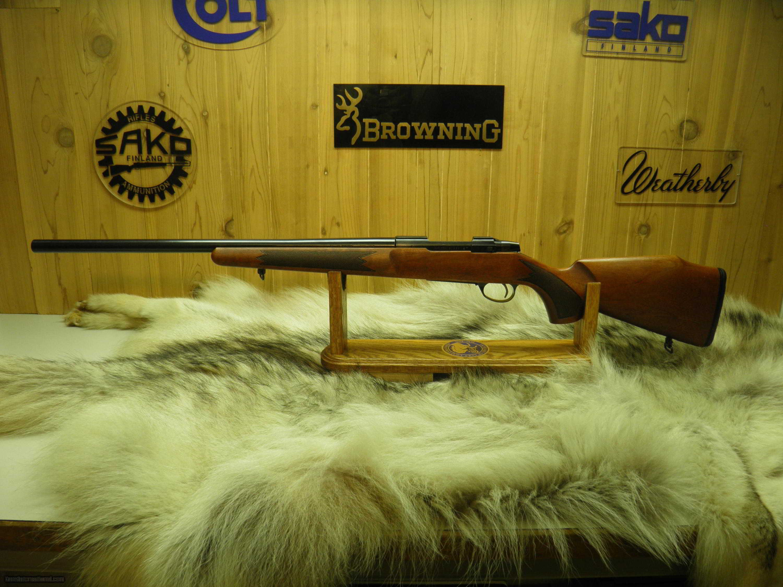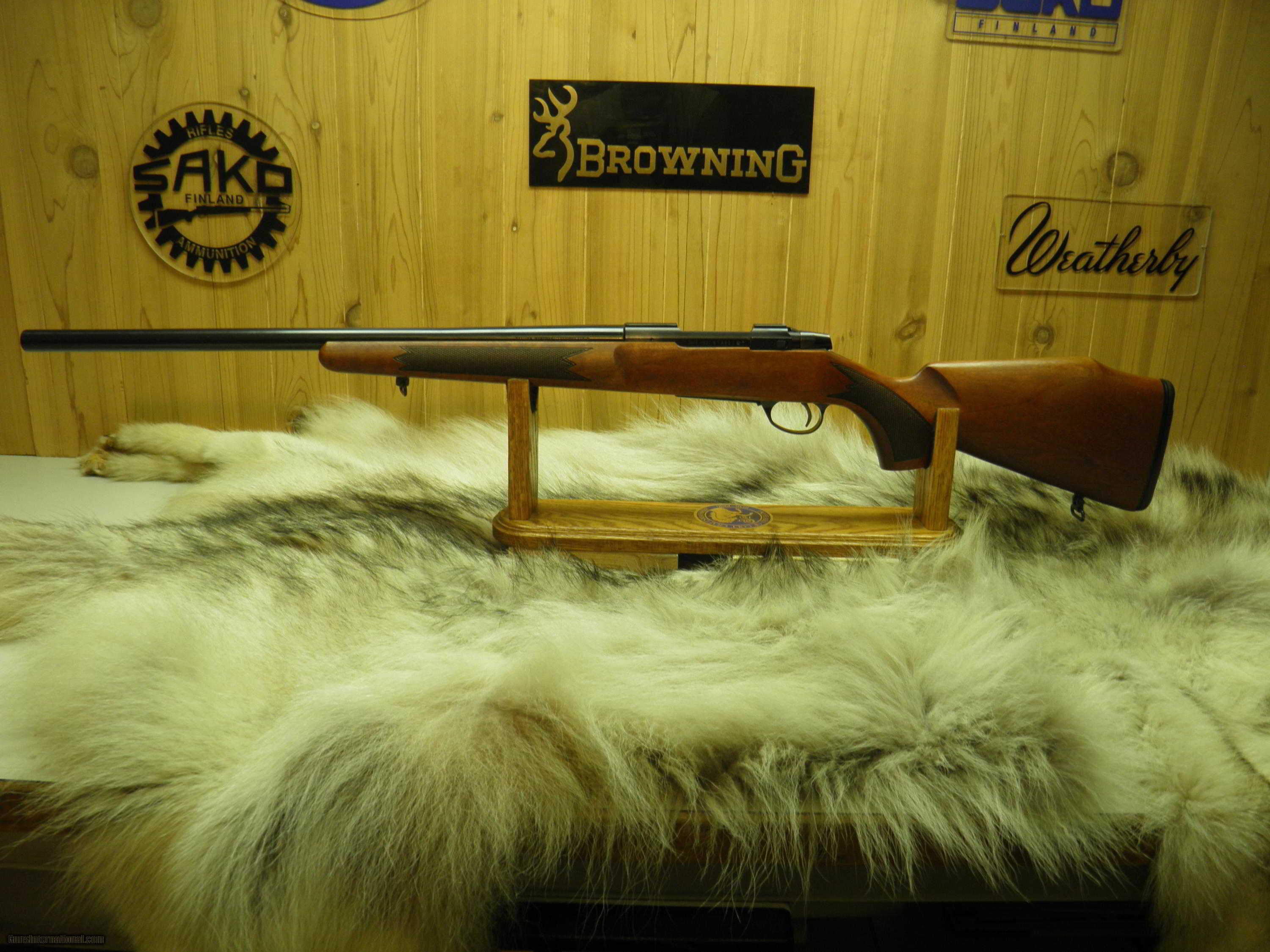 Description: SAKO MODEL 591 FORESTER BENCHREST/ TARGET RIFLE CAL: 22/250, MFG: 1992, BARREL LENGTH 24" HEAVY WEIGHT, WITH A 1-14" TWIST, MUZZEL OD 7/8", OVERALL LENGTH 43", APPROX: WEIGHT 8 1/2 LBS, LENGTH OF PULL 13 1/2" BENCHREST STYLE ACTION WITH STEEL TRIGGER GUARD AND FLOOR PLATE MAGAZINE HOLDS FOUR ROUNDS , BOLT BODY AND GUIDE ARE HIGHLY POLISHED FOR SMOOTH AND EASE OPERATION HAS DOVETAIL INTEGRAL SCOPE RAILS FOR SCOPE RING MOUNTING, TRIGGER ADJUSTABLE WITH SLIDING THUMB SAFTEY, EUROPEAN WALNUT SPECIFICALLY DESIGNED WITH A PRONE-TYPE STOCK FOR SHOOTING FROM THE BENCH OR GROUND, THE FOREND IS EXTRA WIDE TO PROVIDE ADDED STEADINESS WHEN RESTED ON SANDBAGS OR BIPOD, STOCK FINISHED IN A HAND -RUBBED OIL , QUICK REMOVALABLE PUSH BUTTON FRONT SLING SWIVEL, FACTORY FREE-FLOATED BARREL, ALL THIS ADDS UP TO A WELL-BALANCED ACCURATE RIFLE ! "CONDITION" BLUE 99.5%+++, WOOD 99.5%+++ A COUPLE VERY TINY HANDLING MARKS, BORE IS BRIGHT AND SHINNEY WITH SHARP PRONOUNCED RIFLING, BOLT FRESH AND CLEAN, LOOKS TO BE UNFIRED!. SOLD |