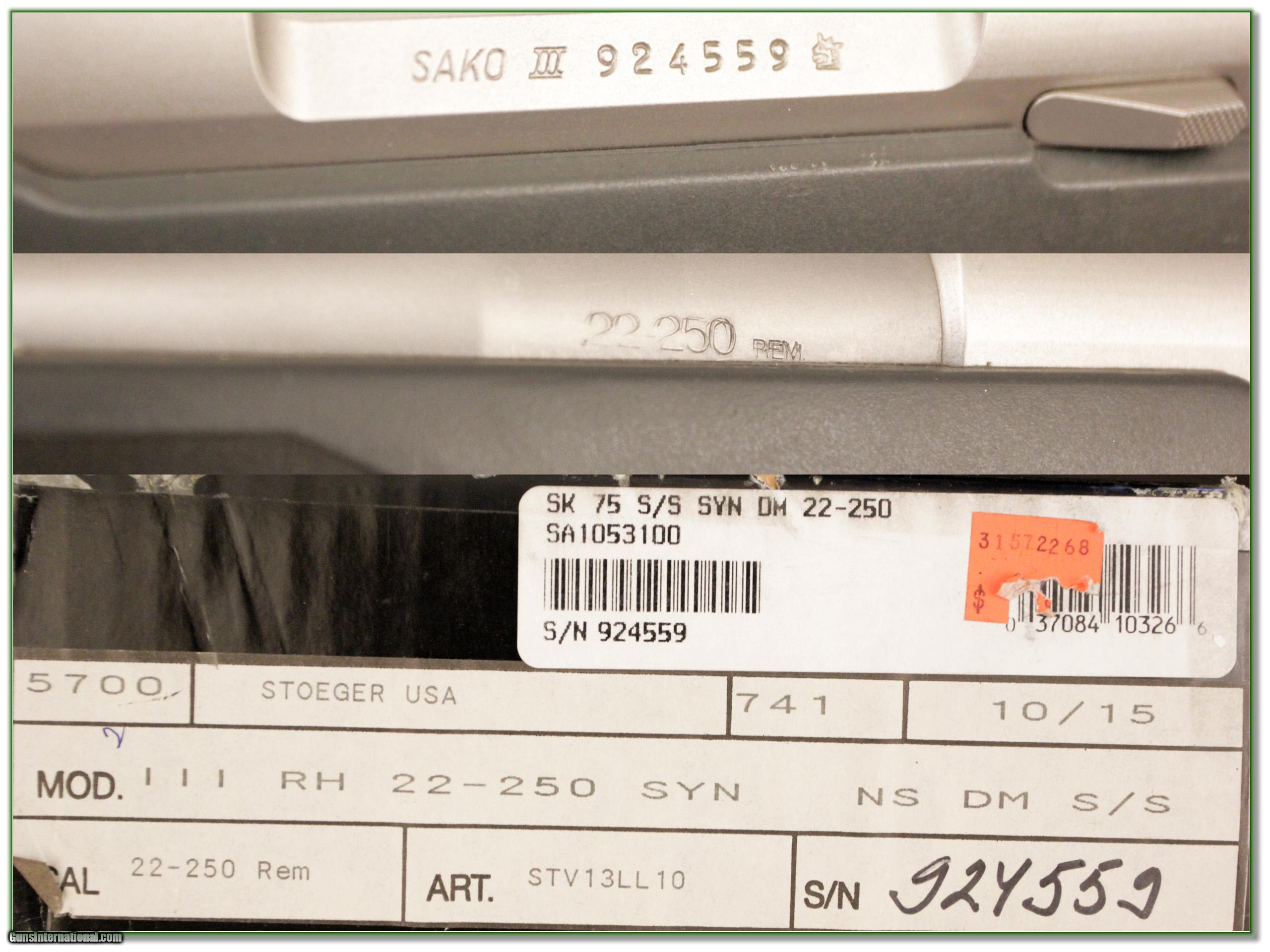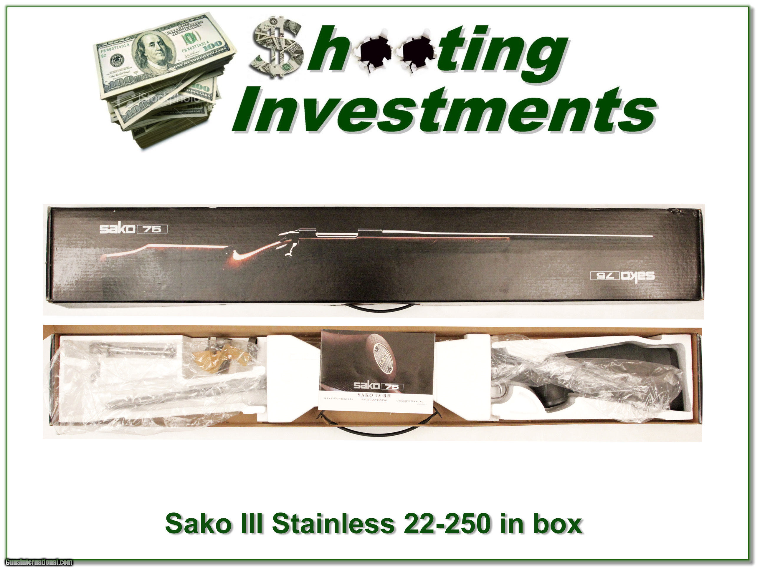 Description: This is a Sako III Stainless in 22-250. It comes in original box with factory bases and rings and all papers. Shipping and insurance is $35. Please email me with any questions or larger pictures. (I now consign quality firearms only 10%! Let me know if you have any you would like to sell!) [16-0295] Payment: Payment is by Money Order, Cashiers Check or Personal Check. I can now also accept MasterCard and Visa with a 3% convenience fee. PayPal can be used for some items but never firearms. Please let us know if you would like to pay via PayPal. Shipping: The shipping charge will be listed in each description. It is $35 for most guns. Some heavy guns or those insured for over $2000 will be higher. Shipments to Alaska and Hawaii are higher because air shipment is required. Most firearms are shipped within 5 days of receipt of payment. We prefer shipping at the beginning of the week to avoid firearms in transit over weekends. We package all shipments carefully and insure them for the full purchase price, rounded up to the next $100. In the unlikely event that damage occurs, it is important that you save all packaging material for the claims process. Optics are shipped Priority Mail and most other non-firearm shipments are shipped First Class. Returns: Our return policy is simple. If for any reason you are not pleased with your purchase, you may return your item for a refund. The only exception is ammunition, it cannot be returned. It is important to us that you are happy. Guns cannot be fired or dissembled before returning them and must be returned in the same condition as received. Notification of a return must occur with-in 3 days of receipt at your dealer. Shipping, convenience and dealer fees are not refundable and are the responsibility of the buyer. Lay-a-way: If needed, we offer a 60 day lay-a-way option on most firearms. It is 1/3 now, 1/3 in 30 days and 1/3 in 60 days. Lay-a-way firearm sales are final. Consigning your firearms with Shooting Investments: We will help you get top dollar for your firearms. While most local guns shops charge 20% or more, our fee is only 10% with a minimum of $50. At your local gun shop it might take months to sell. Selling on-line provides instant access to thousands of interested buyers. You won’t find any other on-line dealer willing to sell your firearms for only 10% or listing every gun on 4 separate s. Selling through an House typically costs the seller 15% and the buyer an addition 15% (so 30%) and you have to wait several months to sell and longer to receive funds. If properly priced, we will sell your firearms in a week or two. Send us an email or give us a call and we’ll explain how easy it is for you to get top dollar. Trading: We collect guns and usually just trade for guns we want to add to our collections. We often sell guns for others wanting to purchase one of ours. We find this the most fair to both of us. Our Commission is only 10% and we hold the gun you want until yours sells. Please contact us if you want to sell one of yours to buy one of ours. Help for California Buyers: We are happy to ship to California. It is the buyer’s responsibility to make sure any item you buy is legal in your state. We are also happy to help with your purchase of a firearm from someone other than us. If you see a gun you would like to buy but the seller can’t or won’t ship to California we can help. You buy the gun and have it shipped to us. We’ll then ship it to your California dealer. The cost for this service is only $30 + shipping. Let me know if we can help! SOLD |