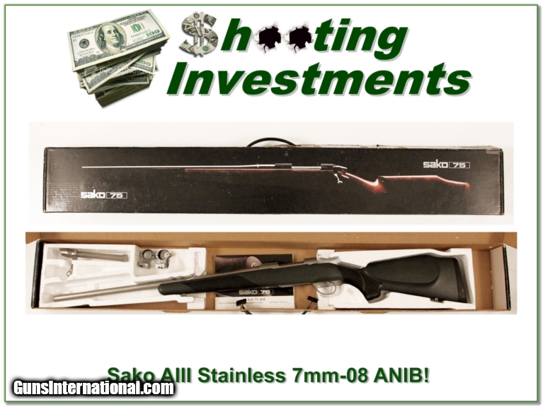 Description: This is a hard to find Sako in the near perfect deer caliber; 7mm-08. It is a III in stainless. It is in excellent codnition with only a couple handing marks. This will make a super nice hunting gun. Shipping and insurance is $30 or $18 more if you want it shipped in a new Plano hard case. Please email me with any questions or larger pictures. (I now consign quality firearms only 10%! Let me know if you have any you would like to sell!) [14-0958] Payment: Payment is by Money Order, Cashiers Check or Personal Check. I can now also accept MasterCard and Visa with a 3% convenience fee. PayPal can be used for some items but never firearms. Please let us know if you would like to pay via PayPal. Shipping: The shipping charge will be listed in each description. It is $30 for most guns. Some heavy guns or those insured for over $2000 may be higher. Shipments to Alaska and Hawaii are higher because air shipment is required. Most firearms are shipped within 5 days of receipt of payment. We prefer shipping at the beginning of the week to avoid firearms in transit over weekends. We package all shipments carefully and insure them for the full purchase price, rounded up to the next $100. In the unlikely event that damage occurs, it is important that you save all packaging material for the claims process. Optics are shipped Priority Mail and most other non-firearm shipments are shipped First Class. Returns: Our return policy is simple. If for any reason you are not pleased with your purchase, you may return your item for a refund. The only exception is ammunition, it cannot be returned. It is important to us that you are happy. Guns cannot be fired or dissembled before returning them and must be returned in the same condition as received. Notification of a return must occur with-in 3 days of receipt at your dealer. Shipping, convenience and dealer fees are not refundable and are the responsibility of the buyer. Lay-a-way: If needed, we offer a 60 day lay-a-way option on most firearms. It is 1/3 now, 1/3 in 30 days and 1/3 in 60 days. Lay-a-way firearm sales are final. Consigning your firearms with Shooting Investments: We will help you get top dollar for your firearms. While most local guns shops charge 20% or more, our fee is only 10% with a minimum of $50. At your local gun shop it might take months to sell. Selling on-line provides instant access to thousands of interested buyers. You won’t find any other on-line dealer willing to sell your firearms for only 10% or listing every gun on 4 separate s. Selling through an House typically costs the seller 15% and the buyer an addition 15% (so 30%) and you have to wait several months to sell and longer to receive funds. If properly priced, we will sell your firearms in a week or two. Send us an email or give us a call and we’ll explain how easy it is for you to get top dollar. Trading: We collect guns and usually just trade for guns we want to add to our collections. We often sell guns for others wanting to purchase one of ours. We find this the most fair to both of us. Our Commission is only 10% and we hold the gun you want until yours sells. Please contact us if you want to sell one of yours to buy one of ours. Help for California Buyers: We are happy to ship to California. It is the buyer’s responsibility to make sure any item you buy is legal in your state. We are also happy to help with your purchase of a firearm from someone other than us. If you see a gun you would like to buy but the seller can’t or won’t ship to California we can help. You buy the gun and have it shipped to us. We’ll then ship it to your California dealer. The cost for this service is only $30 + shipping. Let me know if we can help! SOLD |