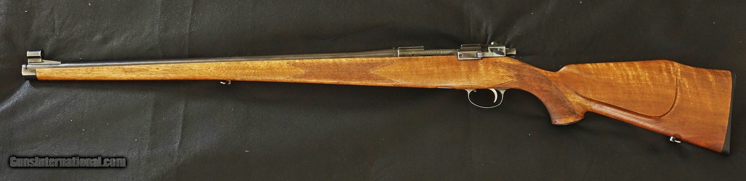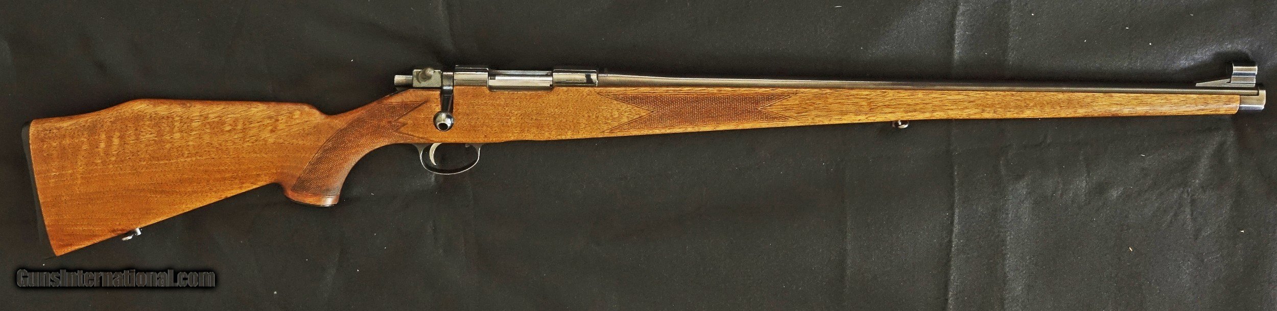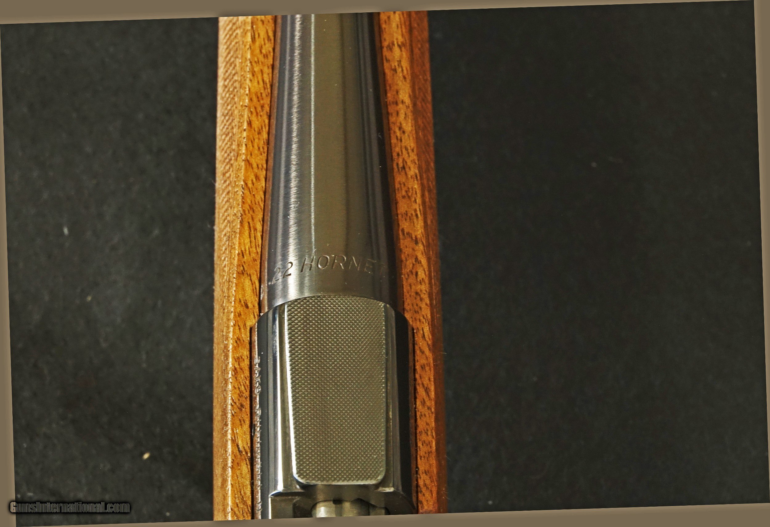 Description: SAKO MANNLICHER L46 - 22 HORNET - MANNLICHER STOCK IS IN ONE PIECE - NOT THE NORMAL SPLICED FOREARM - BASED ON THE SERIAL NUMBER, THIS IS AN EARLY 60'S OR LATE 50'S PRODUCTION. IT HAS A DETACHABLE CLIP - FRONT HOODED SIGHT - PRODUCED WITHOUT A MID BARREL SIGHT - BOFOR STEEL BARREL - CONDITION - SHOWS SOME USE BUT FOR IT'S AGE IN VERY NICE SHAPE - BARREL AND ACTION BETTER THAN 98% - BORE BRIGHT - SOME VERY LIGHT MARKS AROUND SAFETY HOUSING AND TRIGGER PLATE - STOCK, AGAIN VERY NICE , NO MAJOR NICKS - STOCK HAS BEEN REFINISHED AND PRICE ADJUSTED - STILL .A VERY NICE AND SCARCE EARLY SAKO HORNET. SOLD |
