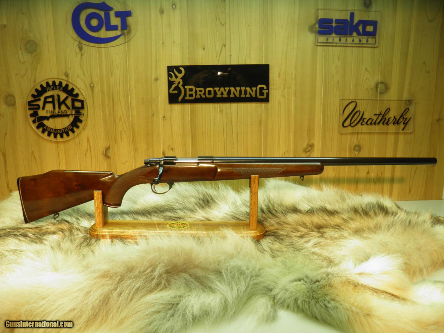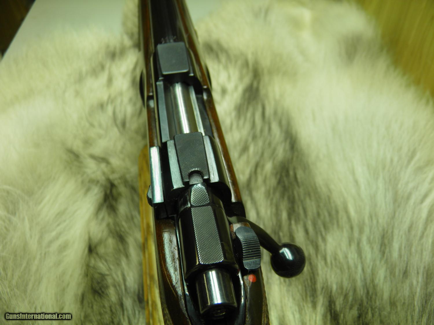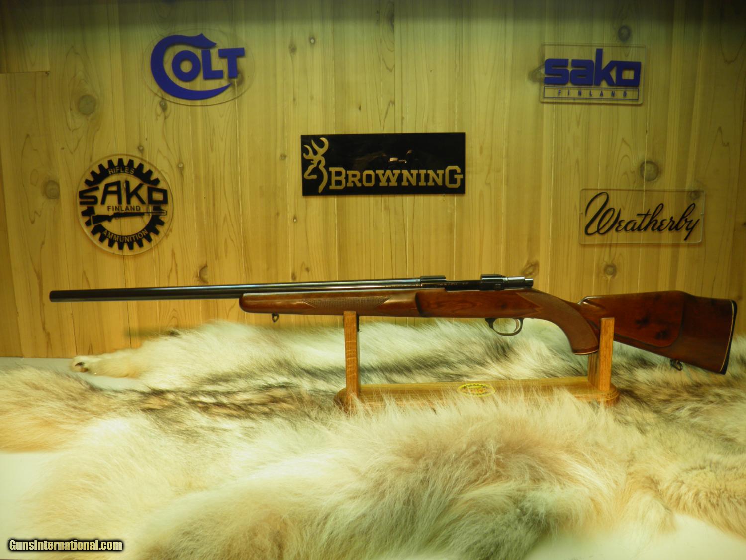 Description: SAKO L461 VIXEN CAL: 222 REMINGTON MAGNUM HEAVY BARREL MAF: 1964, BARREL LENGTH 23 1/2" WITH A 1 - 14" TWIST, BARREL STAMPED "BOFORS STEEL", APPROX: 8 1/4 LBS, OVERALL LENGTH 42 1/2", LENGTH OF PULL 13 1/2", MAGAZINE CAPACITY 5 ROUNDS, CRISP TRIGGER THATS ADJUSTABLE DOWN TO 2 1/2 LBS, RECEIVER HAS DOVETAIL INTEGRAL RAIL MOUNTS FOR SCOPE RING MOUNTING, STEEL TRIGGER GUARD WITH HINDGED FLOOR-PLATE FOR QUICK UNLOADING, PISTOL GRIP EUROPEAN WALNUT STOCK, WITH MONTE-CARLO COMB WITH CHEECK-PIECE, WIDE BEAVERTAIL FOREND, HAND CHECKERED AND RICHLY FINISHED WOOD WITH ATTACHED SWIVELS, BOLT BODY AND BOLT GUIDE ARE HIGHLY POLISHED FOR SMOOTH AND EASE OPERATION. "CONDITION" BLUE 98.5%++, WOOD 98%++, A FEW VERY SMALL HANDLING MARKS, BORE BRIGHT AND CLEAN WITH SHARP PRONOUNCED RIFLING, RIFLE WAS VERY WELL MAINTAINED!!! SOLD |