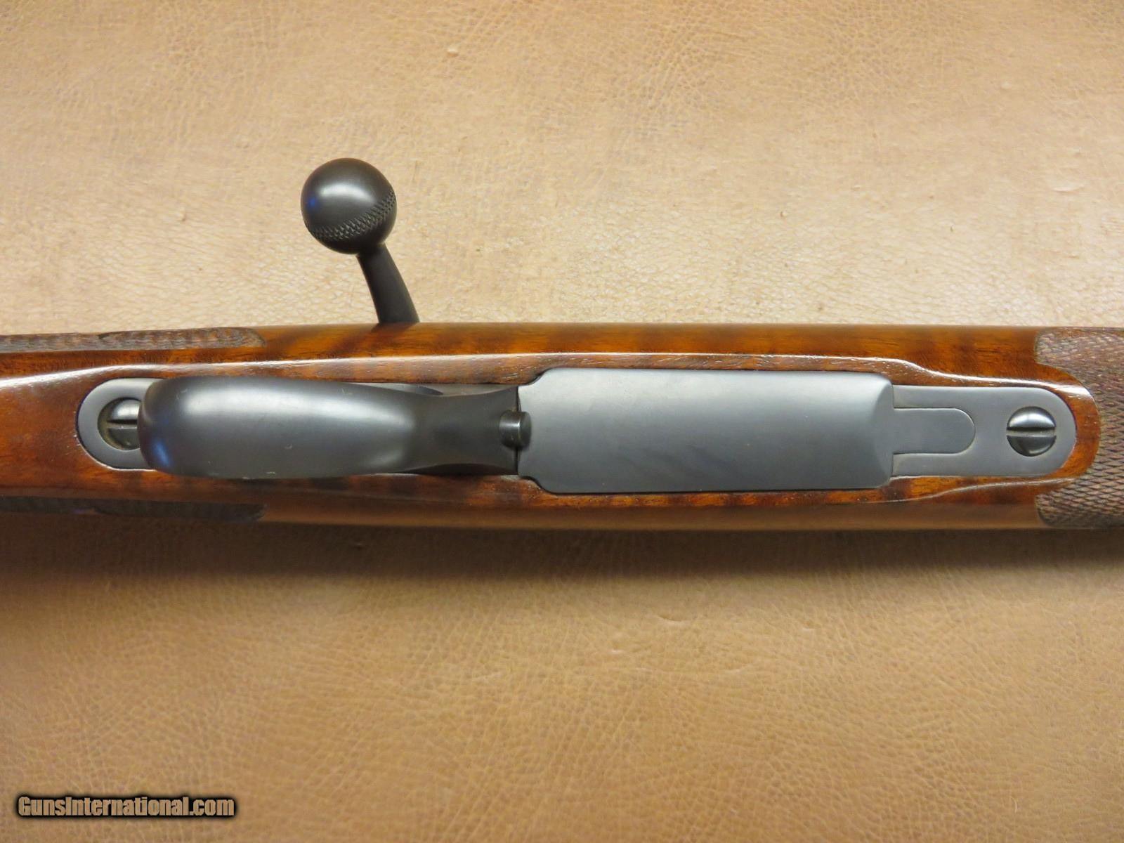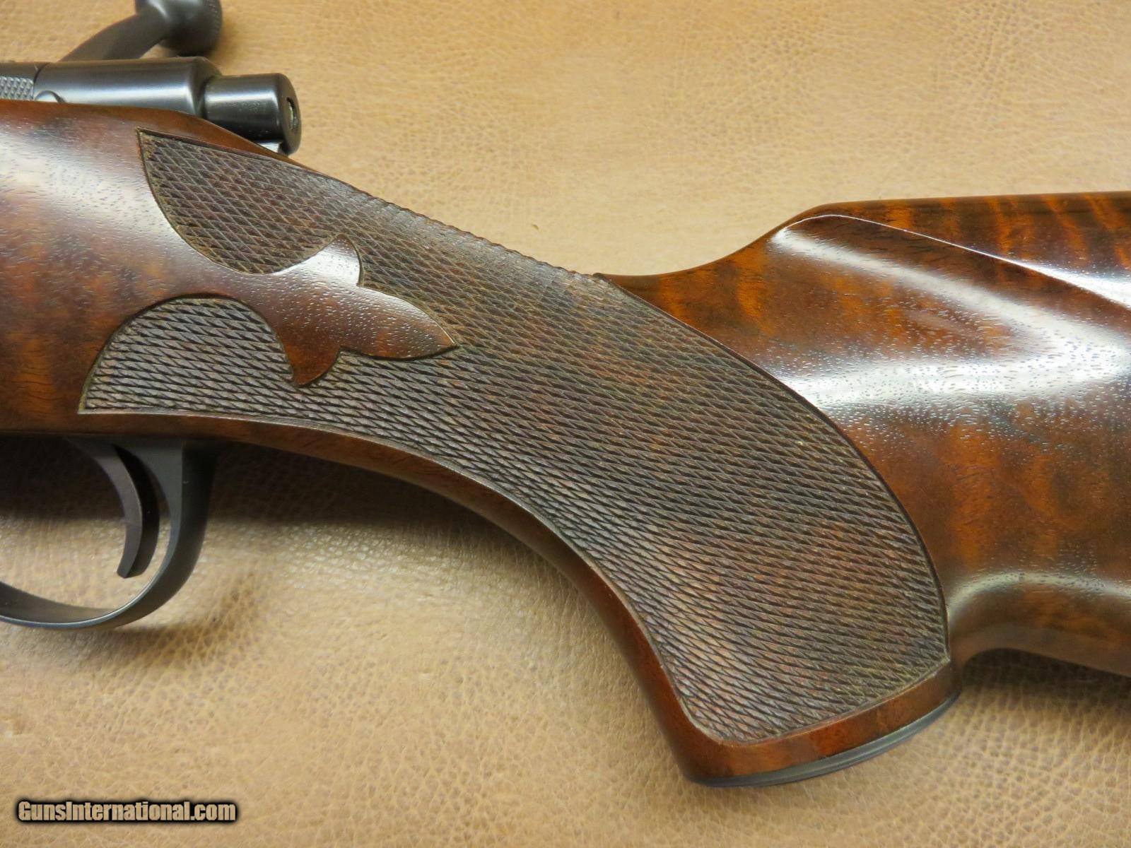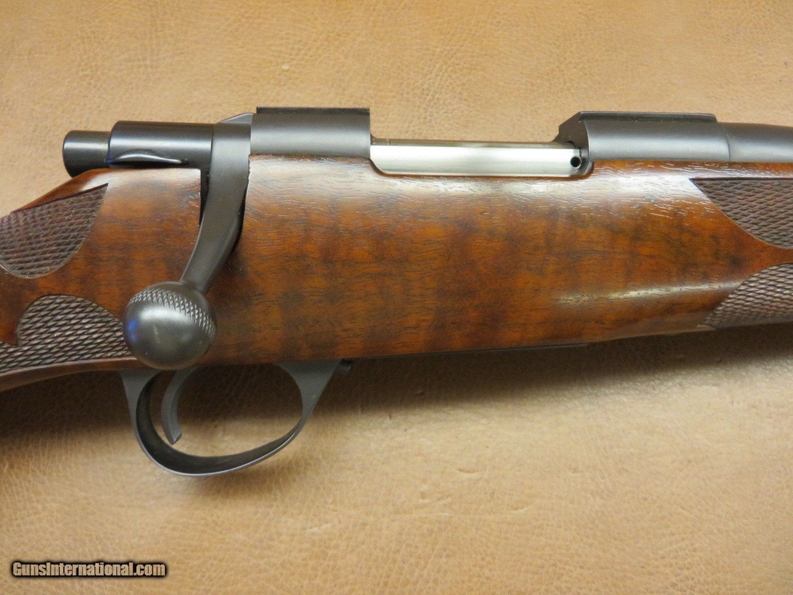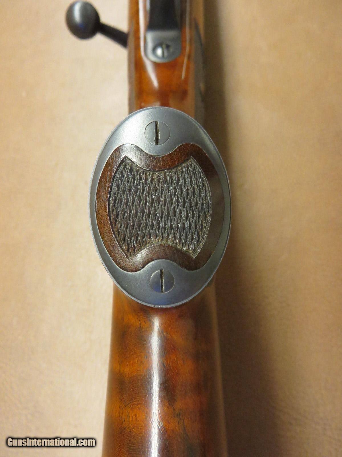 Description: .223 Remington has 23 1/2 inch barrel and dovetailed receiver for scope mounting. Serial number 137xxx. Reblued with a satin finish. Highly figured checkered walnut custom stock has inlet sling swivel studs, steel skeleton pistol grip cap, and checkered steel butt plate. All in excellent condition. SOLD |