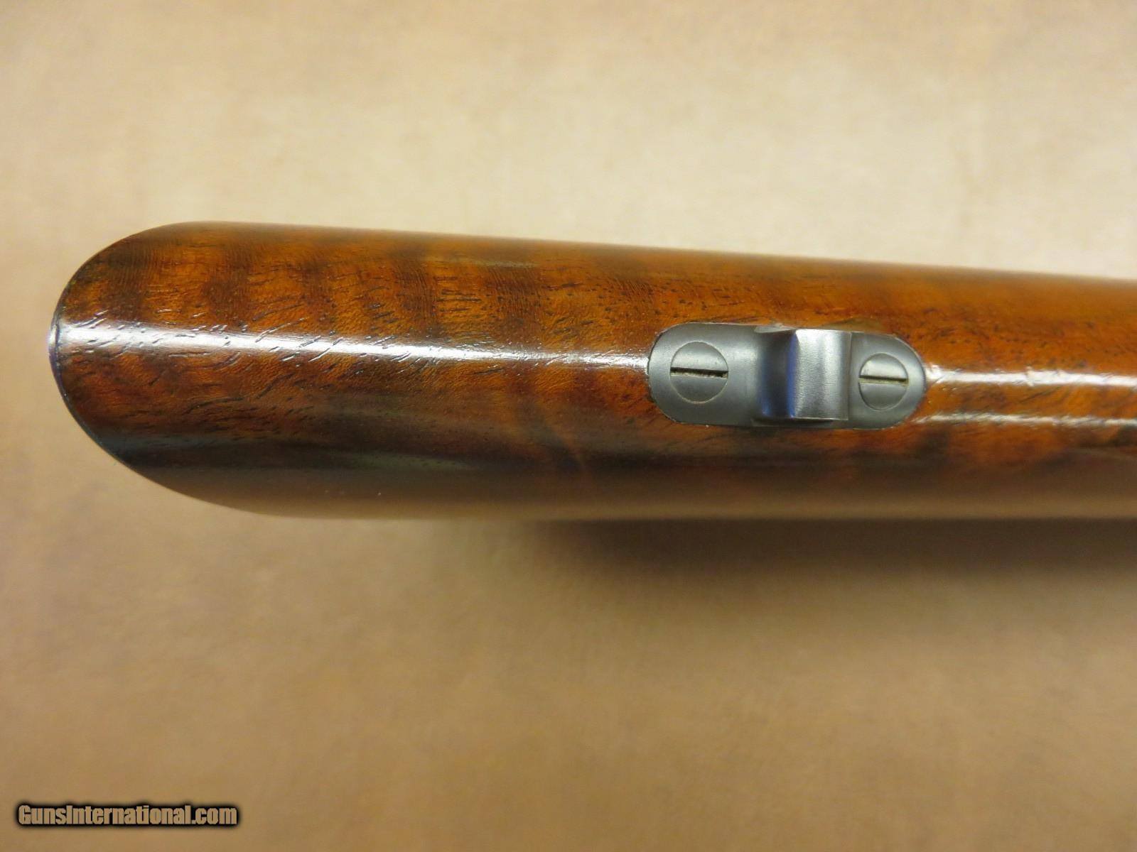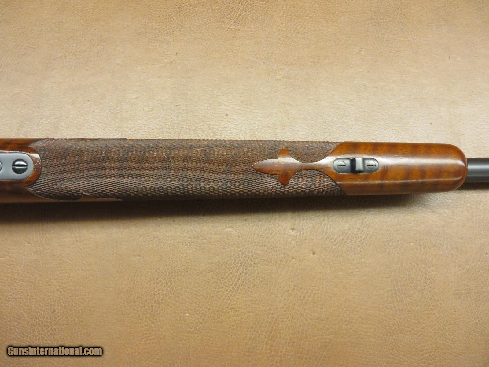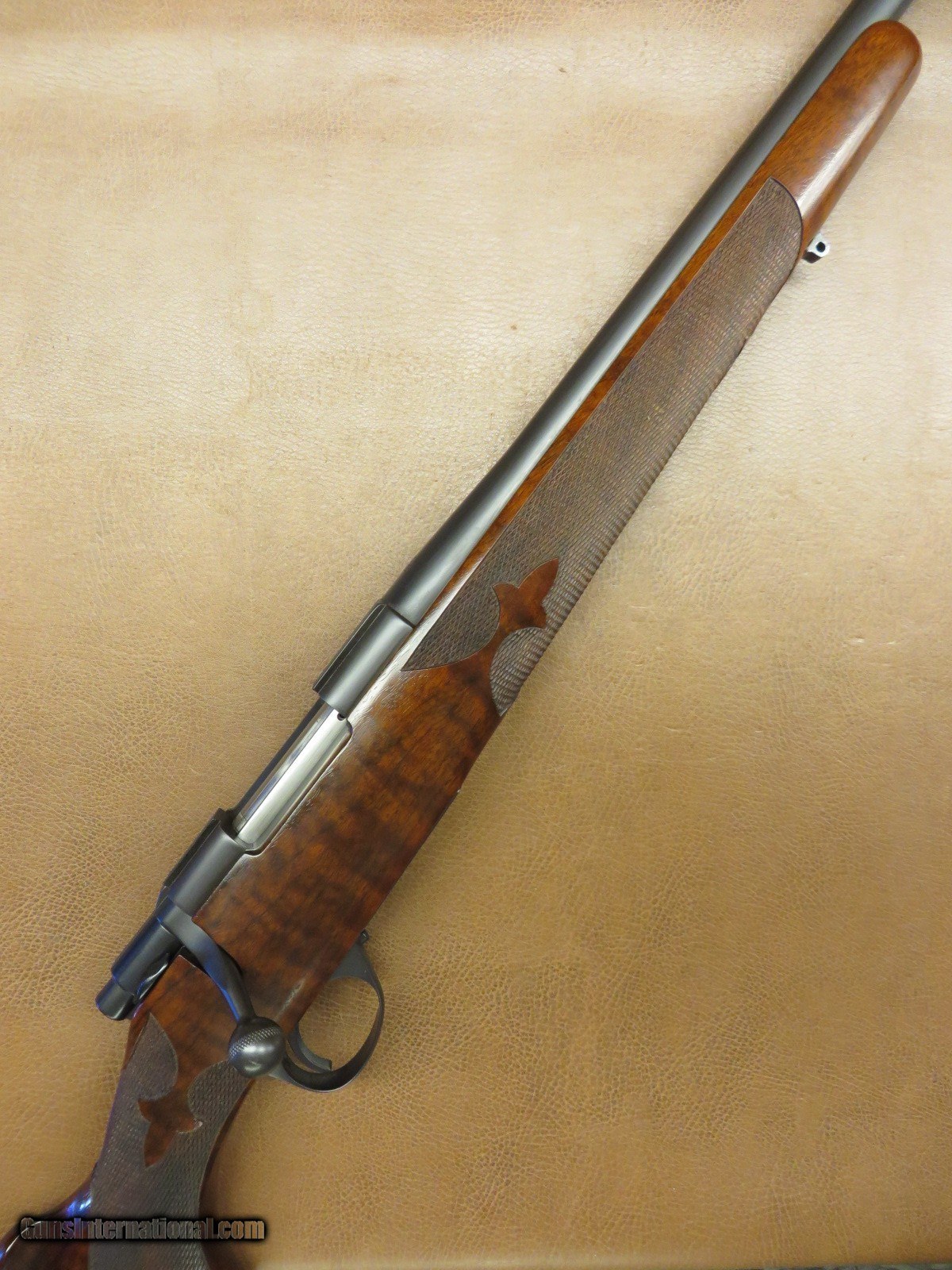 Description: .223 Remington has 23 1/2 inch barrel and dovetailed receiver for scope mounting. Serial number 137xxx. Reblued with a satin finish. Highly figured checkered walnut custom stock has inlet sling swivel studs, steel skeleton pistol grip cap, and checkered steel butt plate. All in excellent condition. SOLD |