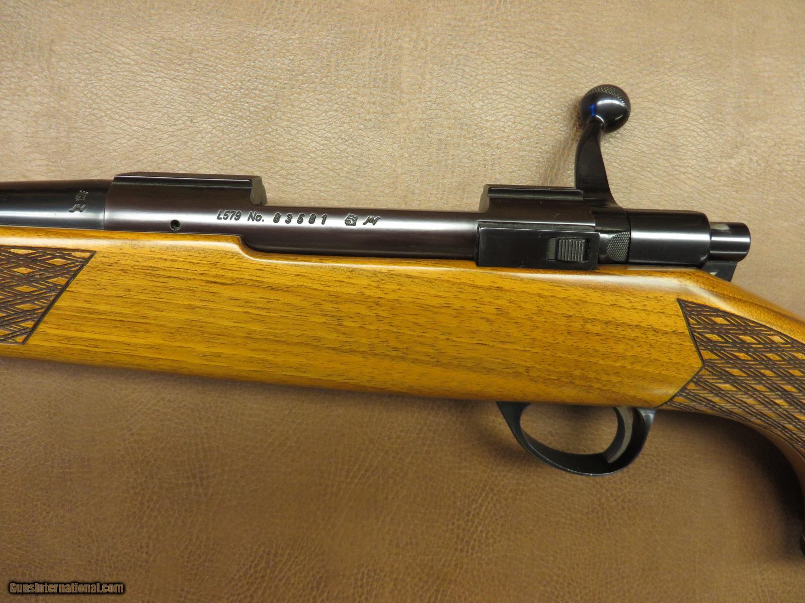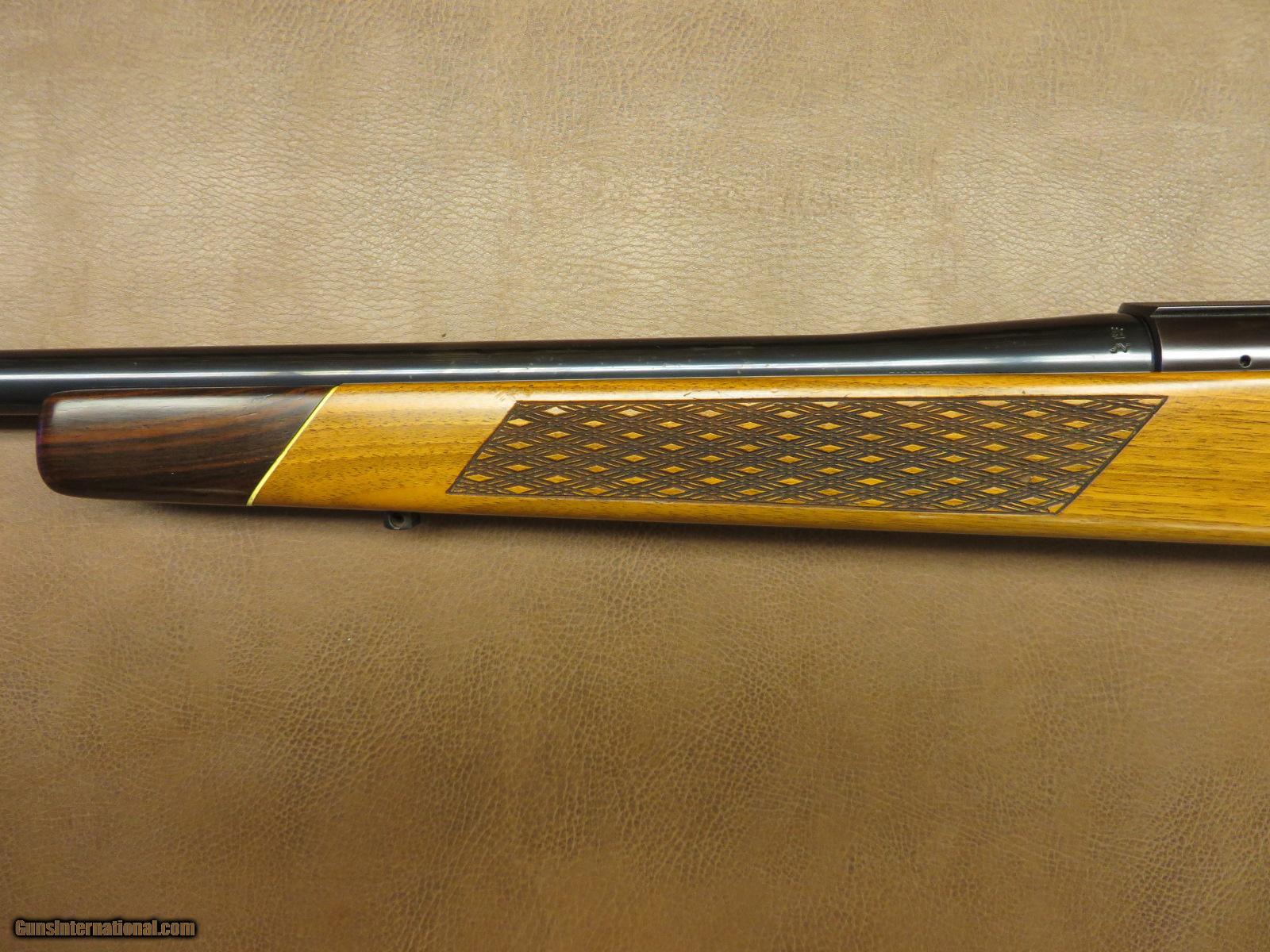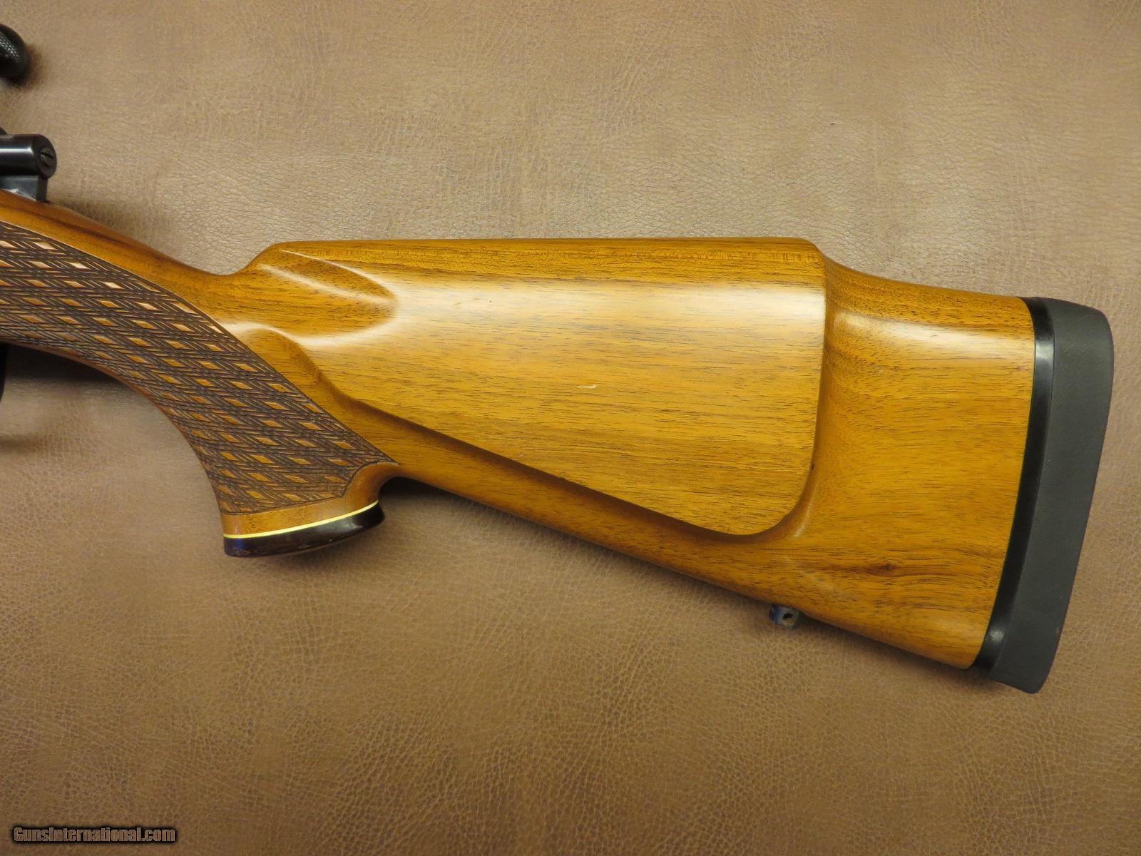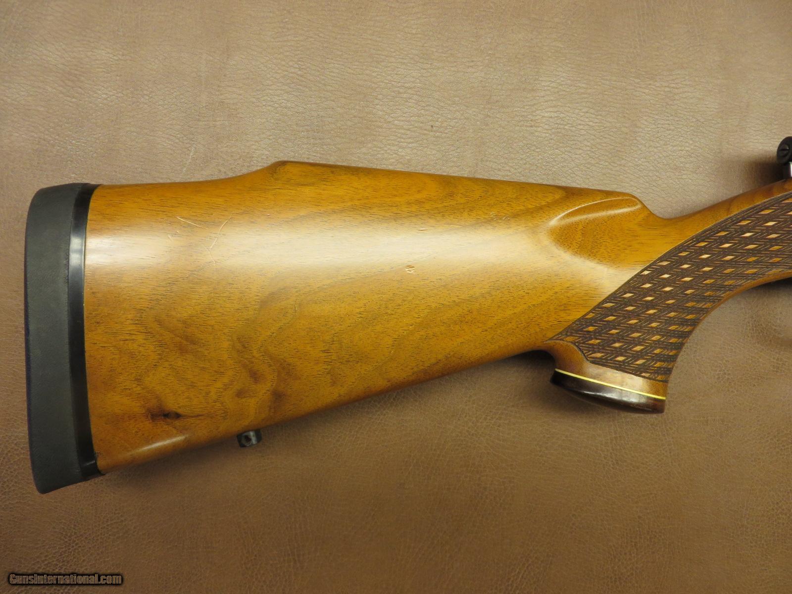 Description: .243 Winchester has 22 1/2 inch Magna-Ported barrel. Serial number 83xxx. Dovetailed receiver for scope mounting. Engraved floorplate and triggerguard. Checkered walnut stock has contrasting wood forend tip and pistol grip cap, sling swivel studs, cheek piece, and Pachmayr Decelerator recoil pad. Blue and wood finish are 95%. SOLD |