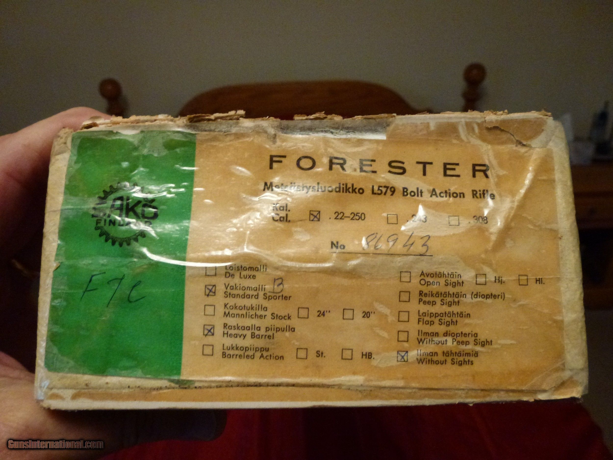 Description: This is an UNFIRED since leaving the factory in 1970 Sako L579 Forester heavy barrel bolt action rifle in .22-250 caliber. I purchased this rifle in 1996 from a Sako Collectors Association member who said that he had never fired the gun. I have not fired the gun since I have owned it. It comes with the original box and the original sling swivels. It has a 24 inch barrel and no sights. It has the original Sako buttplate and checkered gloss walnut semi-beavertail forearm.There is only 1 nick on the stock of this gun. it is on the right side at the bottom where the forearm widens. It is barely noticeable. This gun was manufactured in 1970 and imported by Firearms International Corporation of Washington, DC. I accept payment by Zelle or check. The check will have to clear my bank before I will ship the rifle. Please e-mail me any questions as NO RETURNS ARE ALLOWED. I will pay to ship and insure this item to your FFL. SOLD Rifle Caliber: .22-250 Remington Manufacturer: Sako Model: L579 Finnbear Serial Number: 86943 Barrel Length: 24 inches Condition: Excellent Metal Condition: 99% Wood Condition: 99% Bore Condition: Excellent Action: Bolt Rifle Stock: Checkered Gloss Walnut LOP: 13.5 inches Finish: Blued Sights: None Manufacture Date: 1970 |