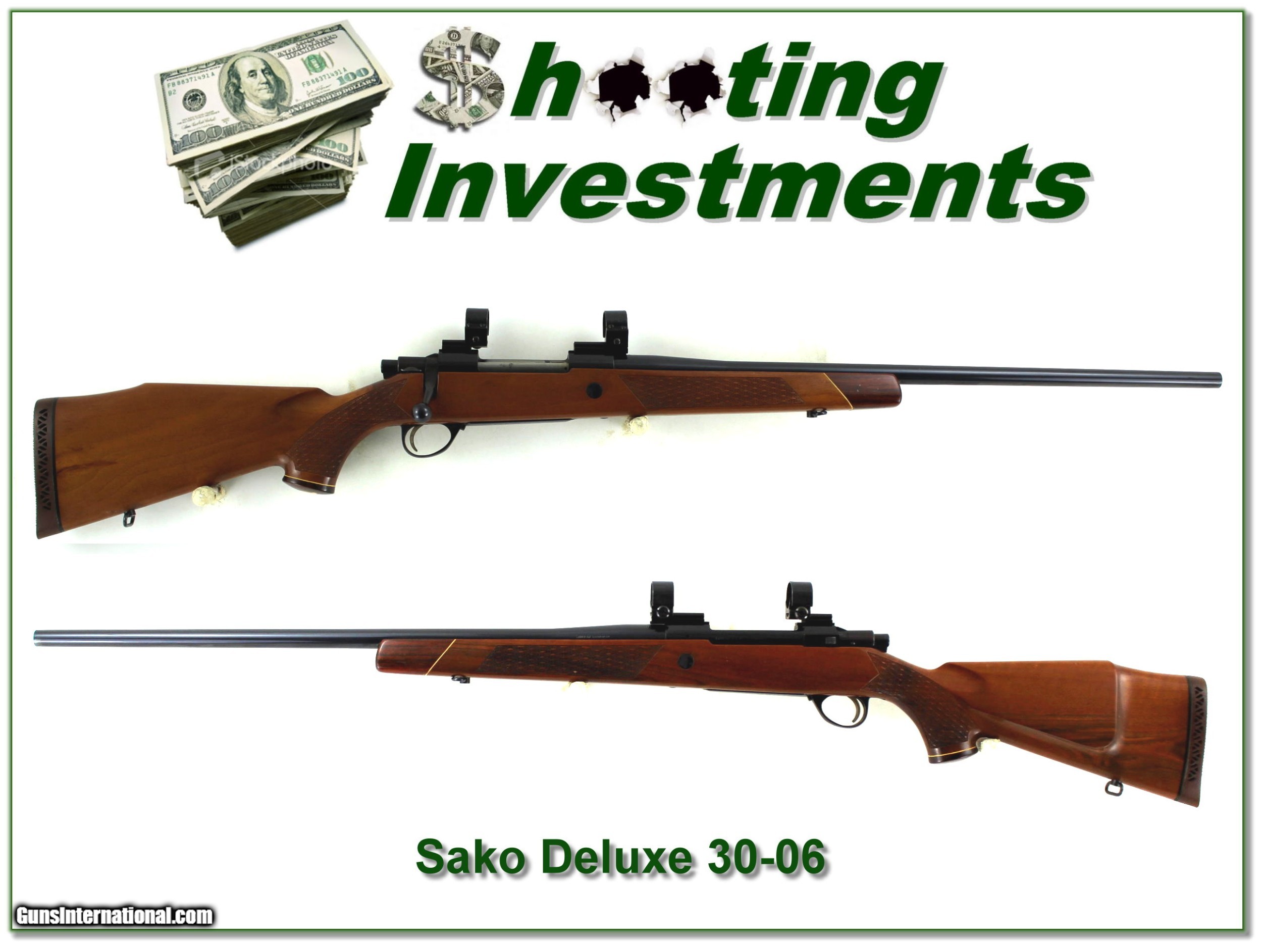 Description: This is a Sako Finnbear Deluxe in 30-06. The metal is in excellent condition and the bore is bright and shiny. It has beautiful honey colored wood with some marks from use. The recoil pad is excellent and not hard or deformed like man of this era. It comes with bases and rings as seen and will make a classic hunting gun. These early Sako’s are know for superior accuracy. Shipping and insurance is $49. Please email me with any questions or larger pictures. (Consign your quality firearms with Shooting Investments for only 12%! Let me know if you have any you would like to sell!) 22-1153 Payment: Payment is by Money Order, Cashiers Check or Personal Check. I can now also accept Credit Cards (MasterCard, Visa, Discover & American Express) with a 3% convenience fee. Shipping: The shipping charge will be listed in each description. It is $49 for most long guns. Some heavy guns, over 48in boxes or those insured for over $2000 will be higher. Shipments to Alaska and Hawaii are higher because air shipment is required. Most firearms are shipped on Tuesday and Thursday and usually in 5 days of receipt of payment. We package all shipments carefully and insure them. Optics are shipped Priority Mail and most other non-firearm shipments are shipped First Class. Returns: Our return policy is simple. If for any reason you are not pleased with your purchase, you may return your item for a full refund of purchase price. Ammunition cannot be returned. It is important to us that you are happy. Guns cannot be fired or dissembled before returning them and they must be returned in the same condition as received. Notification of a return must occur with-in 3 days of receipt at your dealer. Shipping, convenience and dealer fees are not refundable and are the responsibility of the buyer. Lay-a-way: If needed, we offer a 60 day lay-a-way option on most firearms. It is 1/3 now, 1/3 in 30 days and 1/3 in 60 days. Lay-a-way firearm sales are final and if not completed the first payment cannot be returned. Consigning your firearms with Shooting Investments: We will help you get top dollar for your firearms. While most local guns shops charge 20% or more, our fee is only 12% with a minimum of $75. At your local gun shop it might take months to sell. Selling on-line provides instant access to thousands of interested buyers. You won’t find any other on-line dealer willing to sell your firearms for only 12% or listing every gun on 3 separate s. Selling through an House typically costs the seller 15% and the buyer an addition 15% (so 30%) and you have to wait several months to sell and longer to receive funds. If properly priced, we will sell your firearms in a few weeks. Send us an email or give us a call and we’ll explain how easy it is for you to get top dollar. Trading: Trading for use is really just buying your gun to re-sell. If you have a gun you want to trade, please email a picture and we will let you know what we can give or it. You will always get more if we sell it for you on consignment. Help for California Buyers: We are happy to ship to California. It is the buyer’s responsibility to make sure any item you buy is legal in your state. We are also happy to help with your purchase of a firearm from someone other than us. If you see a gun you would like to buy but the seller can’t or won’t ship to California they can ship to use and we’ll then ship it to your California dealer. The cost for this service is only $30 + shipping. Let us know if we can help! SOLD |