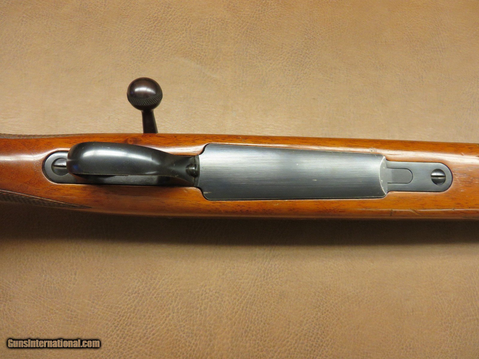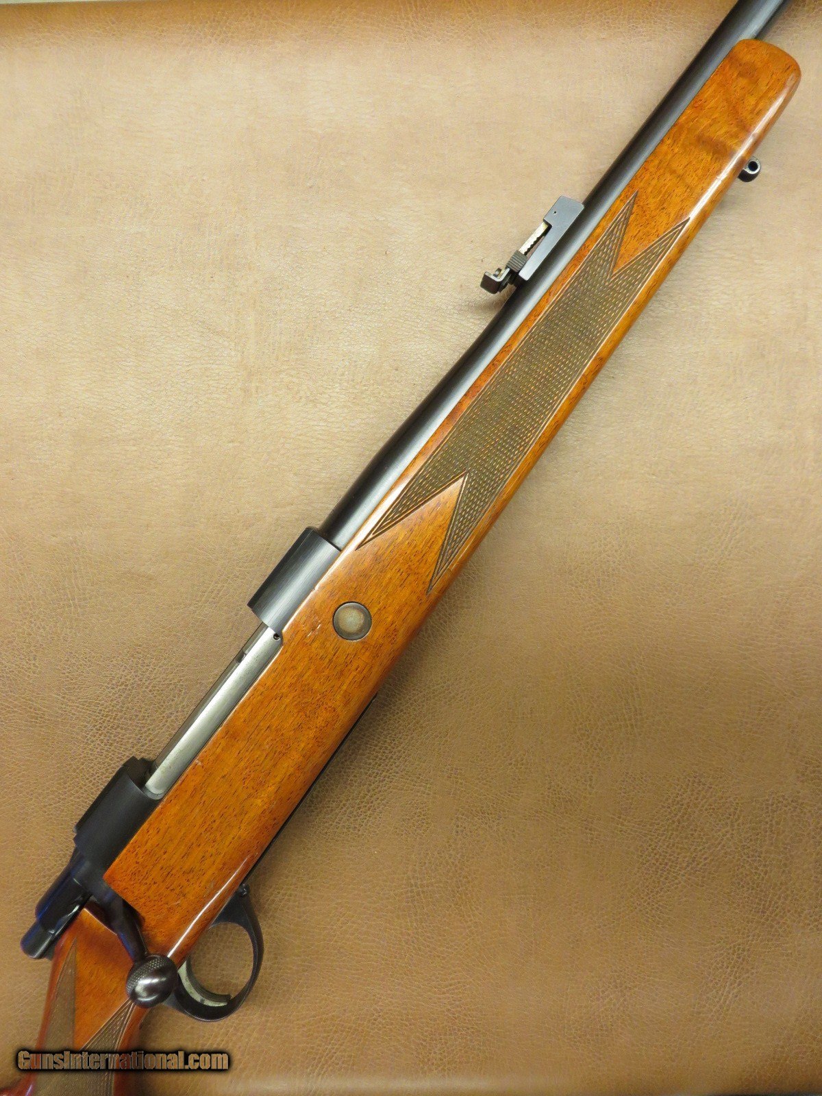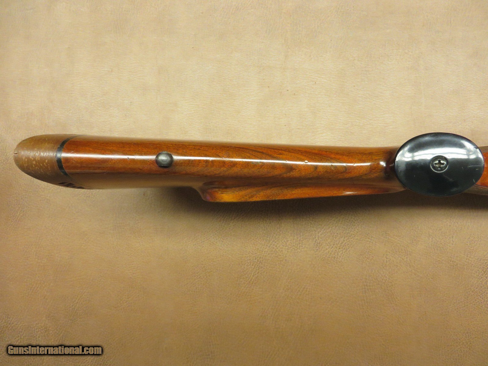 Description: .270 Winchester has 24 1/2 inch barrel with original sights including rear sight marked for 100, 200, and 300 yards. Serial number 68xxx. Dovetailed receiver for scope mounting. Checkered walnut stock has cheekpiece, sling swivel studs, and original recoil pad. Blue is near 95% and the wood near 90%. SOLD |