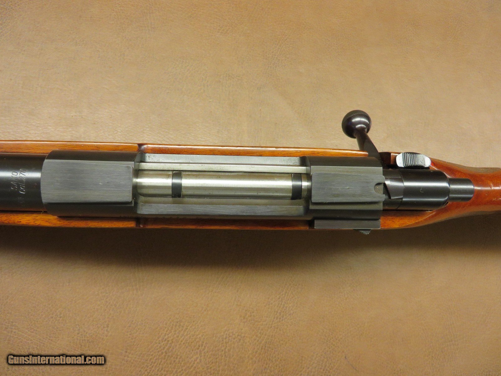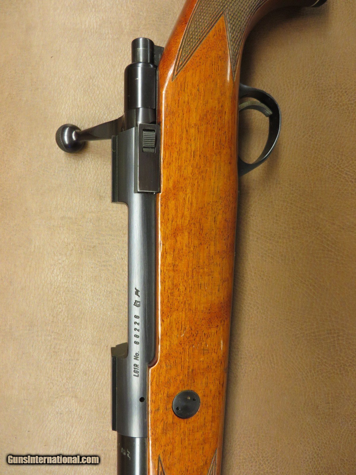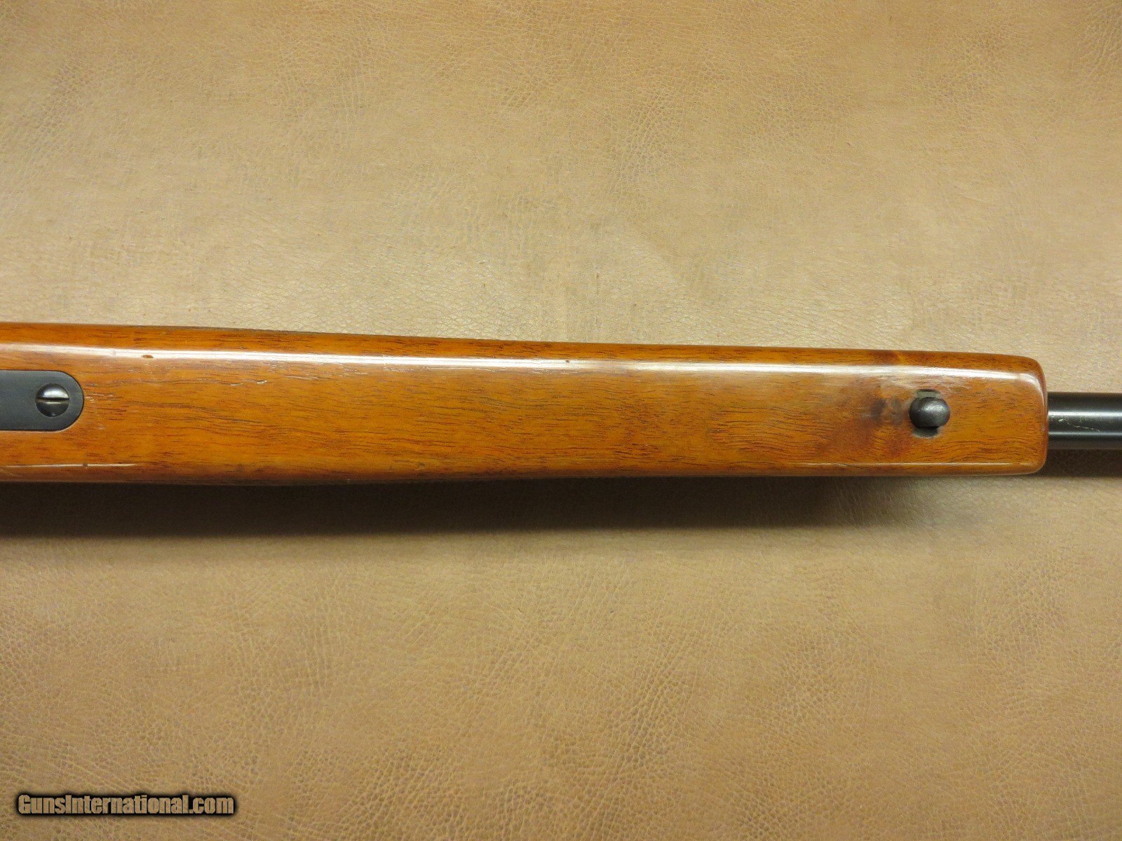 Description: .270 Winchester has 24 1/2 inch barrel with original sights including rear sight marked for 100, 200, and 300 yards. Serial number 68xxx. Dovetailed receiver for scope mounting. Checkered walnut stock has cheekpiece, sling swivel studs, and original recoil pad. Blue is near 95% and the wood near 90%. SOLD |