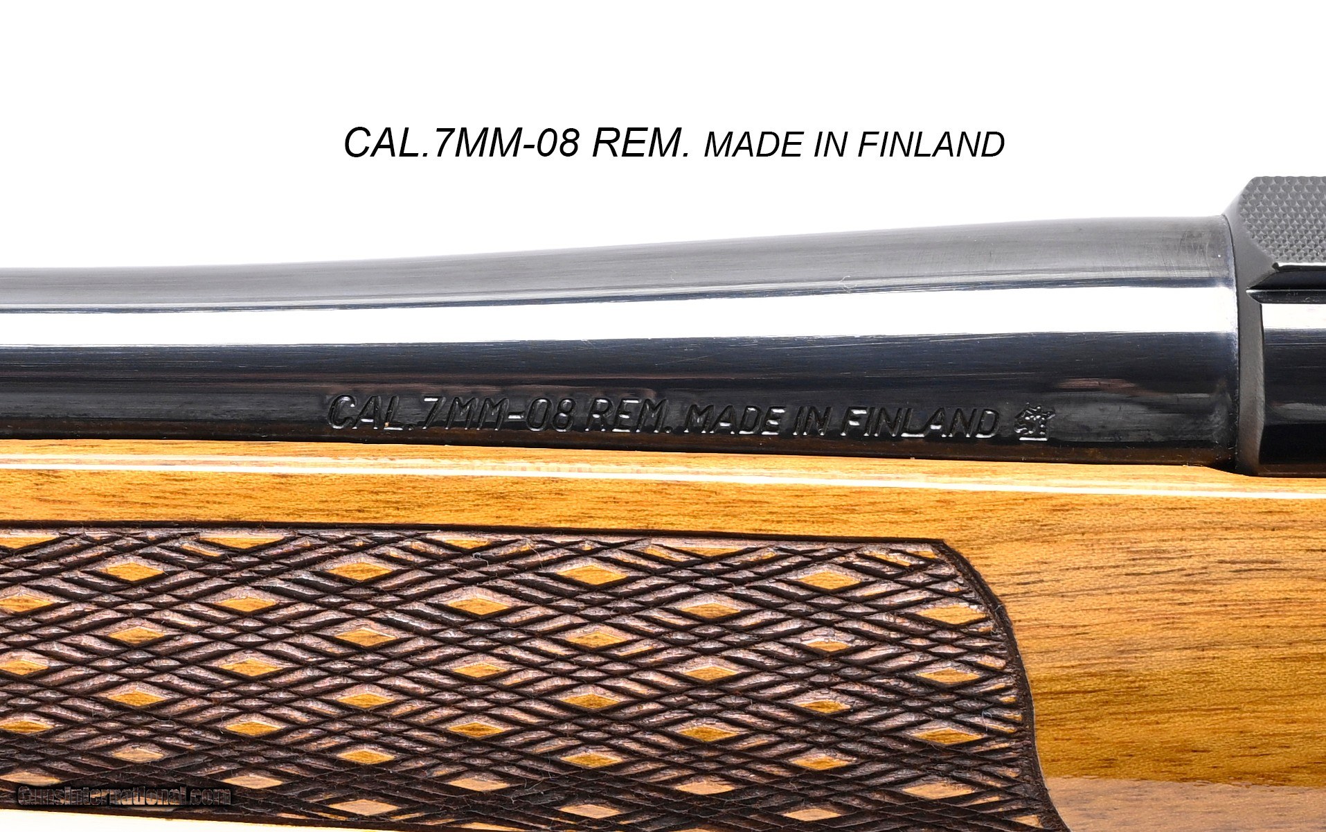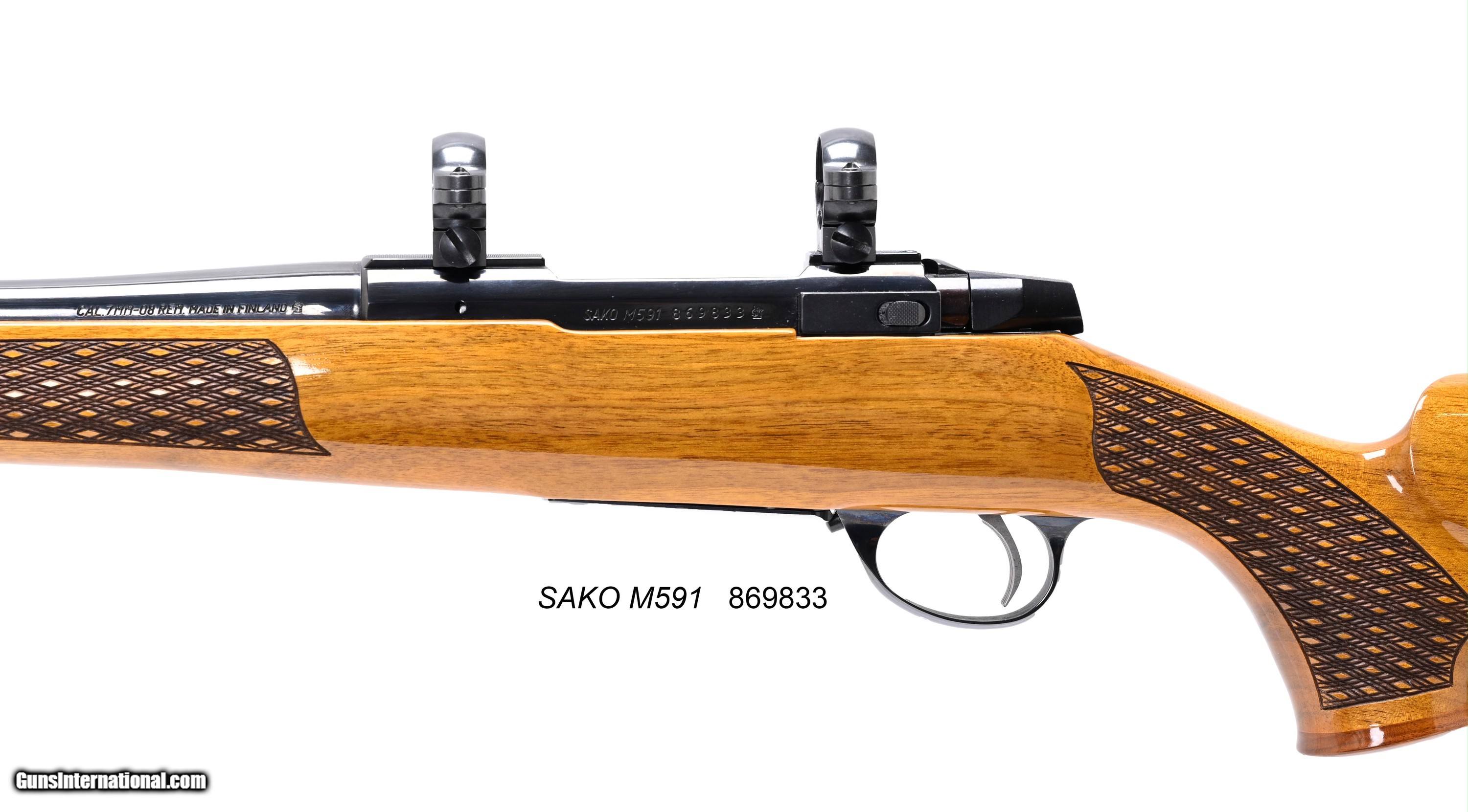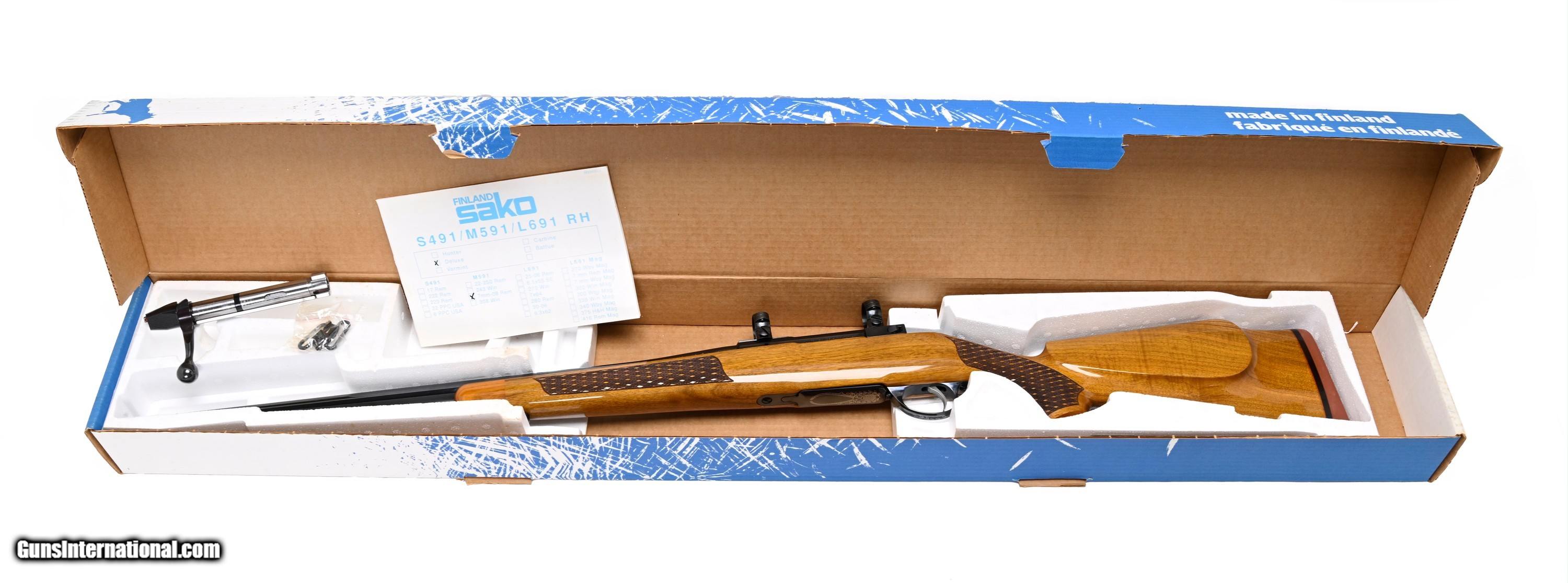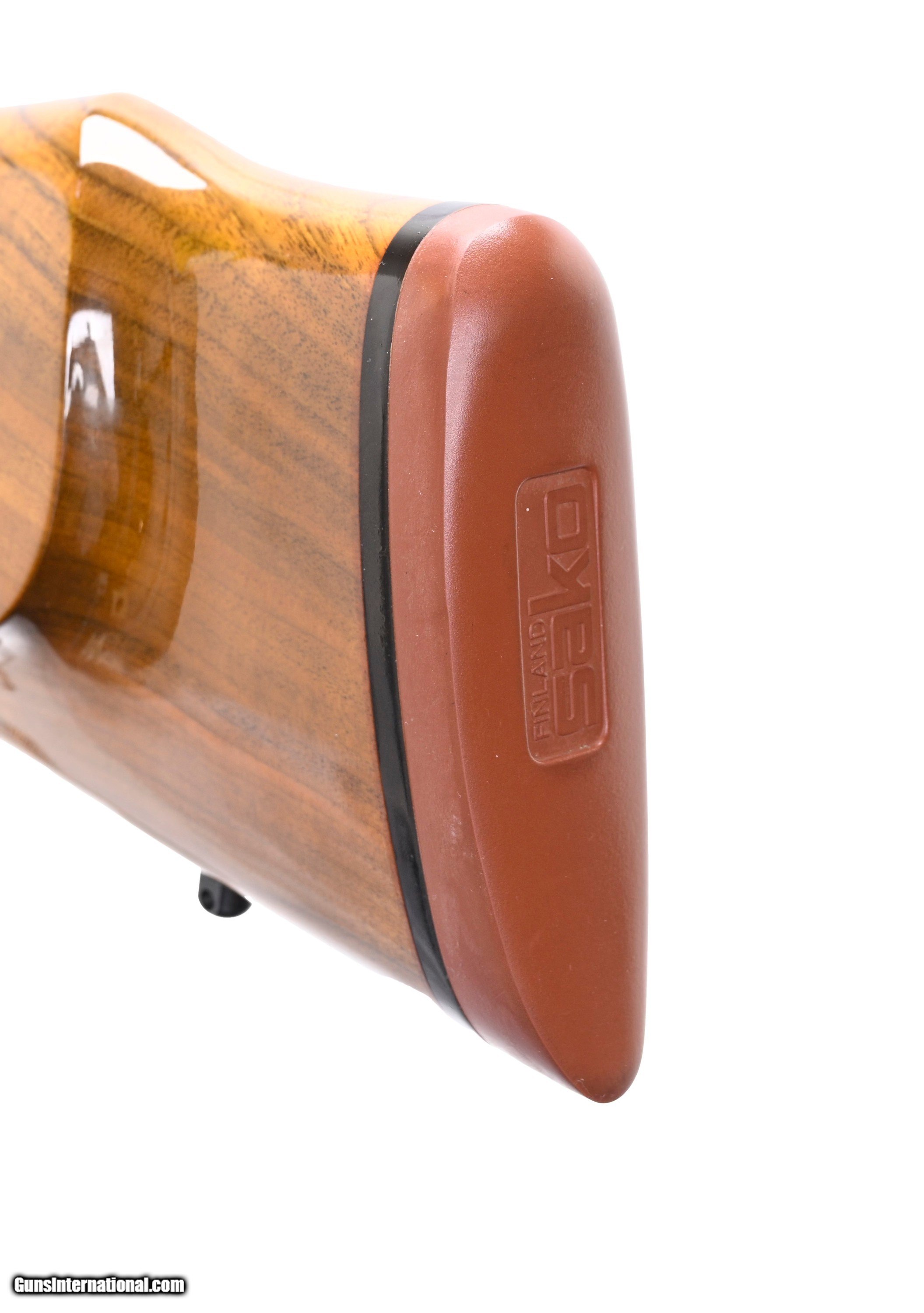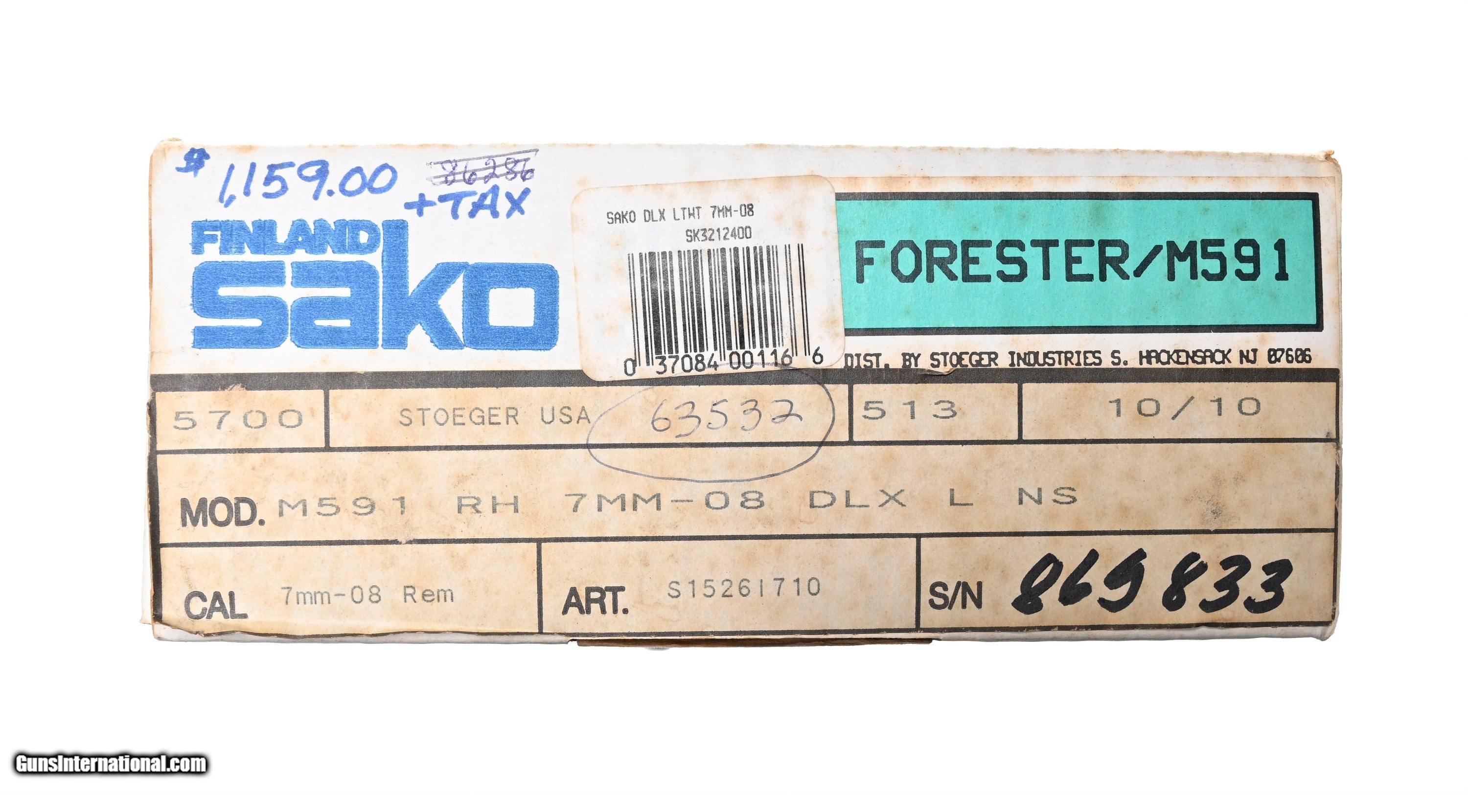 Description: Sako model M591 Deluxe Forester chambered in 7mm-08. This is an absolutely MINT bolt action rifle. It has been fired but there is not a mark on it and it is in the original box with paperwork, sling swivels. Deluxe model has select wood with skip-line checkering, contrasting forearm tip and grip cap. The metal is high polished deep blue and has an engraved floor plate. 22" barrel and comes with a set of 1" Leupold rings. Weighs 7 lbs. 1 oz. SOLD |