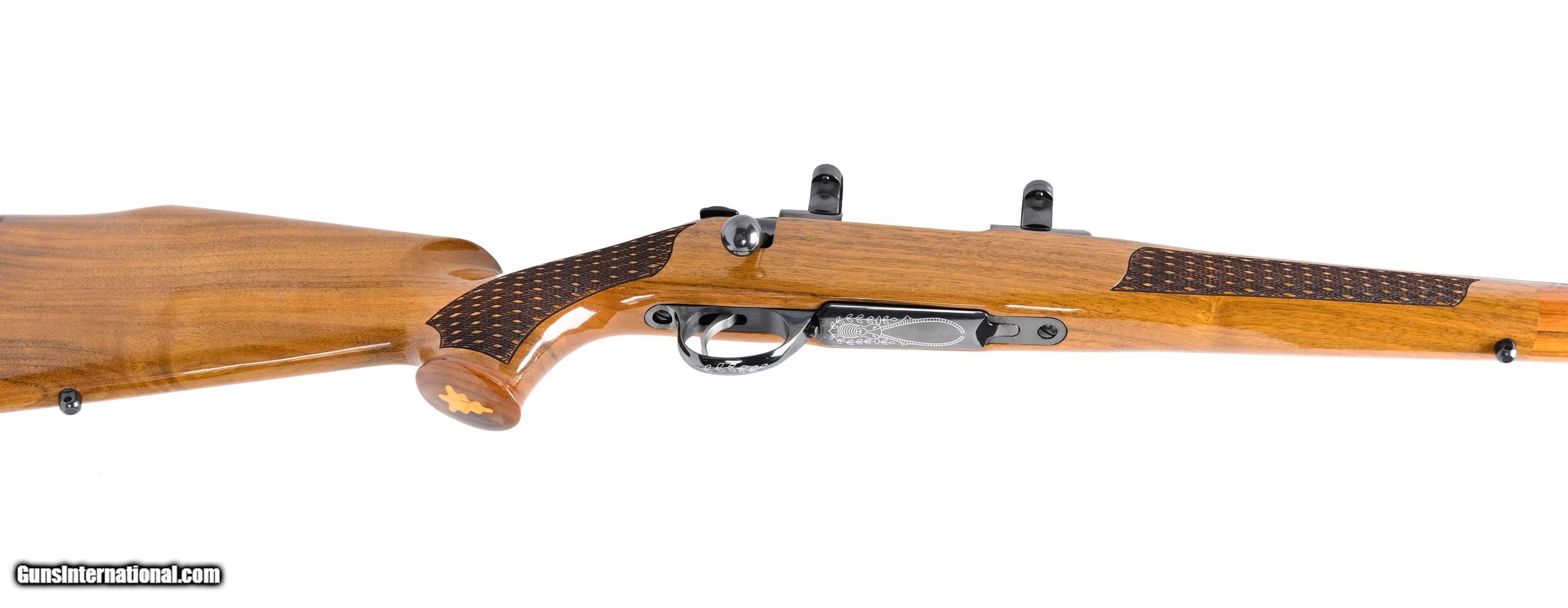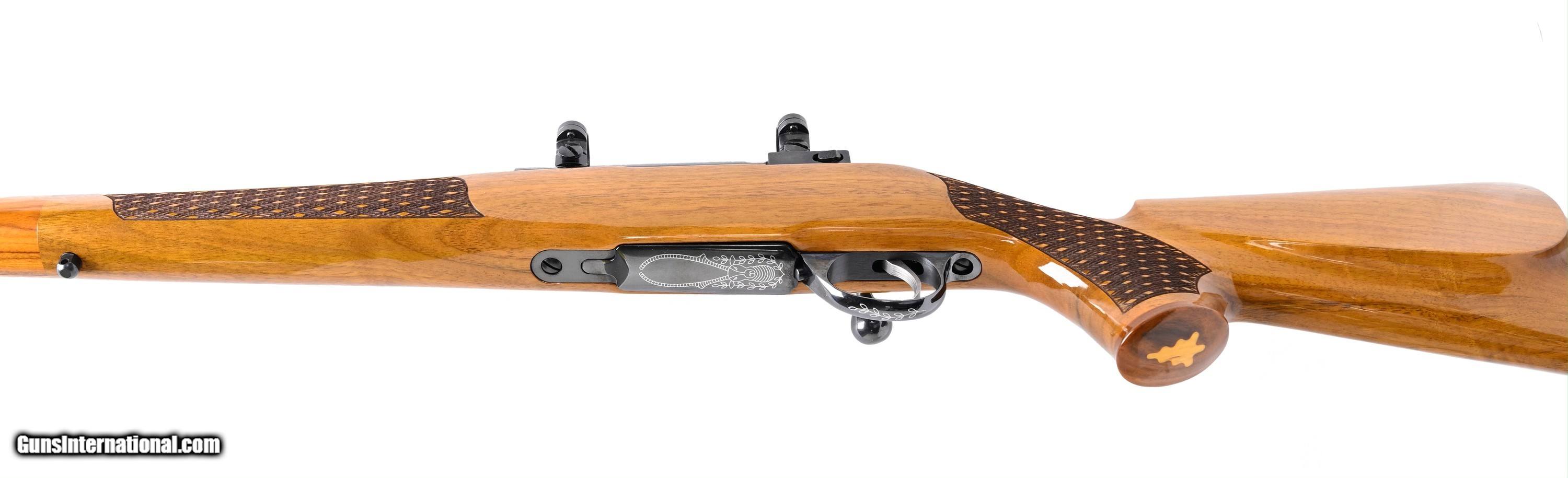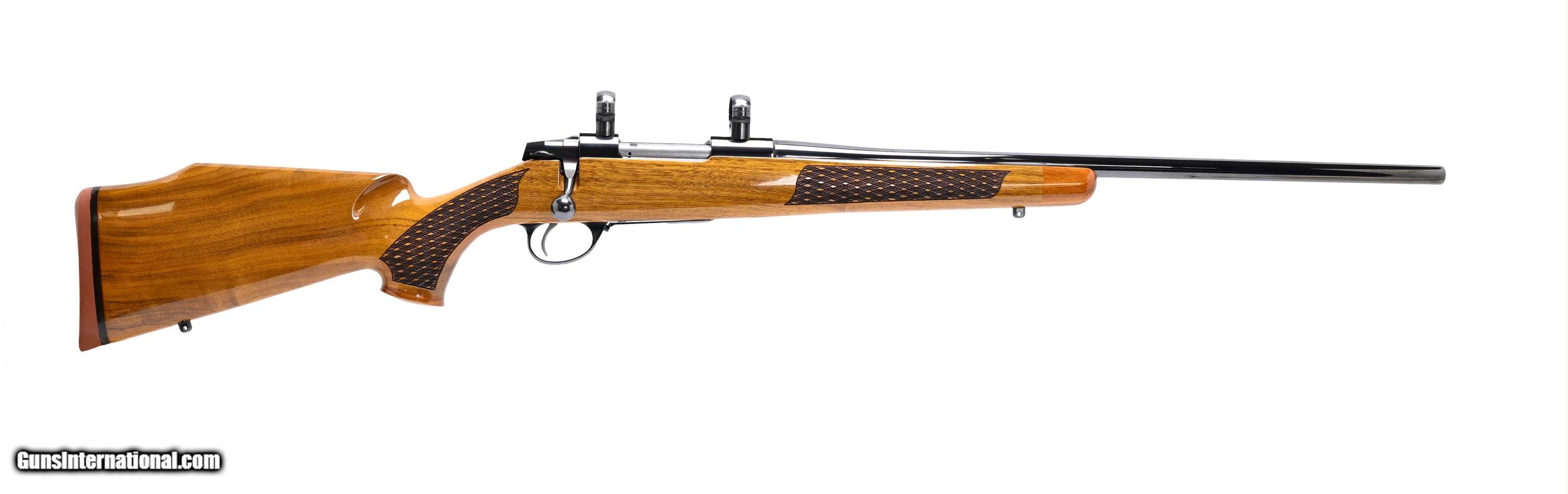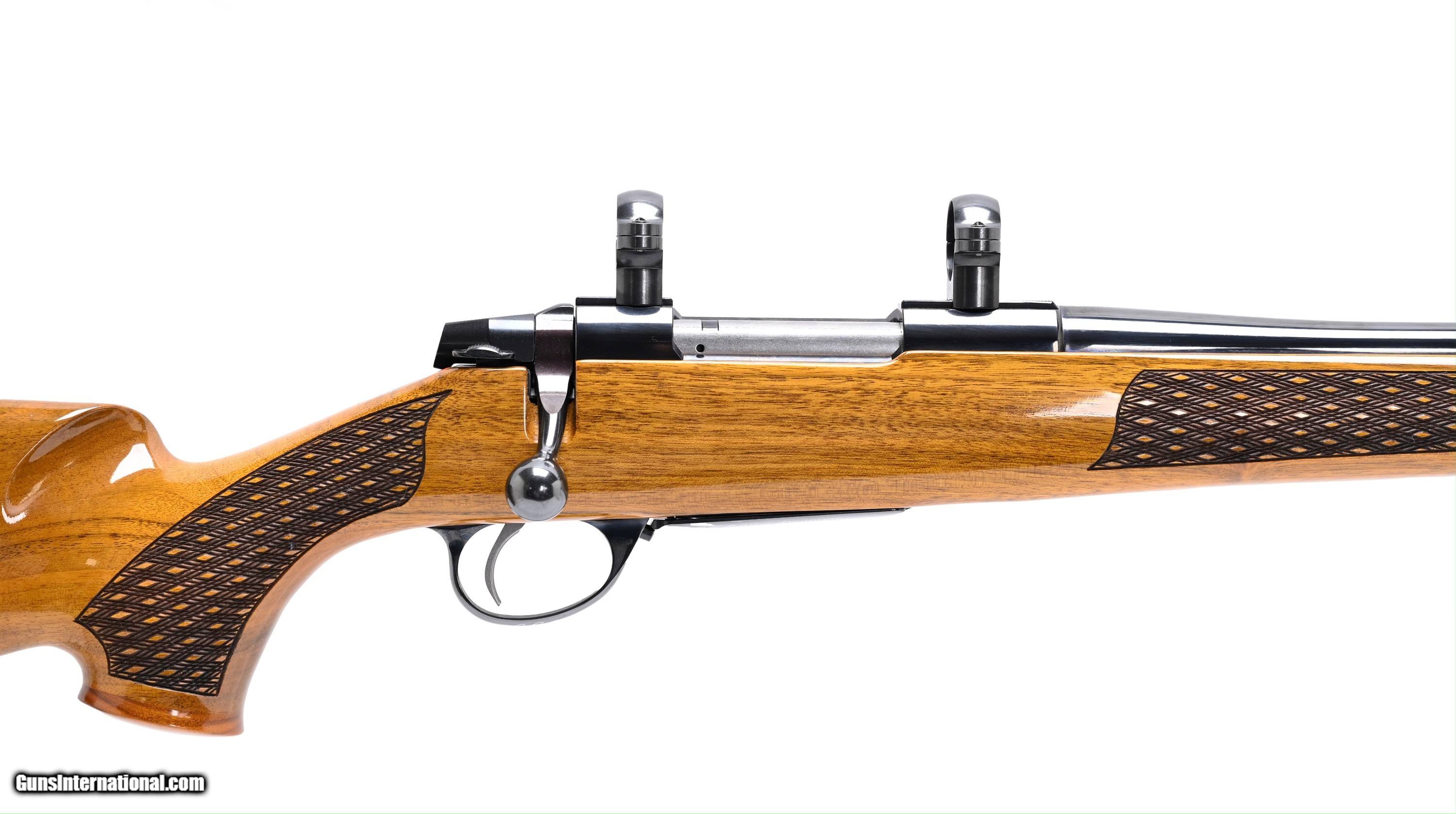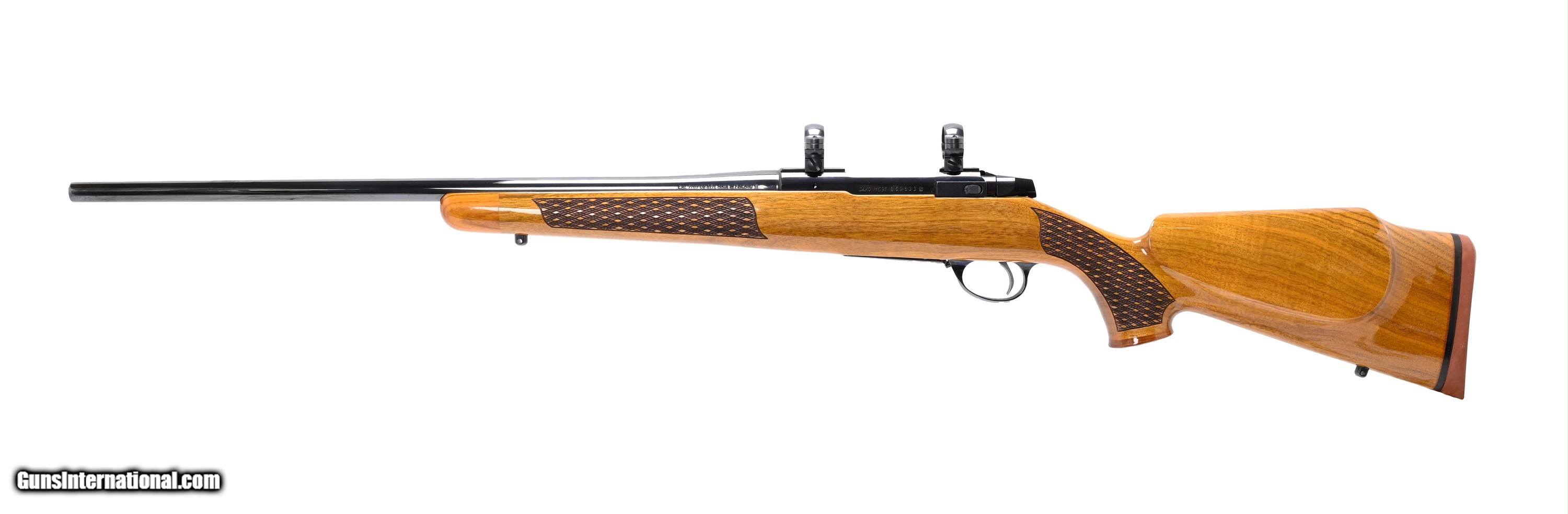 Description: Sako model M591 Deluxe Forester chambered in 7mm-08. This is an absolutely MINT bolt action rifle. It has been fired but there is not a mark on it and it is in the original box with paperwork, sling swivels. Deluxe model has select wood with skip-line checkering, contrasting forearm tip and grip cap. The metal is high polished deep blue and has an engraved floor plate. 22" barrel and comes with a set of 1" Leupold rings. Weighs 7 lbs. 1 oz. SOLD |
