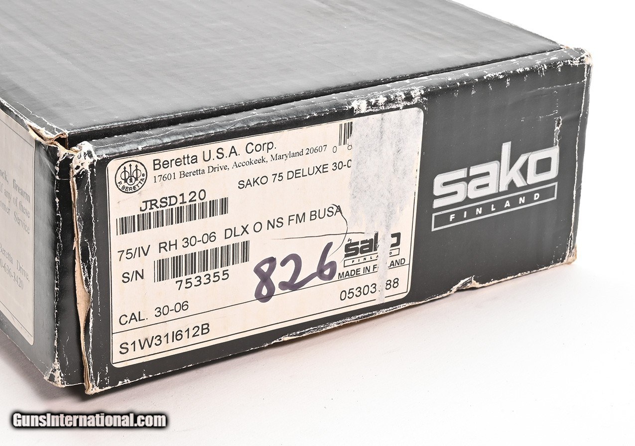 Description: Sako Model 75/IV Deluxe 30-06 RH. Like New In Factory Box AVAILABLE FOR PURCHASE AT OUR ON-LINE STORE The Sako 75 is a bolt-action rifle produced by the Finnish manufacturer Sako. The Sako 75 was named after the 75 year anniversary of Sako in 1996, when the first Sako 75 was made
