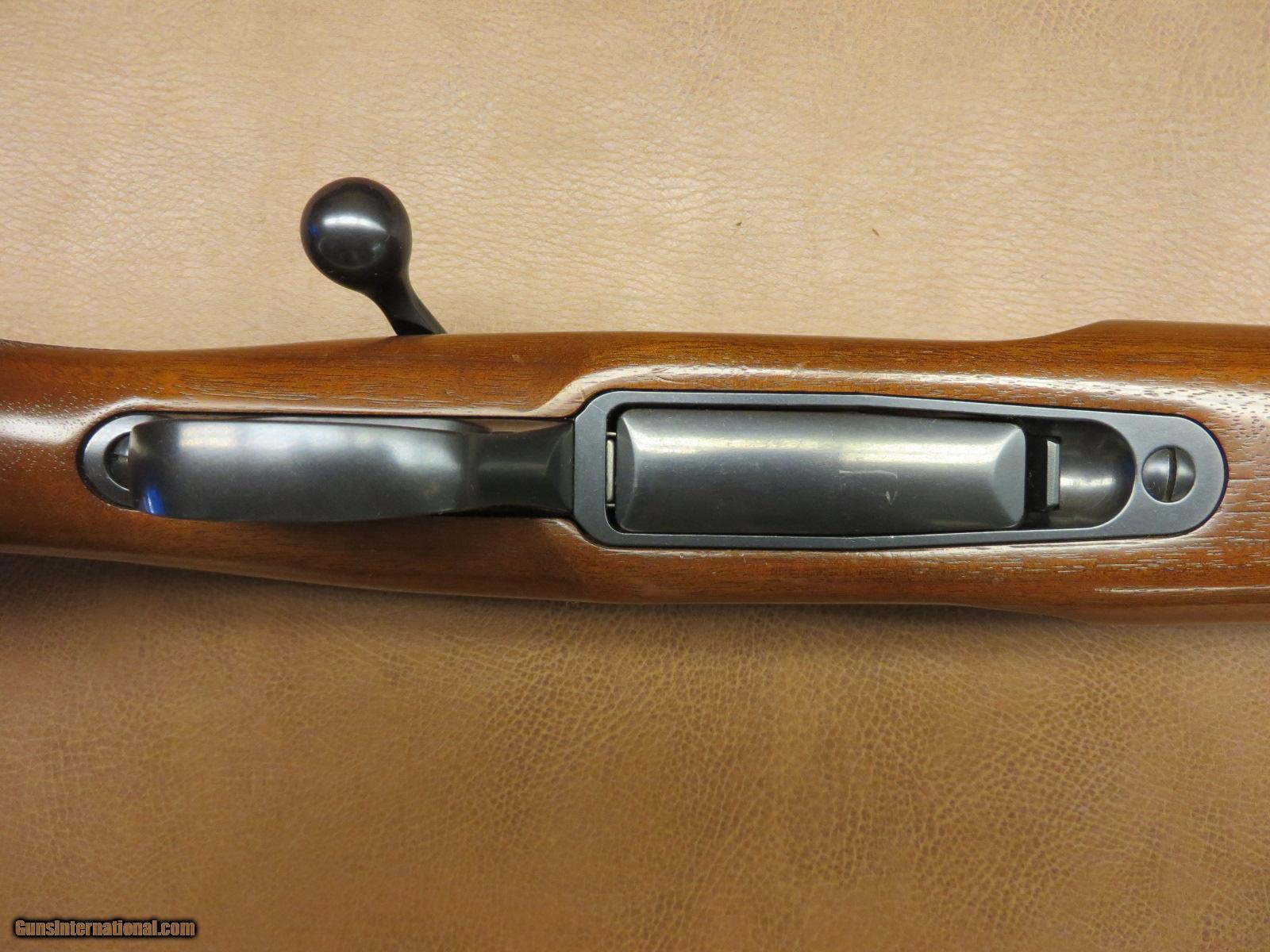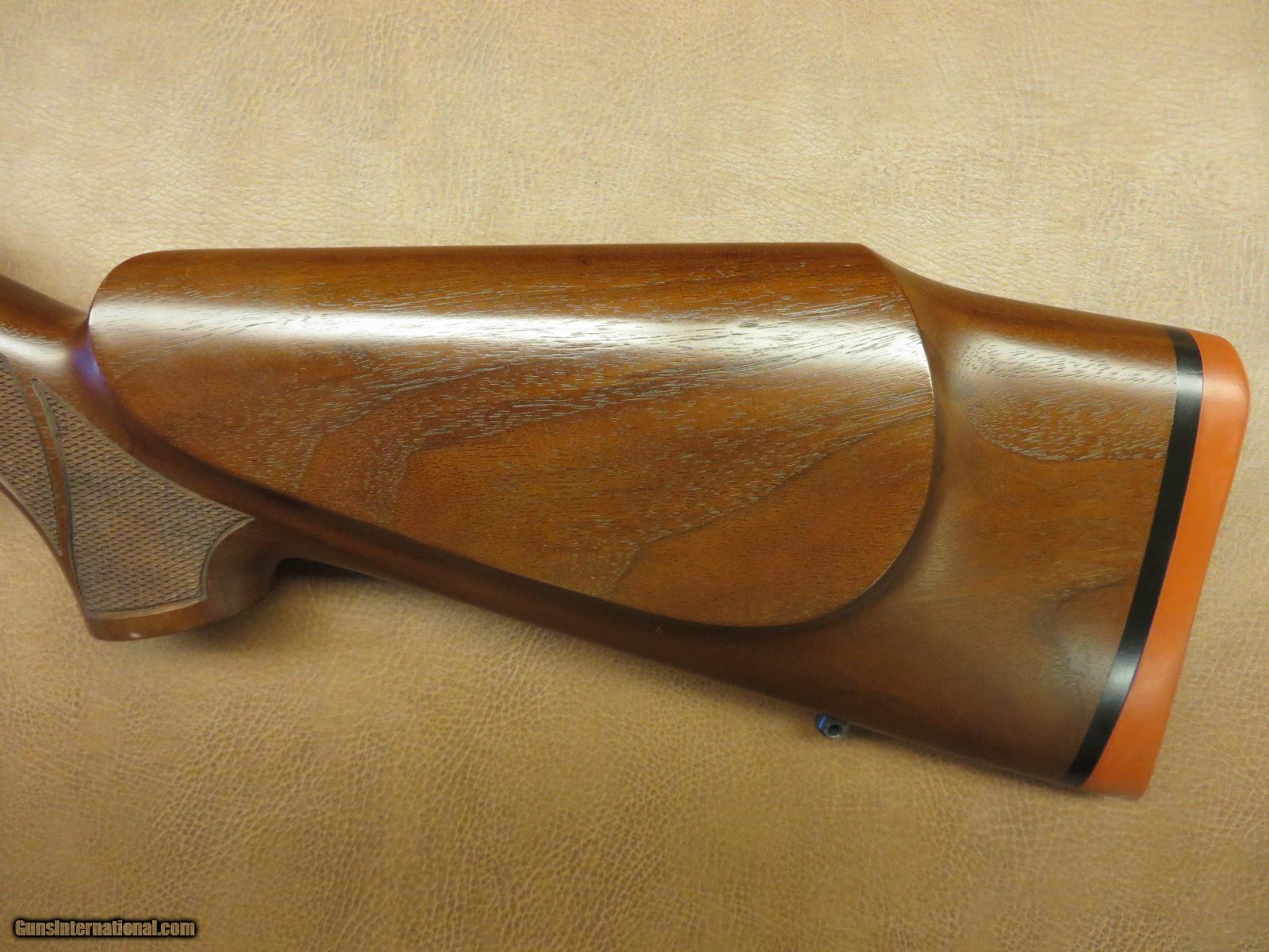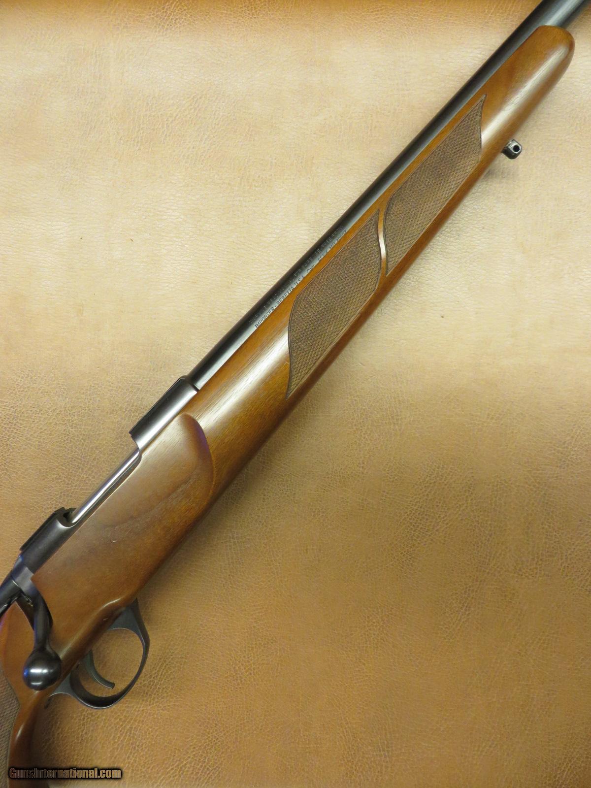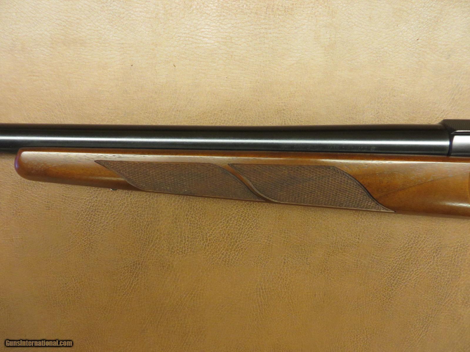 Description: .204 Ruger with 23 1/2 inch heavy barrel. Detachable magazine. Dovetailed receiver for scope mounting. Set trigger. Satin finish checkered walnut stock has palm swell, beavertail forend, cheekpiece, sling swivel studs, and the original rubber butt pad. All 99% condition in original box with sling swivels, lock, and tool. SOLD |