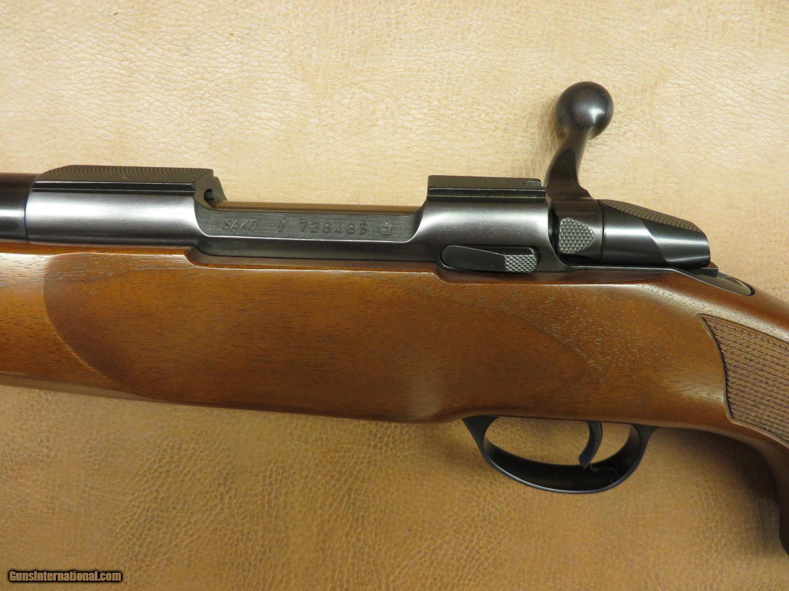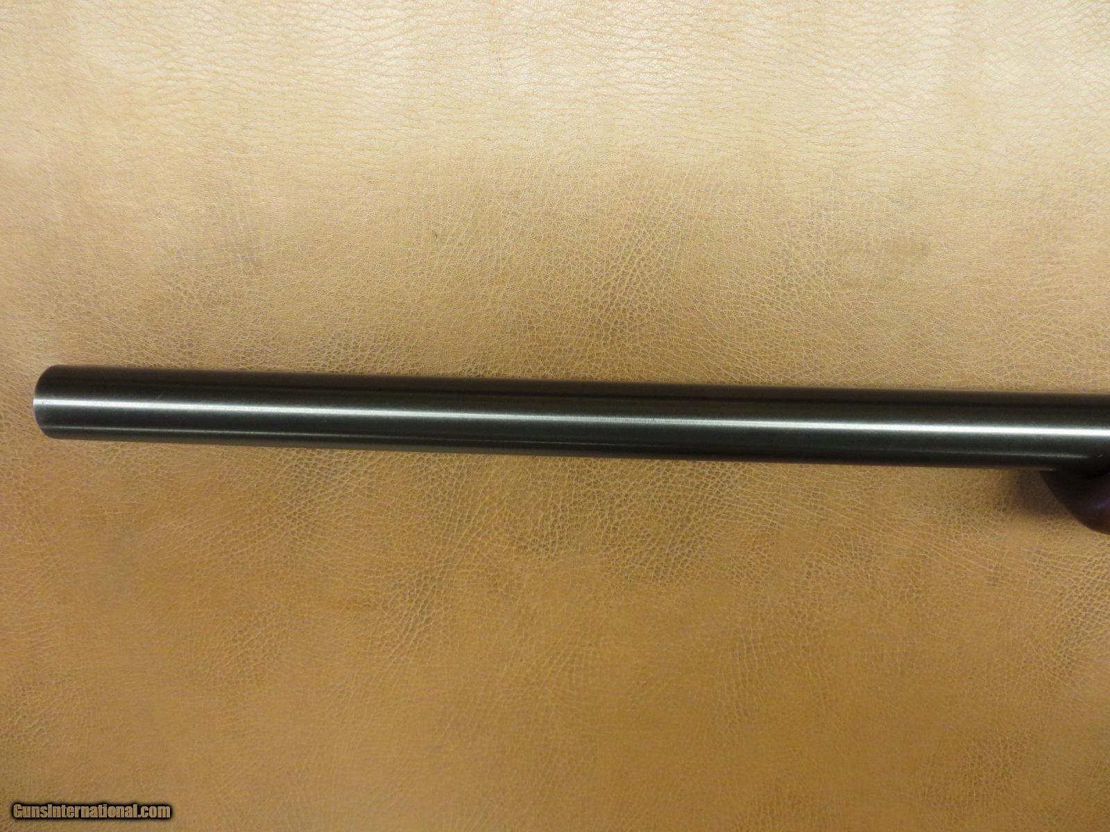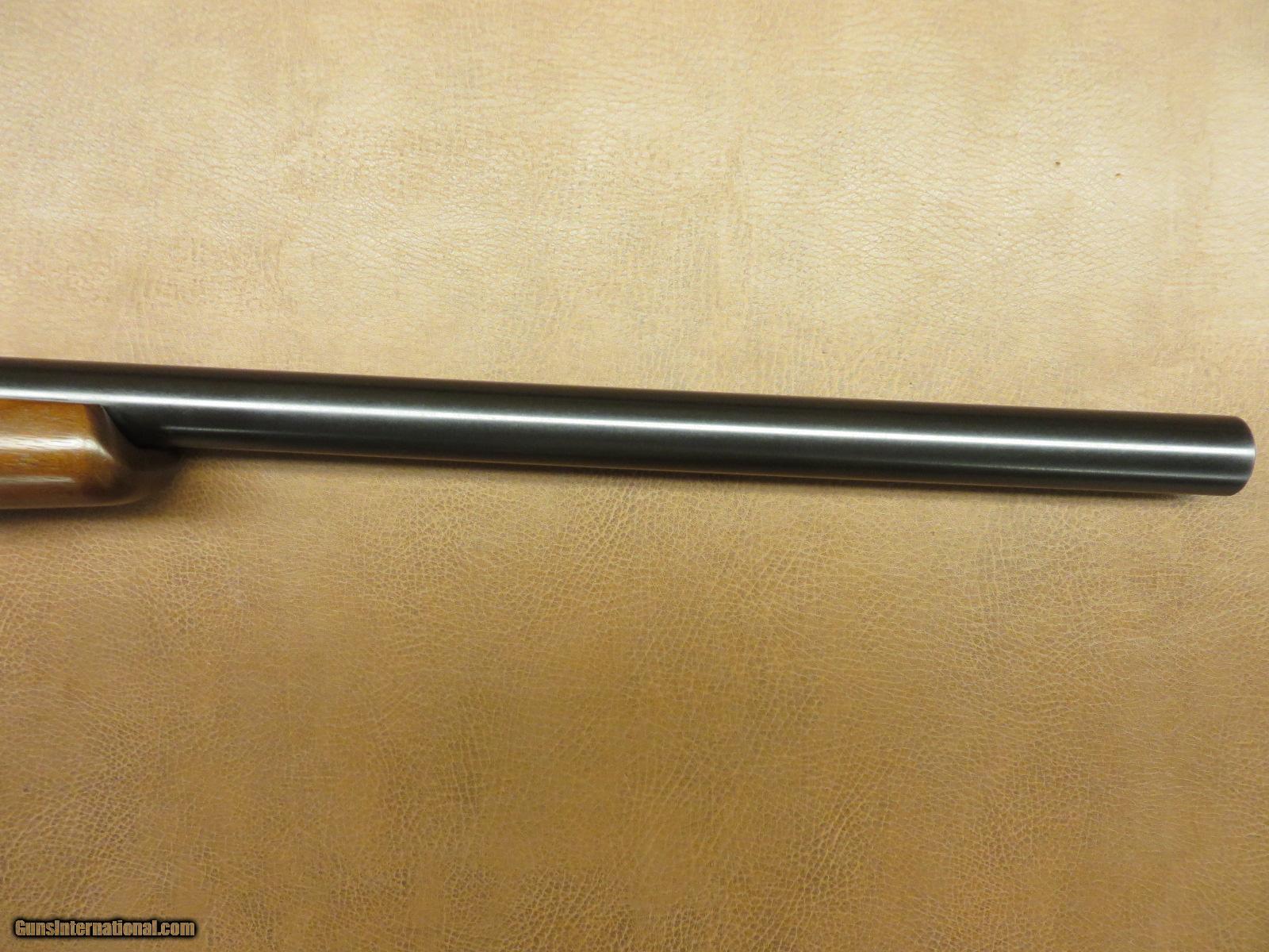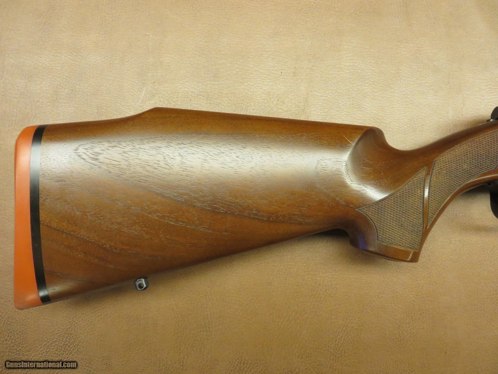 Description: .204 Ruger with 23 1/2 inch heavy barrel. Detachable magazine. Dovetailed receiver for scope mounting. Set trigger. Satin finish checkered walnut stock has palm swell, beavertail forend, cheekpiece, sling swivel studs, and the original rubber butt pad. All 99% condition in original box with sling swivels, lock, and tool. SOLD |