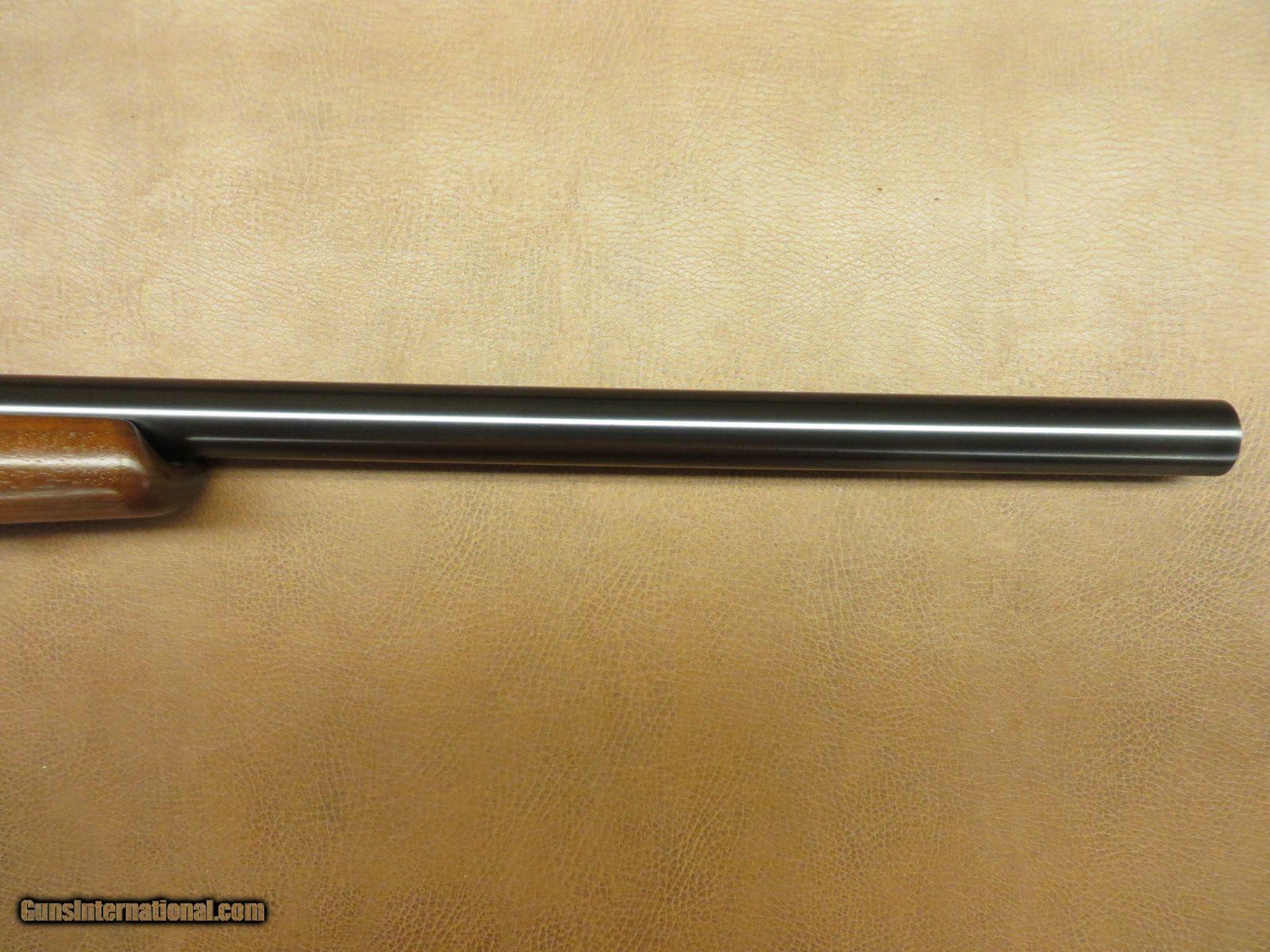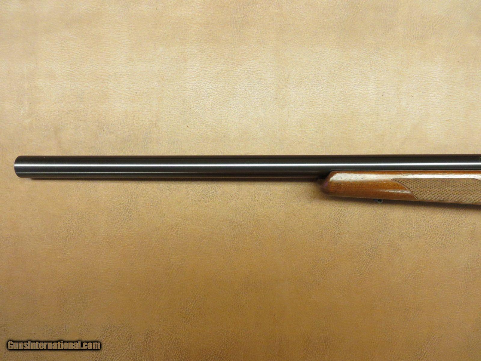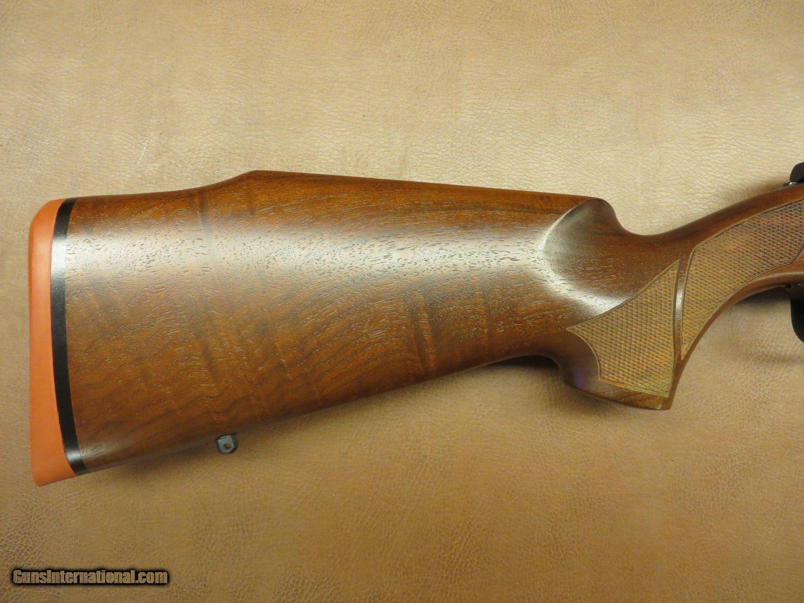 Description: .17 Remington has 23 1/2 inch heavy barrel. Detachable magazine and dovetailed receiver for scope mounting. Satin finish checkered walnut stock has sling swivel studs, cheekpiece, palm swell, beavertail forend, and original rubber butt pad. Serial number 955xxx. All in 99% condition. SOLD |
