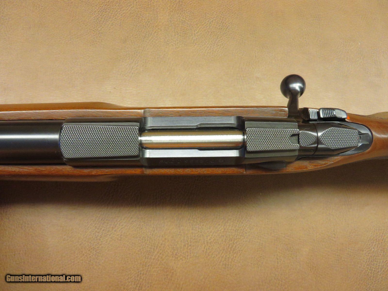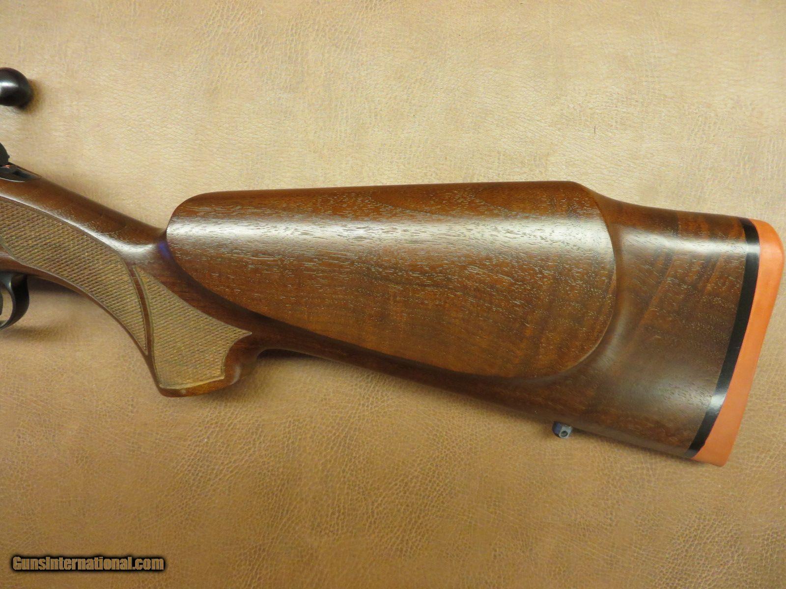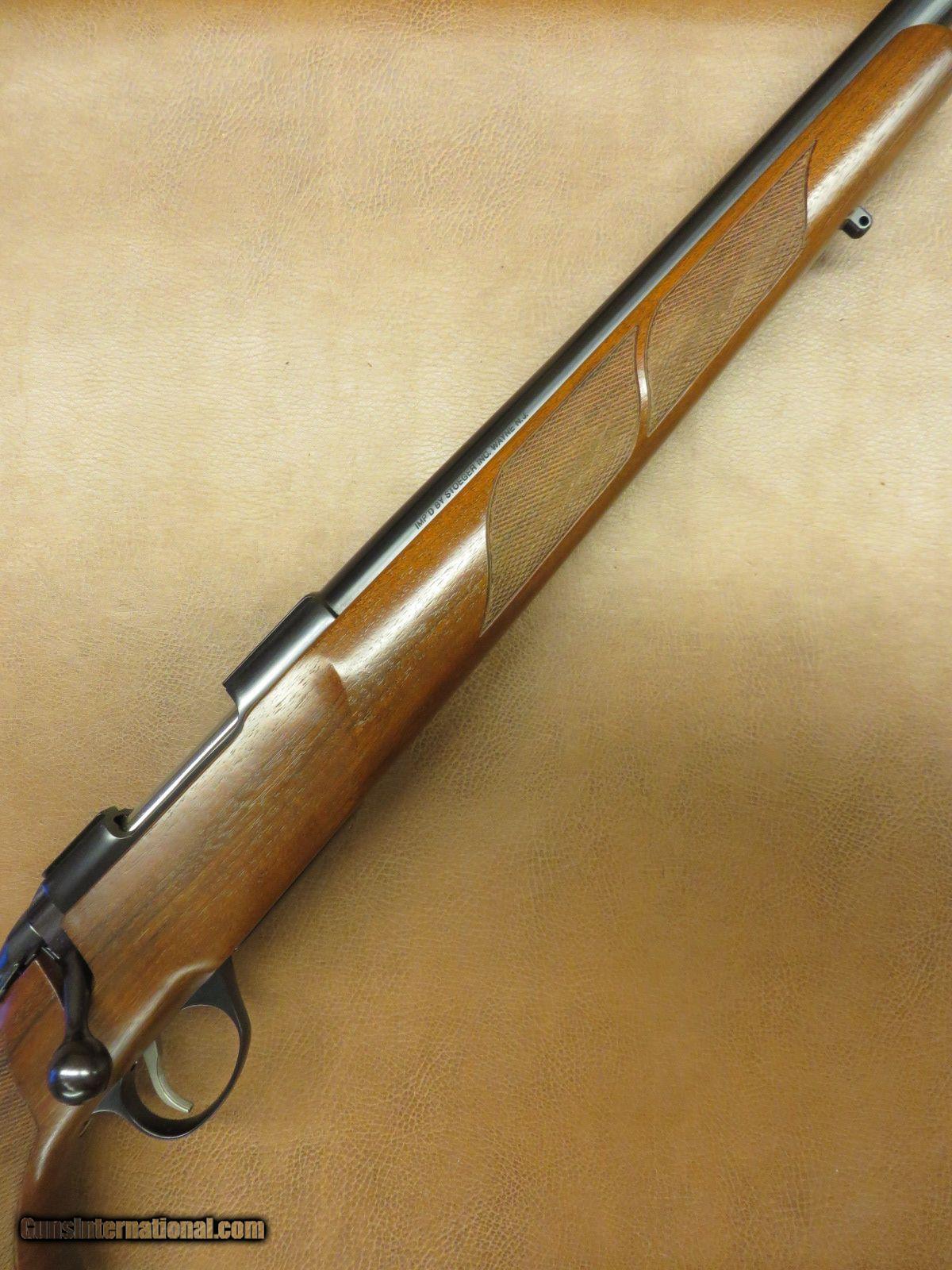 Description: .17 Remington has 23 1/2 inch heavy barrel. Detachable magazine and dovetailed receiver for scope mounting. Satin finish checkered walnut stock has sling swivel studs, cheekpiece, palm swell, beavertail forend, and original rubber butt pad. Serial number 955xxx. All in 99% condition. SOLD |