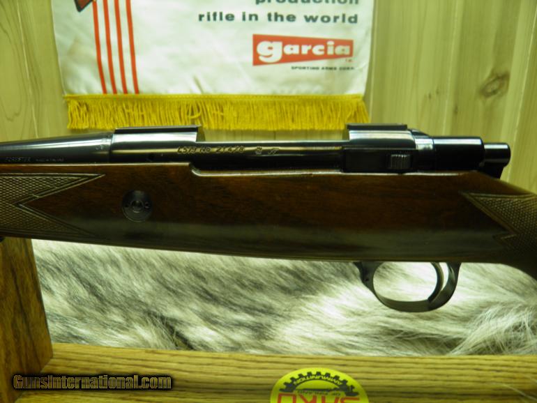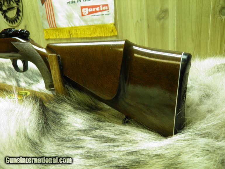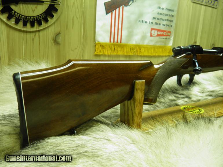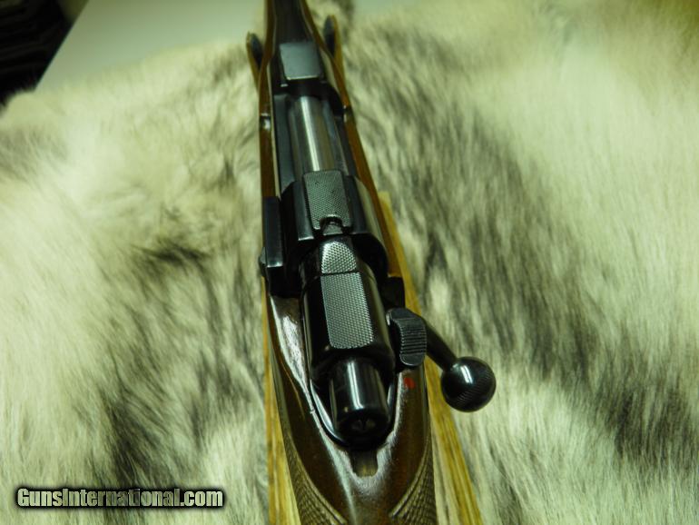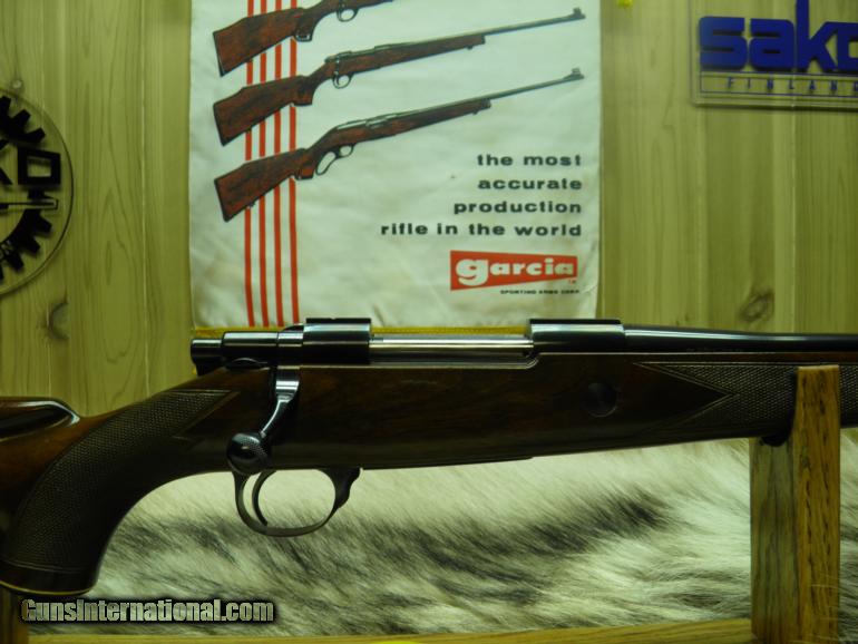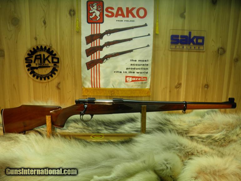 Description: SAKO MODEL L579 FORESTER MANNLICHER CARBINE CAL: 308 MANF: YEAR 1963, BARREL MARKED "BOFORS STEEL", LENGTH 20" WITH A 1-12" TWIST,SIGHTS FRONT RAMPED AND HOODED, APPROX: WEIGHT 7LBS, OVERALL LENGTH IS 39 1/2", LENGTH OF PULL TO FACTORY BUTT PLATE IS 13 1/2", MAGAZINE CAPACITY IS 4 ROUNDS, CLEAN AND CRISP ADJUSTABLE TRIGGER WITH THUMB SAFTEY, RECEIVER HAS TAPERED DOVETAIL RAILS FOR SCOPE RING MOUNTING, EUROPEAN WALNUT STOCK IN THE ELEGANT MANNLICHER STYLE WITH THE GRACEFUL FULL-LENGTH FOREND, MROUNDING OUT THE CARBINES TRADITIONAL STYLING IS A BARREL BAND MIDWAY ON THE FOREND, ATTACHED SWIVELS, NICELY CHECKERED,AND WOOD FINISHED IN GLOSS. BOLT BODY AND GUIDE ARE HIGHLY POLISHED FOR SMOOTH AND EASE OPERATION, METAL SURFACES ARE HIGHLY POLISHED AND THEN DEEPLY BLUED. THE SAKO 20" CARBINE MAKES FOR A LIGHT, FAST SWINGING RIFLE THAT IS A DELIGHT TO CARRY, AND ITS GOT ALL THE ACCURACY OF A FINE SAKO RIFLE! "CONDITION" BEING OVER 50 YEARS OLD, GUN IS 100% ALL ORGINAL, WOOD ONLY SHOWING A FEW SMALL MARKS AND LIGHT SCRATCHES ON TOP OF FINISH, NO CRACKS, OR DEEP MARKS, BLUEING 99%, BORE NICE AND BRIGHT WITH SHARP PRONOUNCED RIFLING, BOLT FACE, BRIGHT AND SHINEY WITH NO MARKS OR WEAR, GUN WAS WELL MAINTAINED! SOLD |