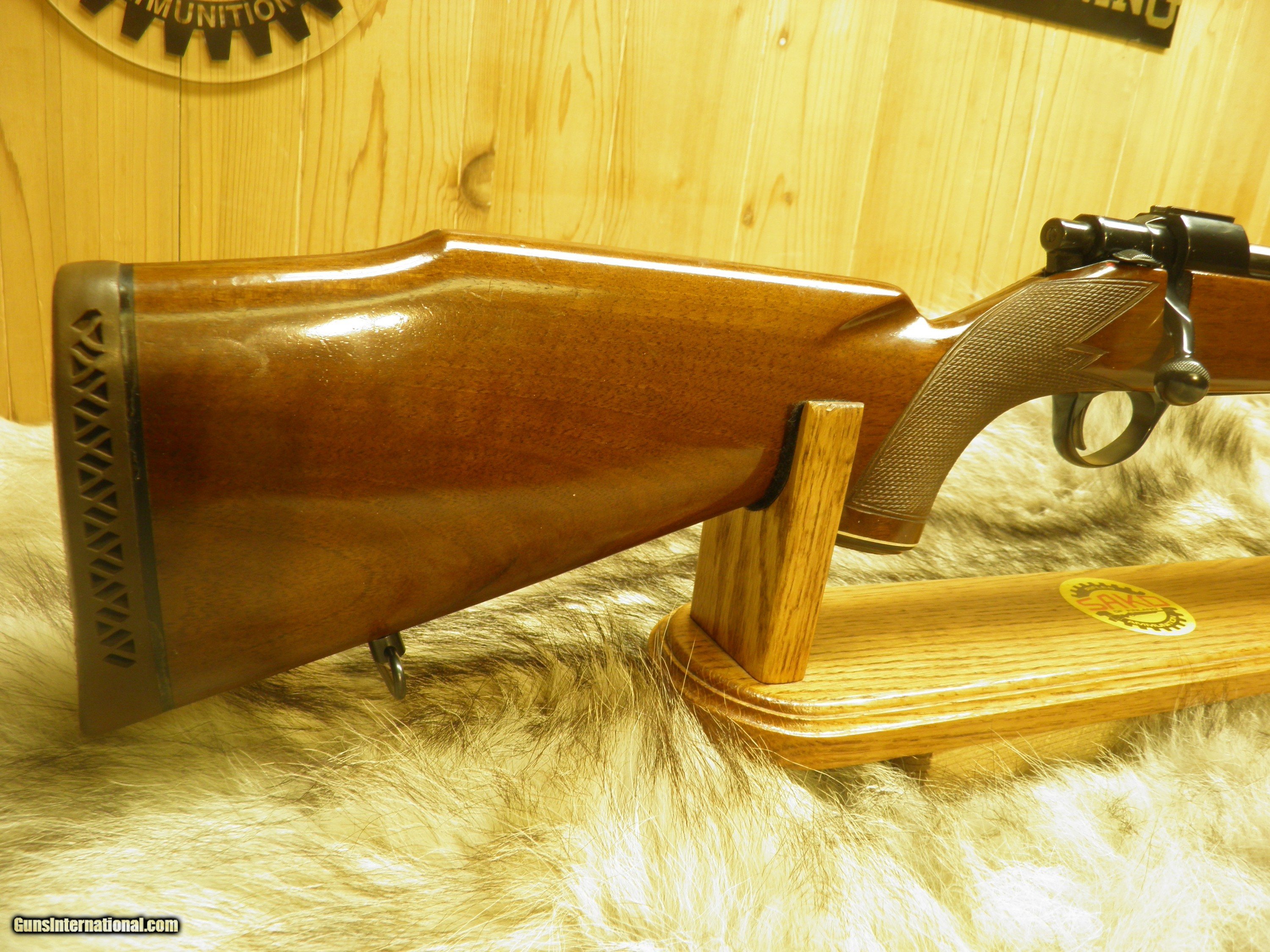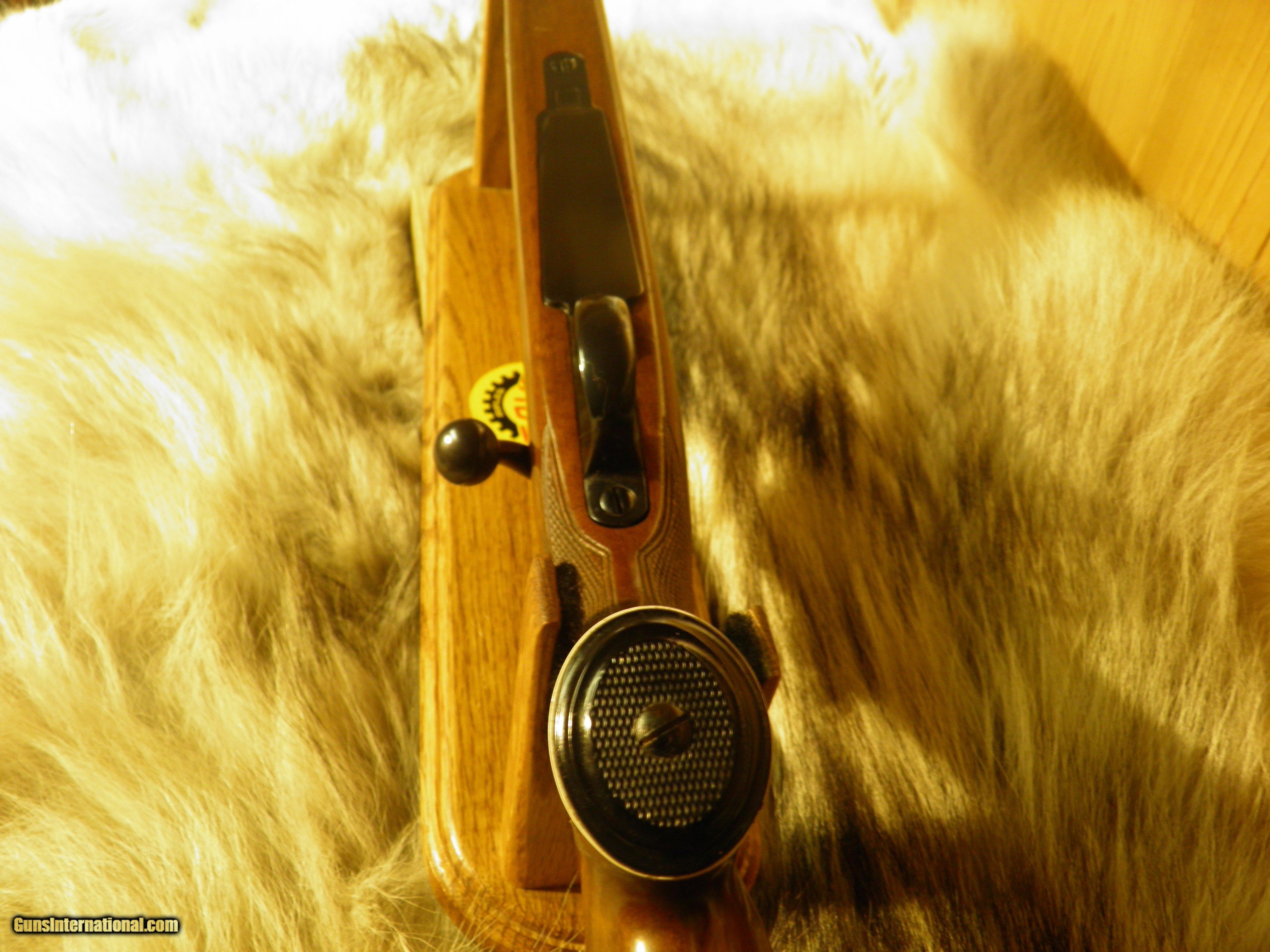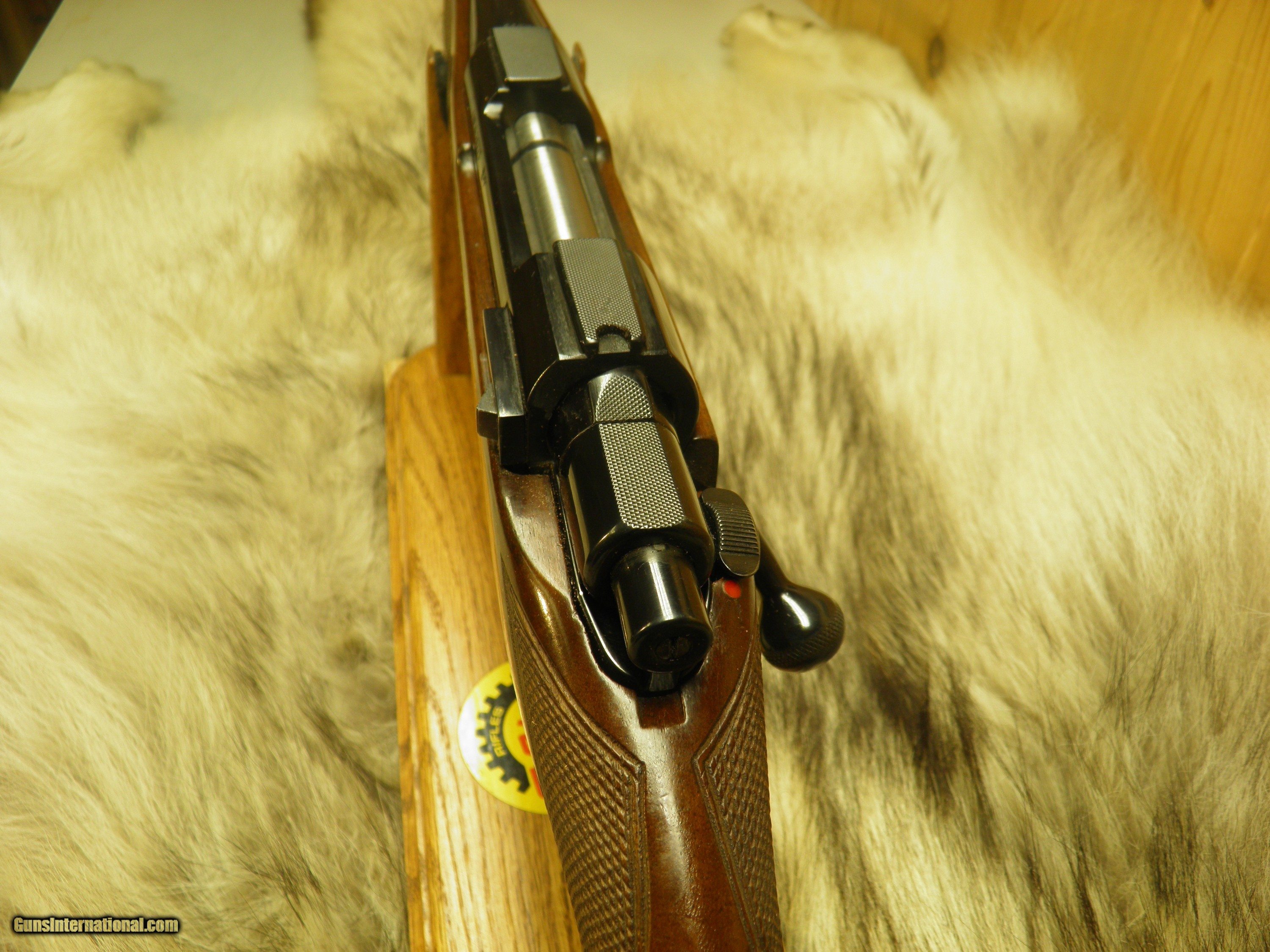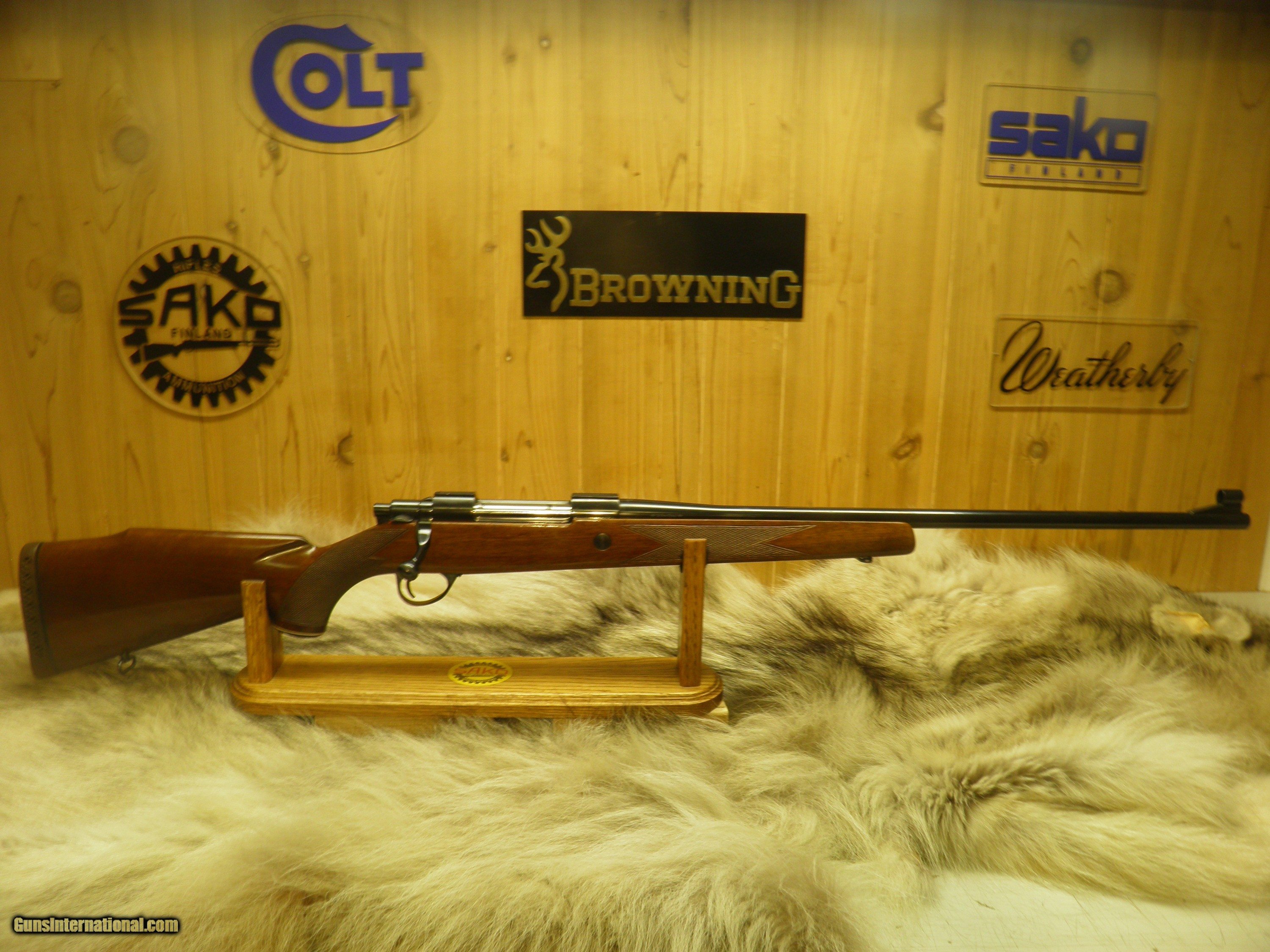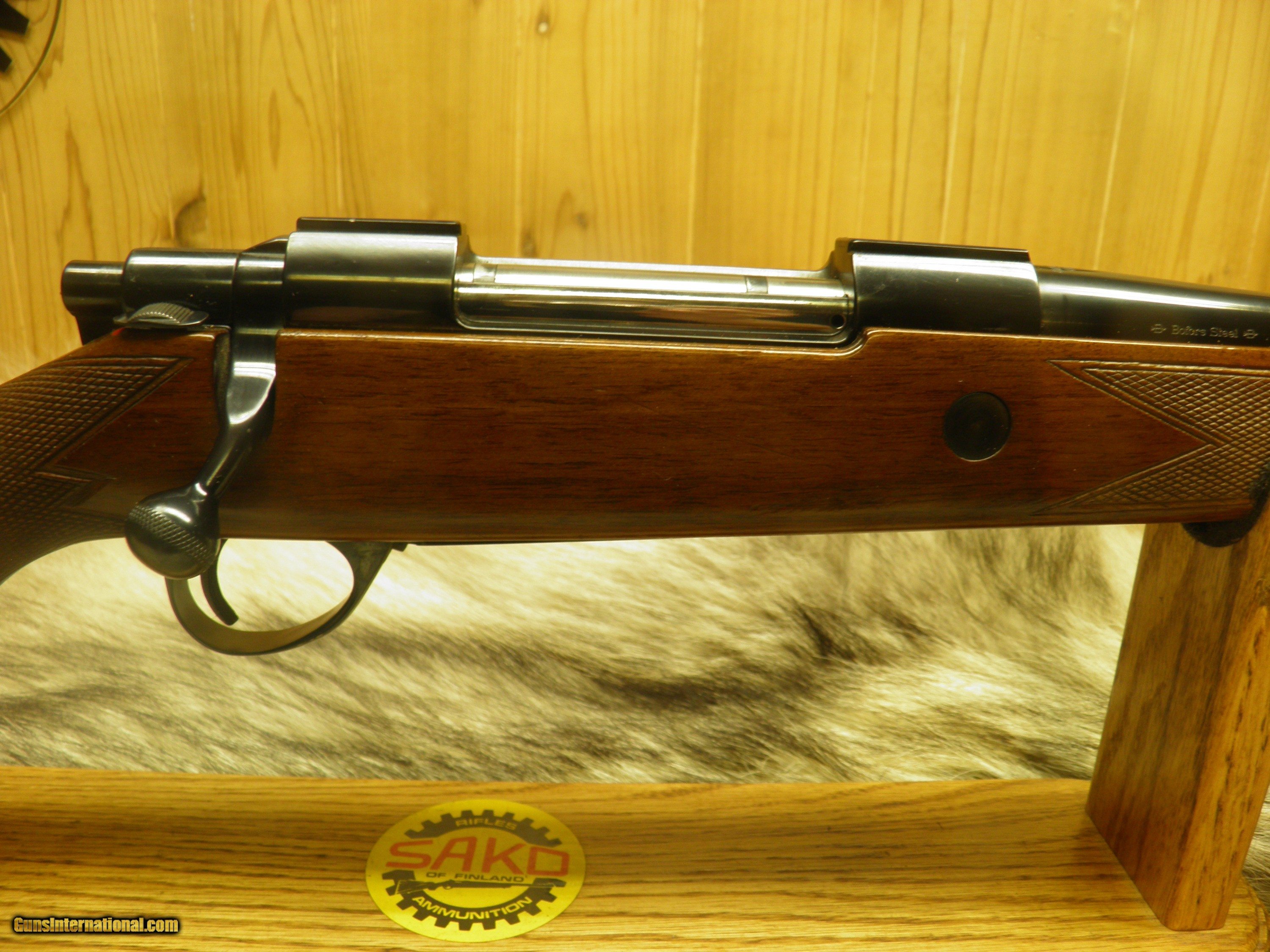 Description: Description: Description: SAKO L61R FINNBEAR STD. GRADE,CAL 270, MANF: 1965, 24" BOFORS STEEL BARREL WITH 1- 10" TWIST, RAMPED FRONT SIGHT AND HOODED, OVERALL LENGTH 44 3/4", APPROXMENT WEIGHT 7 1/2 LBS, LENGTH OF PULL IS 13 3/4",MAGAZINE CAPACITY 4 ROUNDS, CLEAN AND CRISP ADJUSTABLE TRIGGER WITH SLIDING THUMB SAFTEY, INTEGRAL DOVETAIL RAILS FOR SCOPE RING MOUNTING, BOLT HAS 3RD LOCKING LUG, BOLT AND BOLT GUIDE ARE HIGHLY POLISHED, FOR SMOOTH AND EASE OPERATION OF LOADING AND EXTRACTION, STEEL TRIGGER GUARD WITH HINDGED FLOORPLATE ,, EUROPEAN WALNUT WITH MONTE- CARLO, CHEEK-PIECE, WITH PISTOL GRIP, HAND CUT, CHECKERING, ATTACHED SWIVELS, STOCK FINISHED IN A HIGH GLOSS POLYURETHANE, METAL SURFACES ARE POLISHED TO A HIGH GLOSS AND BEAUTIFULLY BLUED. "CONDITION" 99% BLUE, WOOD 97%++, BORE IS NICE AND BRIGHT WITH SHARP PRONOUNCED RIFLING!!THESE EARLY FINNBEARS RIFLES WITH THE BOFORS STEEL BARRELS AND 3RD LOCKING LUG, ARE DRYING UP!! SOLD |