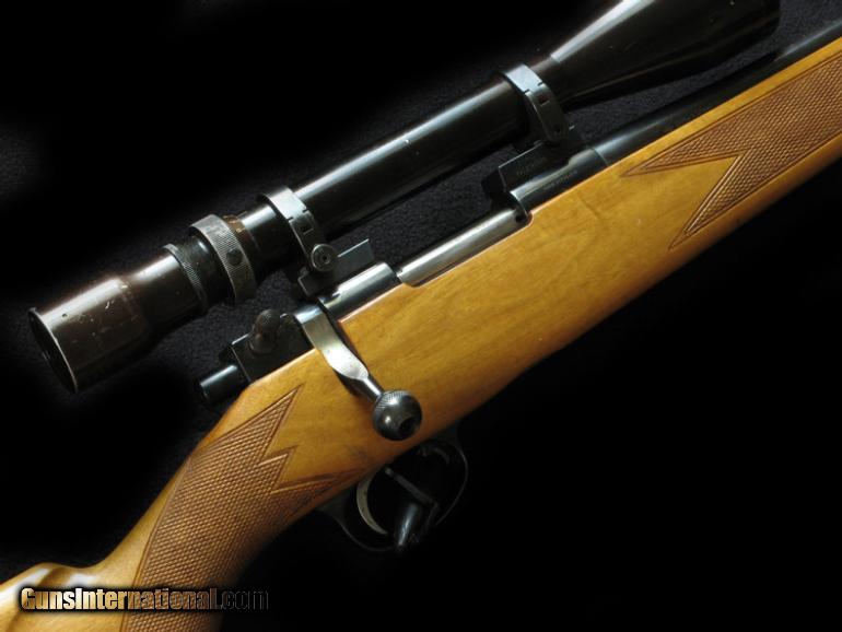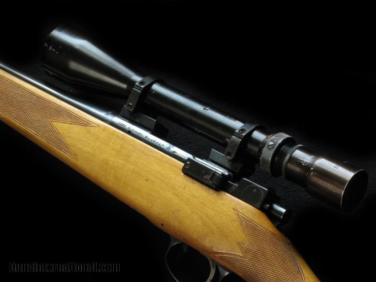Description: Excellent bore and very good wood on this vintage Sako. Sporter weight 24" bbl, w Balvar 8 2.5-8x scope w tapered crosshair, mounted in vintage Leupold adjustable mounts, front sight hood intact. High gloss metal finish with lots of blueing but with some loss of finish due to wear and corrosion esp on trigger guard and trigger. Bolt handle has been ground to clear scope. SOLD |