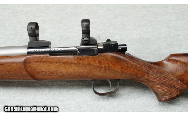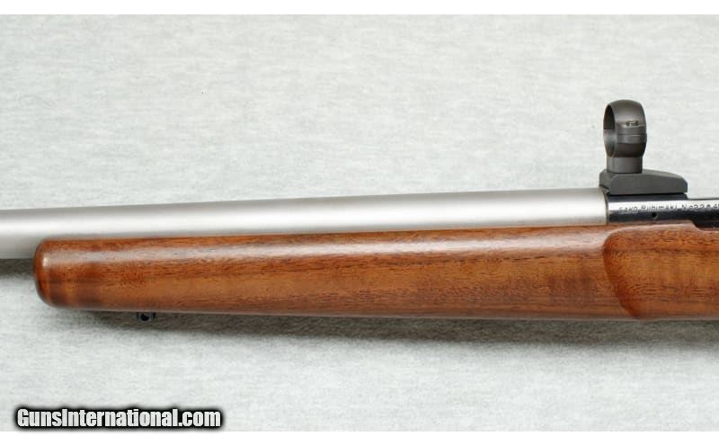 Description: Excellent condition, light wear, few small scratches. Sako bolt action rifle, 23" stainless barrel chambered for .17-222 cartridge. Smooth action, crisp trigger, nicely figured wood with checkered grip and smooth forend. Pachmayr recoil pad, sling swivel mounts and scope rings installed. None SOLD Chambers: Bolt action Metal Condition: Excellent Wood Condition: Excellent Bore Condition: Bright Barrels: 23 Triggers: Factory Stock Dimensions: 13 1/2" LOP Fore End: Smooth Butt Pad: Pachmayr pad Sights: Scope rings installed Item Location: La Vista, NE |