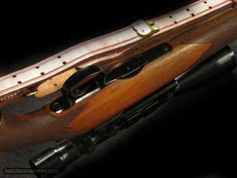 Description: Bottom rifle in photos. Factory stocked Riihimaki Sako with light 24" sporter barrel, good bore. Nicely checkered OEM stock with contemporary high quality sling, one long dent on forend rhs. Scoped with a classic period B&L "Balvar" 2-8x scope in B&L (Kuharsky) adjustable mounts. This allows scope to be quickly switched between rifles with similar mounts without rezero, or detached and remounted. Scope ring screws have slot damage. Light and compact walking varminter, ideal for a youngster. SOLD |