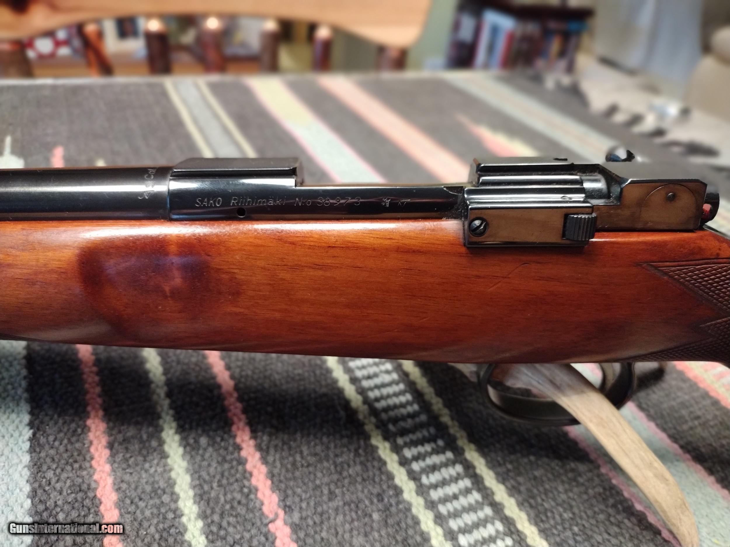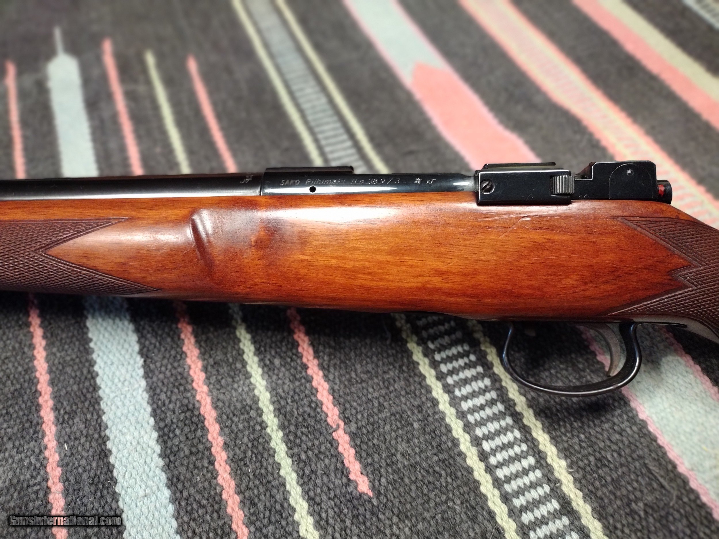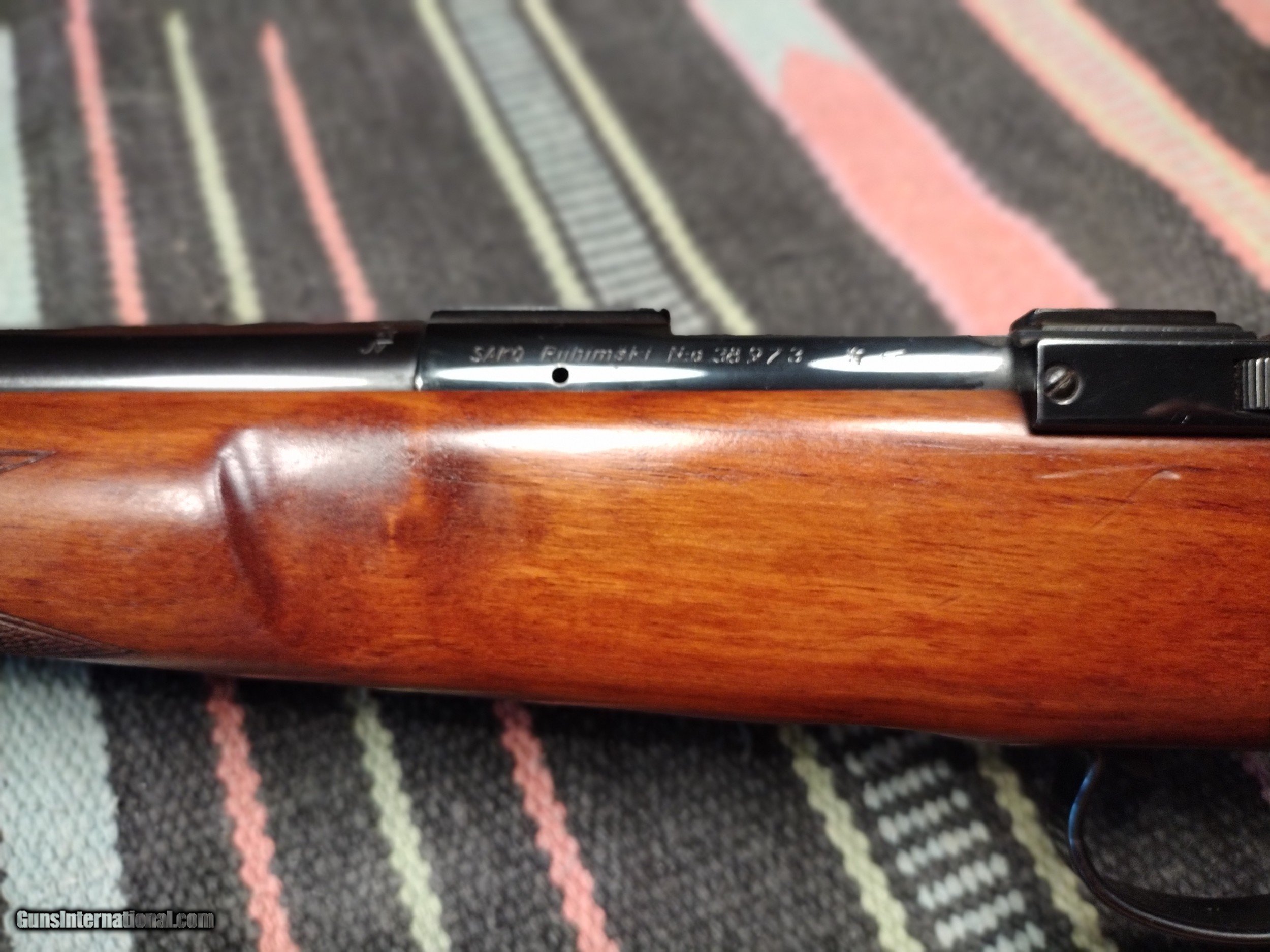 Description: Sako L46 Riihimaki Varmint in super condition in 222 rem one clip included as well as original front sight hood. I think it was built in 1956/57 . Left side of stock behind comb has some impressions. Very nice example. SOLD Curio/Relic: Yes Rifle Caliber: .222 Remington Manufacturer: Sako Model: L46 Vixen Varmint Serial Number: 38973 Barrel Length: 24 Condition: 97% Metal Condition: 99% Wood Condition: 95% Bore Condition: Excellent Action: Bolt Triggers: Factory Stock: Original Finish: Original Finish Sights: Factory Manufacture Date: 1956/57 |