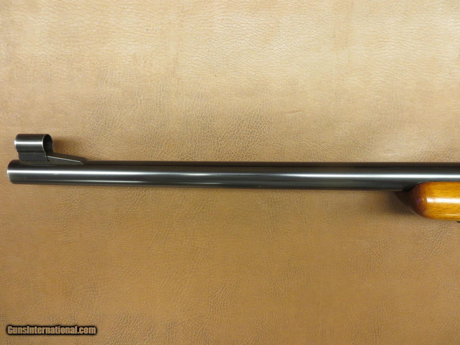 Description: .222 Remington has 23 1/3 inch heavy barrel with original front sight including hood. Serial number 36xxx. Receiver is dovetailed on top for scope mounting and has detachable magazine. Checkered walnut stock has cheekpiece, beavertail forend, pistol grip cap, and original butt plate. Sling swivel in butt and quick detach stud in forend. Blue is 97% and the wood is 90-95%. SOLD |