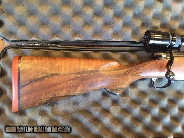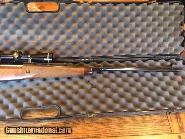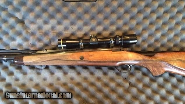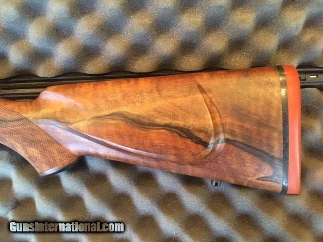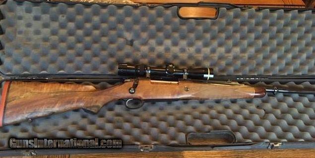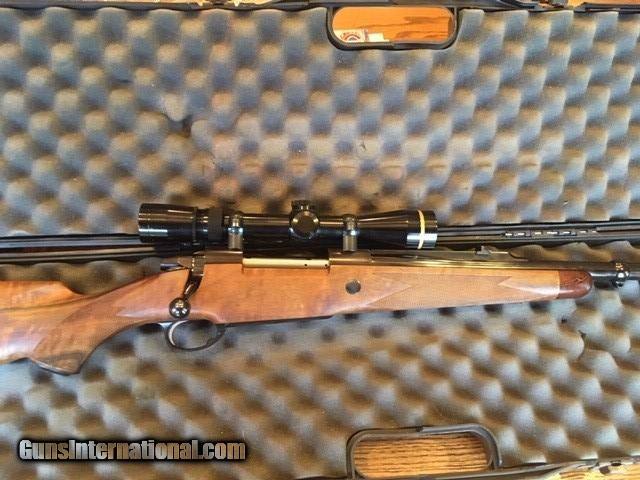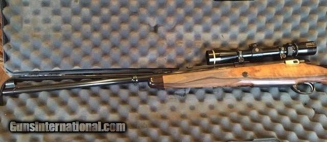 Description: Sako Safari in 338 Winchester Magnum. Beautiful streaked walnut stock with cheekpiece and rosewood fore end tip. Gloss blue 23.5 inch barrel, quarter rib, drop box, and barrel band. Comes with a rare brand new matching gloss Leupold 2.5x8 VX3i ordered from Leupold's custom shop mounted in matching Leupold rings. Priced for quick sale at $2950 plus shipping. Cell 703-554-2797 EST SOLD |