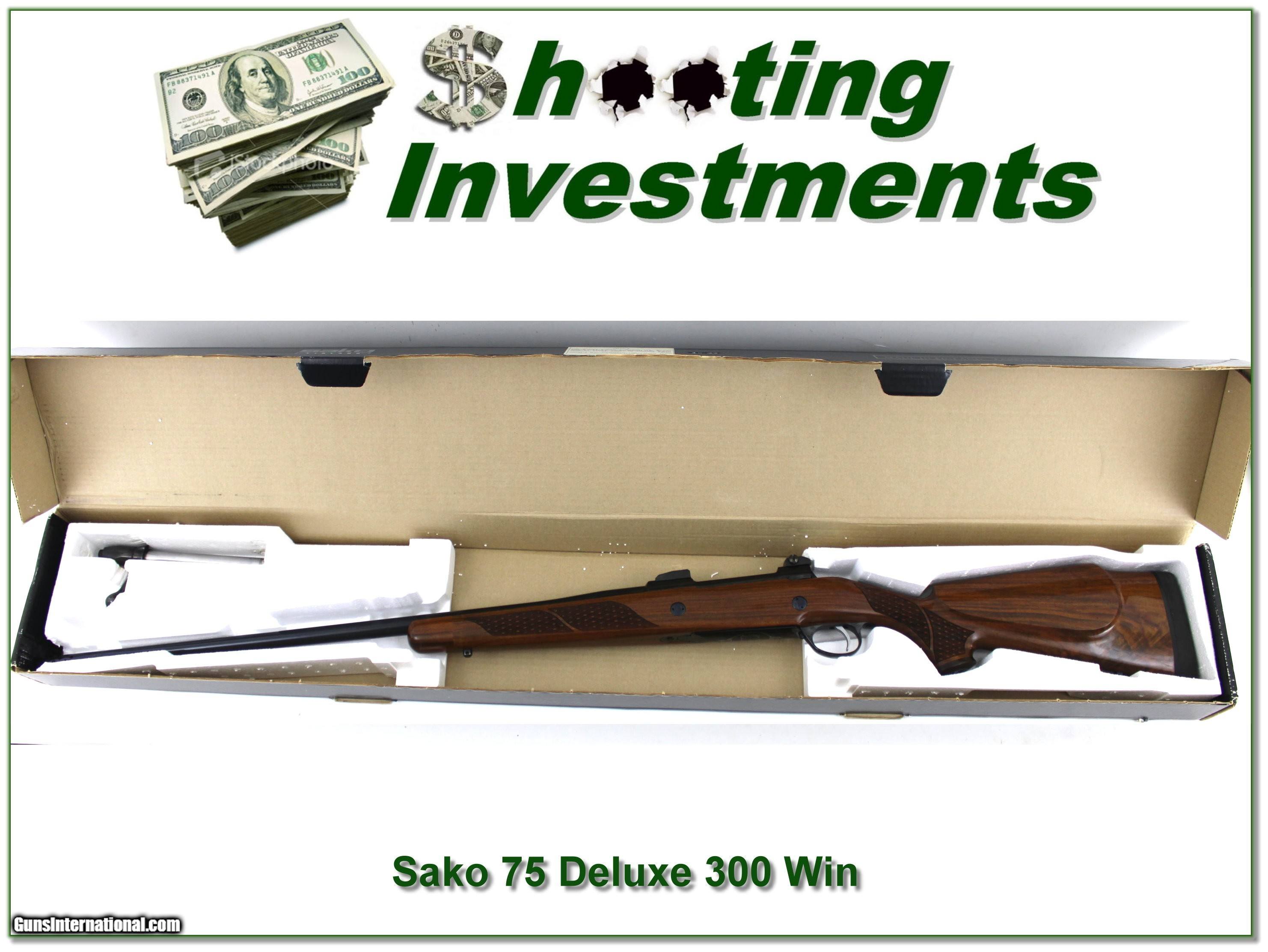 Description: Collectors and big game hunters, this is a beautiful Sako 75 Deluxe in the hard hitting 300 Winchester Magnum! I find no marks on the metal or the wood. It has beautiful walnut as seen. It has a 26in barrel including the added 2in break. It comes as seen in factory box (I don’t have the manual). It will make a high-end hunting or find addition to your collection! Shipping and insurance is $49. Please email me with any questions or larger pictures. (Consign your quality firearms with Shooting Investments for only 12%! Let me know if you have any you would like to sell!) 25-0399 Payment: Payment is by Money Order, Cashier’s Check or Personal Check. I can now also accept Credit Cards (MasterCard, Visa, Discover & American Express) with a 3% convenience fee. Shipping: The shipping charge will be listed in each description. It is $49 for most firearms. Some heavy guns or those insured for over $2000 will be higher. Shipments to Alaska and Hawaii are higher because air shipment is required. Most firearms are shipped on Tuesday and Thursday and usually in 5 days of receipt of payment. We package all shipments carefully and insure them. Optics are shipped Priority Mail and most other non-firearm shipments are shipped First Class. Returns: Our return policy is simple. If for any reason you are not pleased with your purchase, you may return your item for a full refund of purchase price. Ammunition cannot be returned. It is important to us that you are happy. Guns cannot be fired or dissembled before returning them and they must be returned in the same condition as received. Notification of a return must occur within 3 days of receipt at your dealer. Shipping, convenience and dealer fees are not refundable and are the responsibility of the buyer. Lay-a-way: If needed, we offer a 60 day lay-a-way option on most firearms. It is 1/3 now, 1/3 in 30 days and 1/3 in 60 days. Lay-a-way firearm sales are final and cannot be returned. If a lay-a-way is not completed the first payment cannot be refunded. Consigning your firearms with Shooting Investments: We will help you get top dollar for your firearms. While most local guns shops charge 20% or more, our fee is only 12% with a minimum of $100. At your local gun shop it might take months to sell. Selling on-line provides instant access to thousands of interested buyers. You won’t find any other on-line dealer willing to sell your firearms for only 12% or listing every gun on 3 separate s. Selling through an House typically costs the seller 15% and the buyer an addition 15% (so 30%) and you have to wait several months to sell and longer to receive funds. If properly priced, we will sell your firearms within a few weeks. Send us an email or give us a call and we’ll explain how easy it is for you to get top dollar. Trading: Trading for us is really just buying your gun to re-sell. If you have a gun you want to trade, please email a picture and we will let you know what we can give for it. You will always get more if we sell it for you on consignment. SOLD |