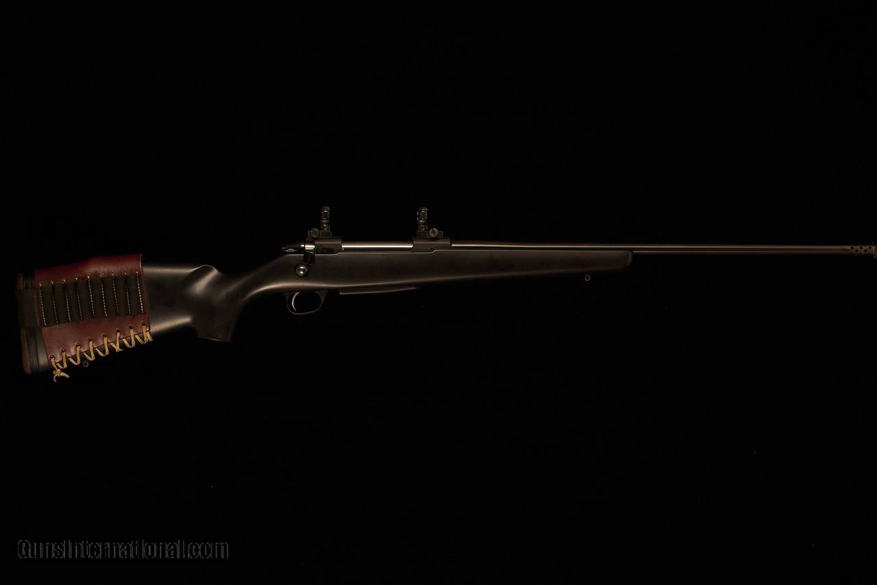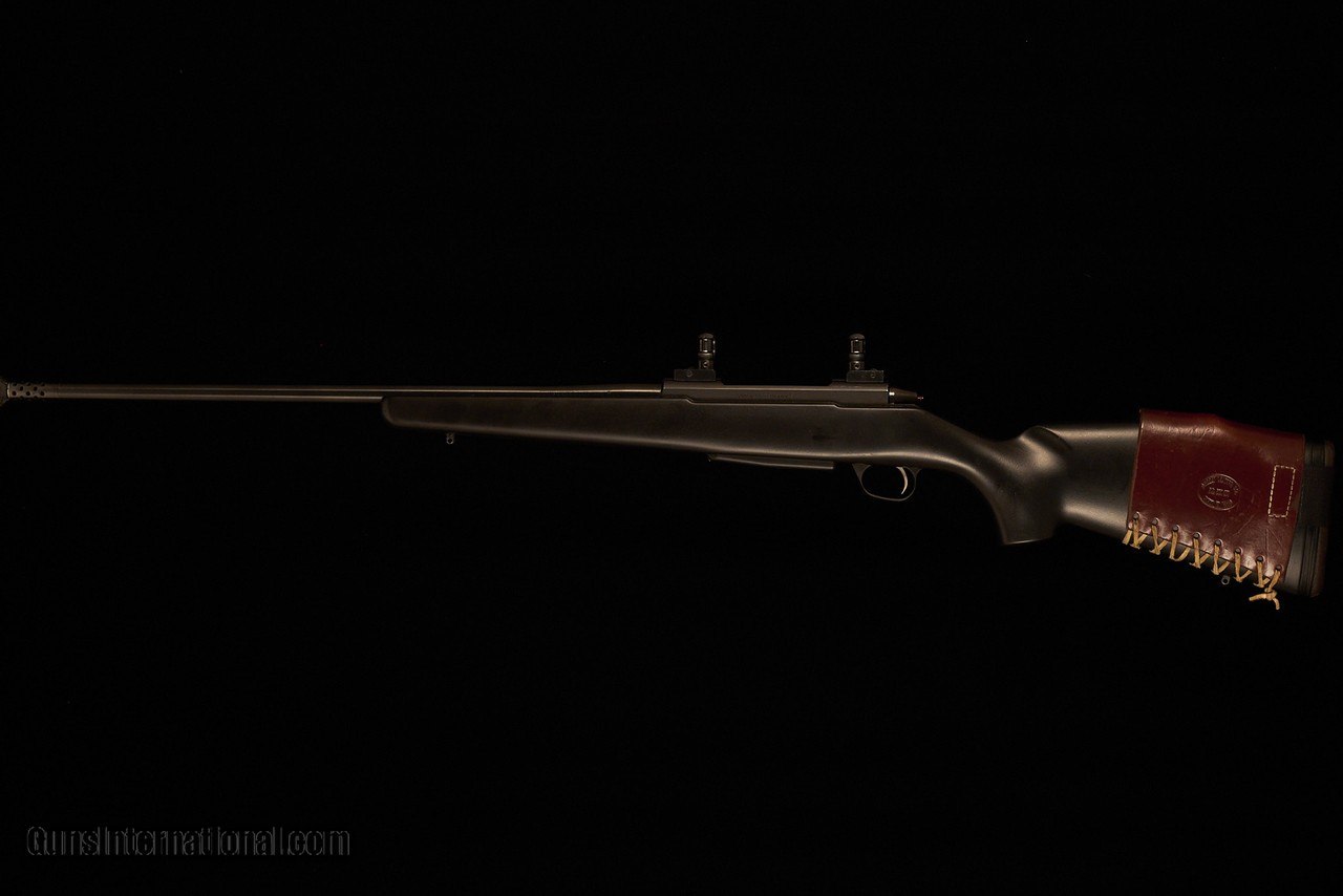 Used Sako M995 (TRG-41 action) in .338 Win Mag with a 22" barrel. Threaded barrel – 23 ½” with the muzzle brake. Metal magazine, sling swivels, leather cheek riser, and a black synthetic stock.