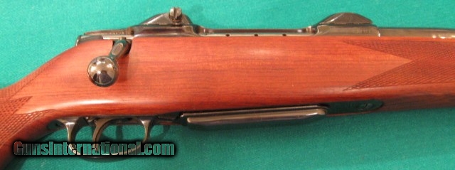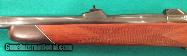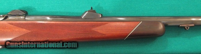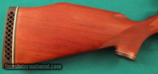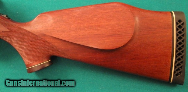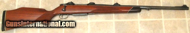 Description: Near mint COLT SAUER GRAND AFRICAN SPORTING RIFLE CAL: 458 WIN: MAGNUM. BARREL LENGTH 24". FULLY ADJUSTABLE REAR SIGHT, APPROX: WEIGHT 9 1/4LBS., OVER ALL LENGTH 43 3/4", LENGTH OFF PULL 13 3/4", MAGAZINE CAPACITY 3 ROUNDS, ADJUSTABLE TRIGGER WITH ROLLAR BEARING SEAR,TANG SAFTEY, LEFT SIDE FRONT OF RECEIVER HAS A LOADED CHAMBER INDICATOR, SUPER NICE FIGURED AFRICAN BUBINGA WOOD STOCK, WITH MONTE-CARLO STYLE CHEEK-PIECE, FITTED ROSEWOOD FOREND TIP AND ROSEWOOD GRIP CAP WHICH HAS COLT MEDALLION INLAY, VERY NICE HAND CUT FINE-LINE CHECKERING. THE REDUCED RECOIL IS DESIGNED AROUND THE COLT STYLE STOCK, AND ALSO THE TWO LUGS UNDERNEATH THE BARREL, METAL SURFACE ARE HIGHLY POLISHED TO A MIRROR THEN BRIGHTLY BLUED TO A HIGH DEEP BLUE LUSTRE. Purchased years ago for African trip that never happened, sitting in safe ever since. $1998 plus $50 shipping for the heavy weight. SOLD |