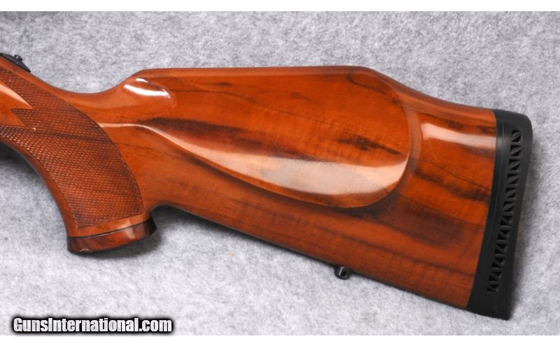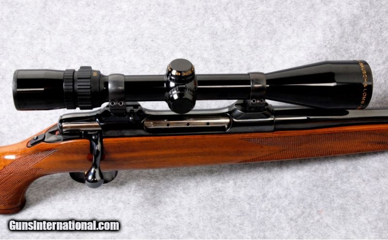 Description: SOLD Caliber Info: .300 Winchester Magnum. Metal Condition: Blue-black receiver and barrel, cocking indicator, rear bolt safety, and removable box magazine. Wood Condition: Very minor mars. Bore Condition: Excellent. Barrels: 26" round barrel with no sights. Triggers: Gold, serrated and adjustable. Stock: Blonde Monte Carlo stock with black streaks, checkered pistol grip, mahogany grip cap and sling stud. Stock Dimensions: LOP: 13 1/2". Fore End: Checkered fore end with a reverse mahogany tip and sling stud. Butt Pad: 1" hard ruber recoil pad. Sights: 2 piece swing-out bases, 1" rings, 3 x 10 Bosch & Lomb Elite 4000 scope. Extras: Comes with the original box. Item Location: Richfield, WI |