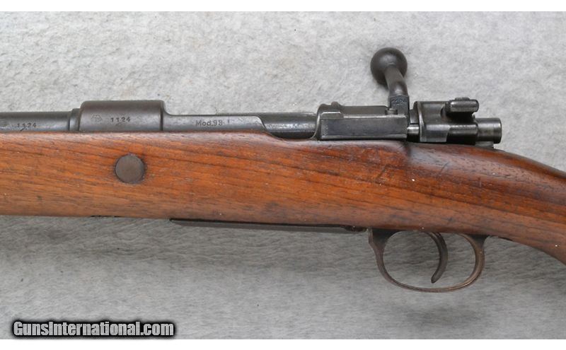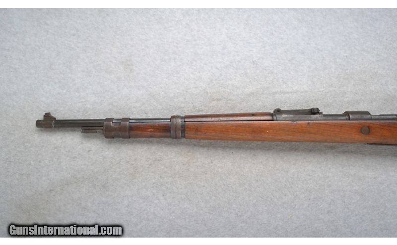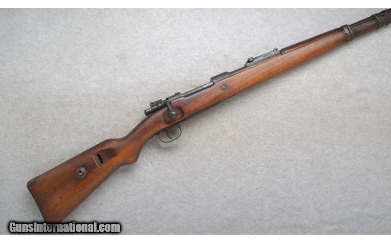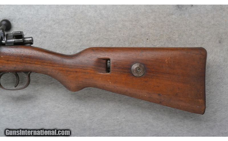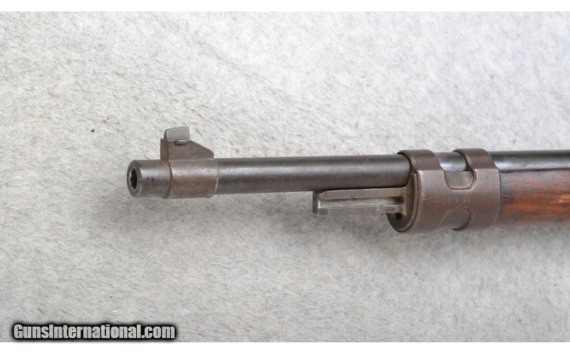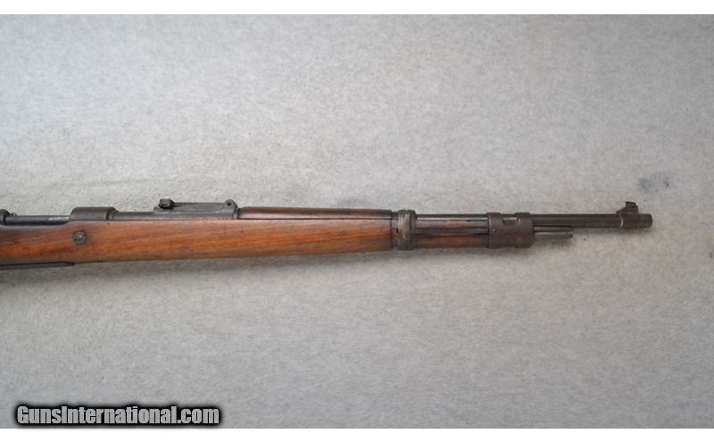 Description: This J.P. Sauer & Sohn Model 98 S/147 1937 is a right hand bolt action rifle in 8mm Mauser Cal. It has a 24 inch barrel. A blade front sight and a numbered sliding adjustable notch middle sight. The butt stock is a smooth grip hardwood pistol grip. The forearm is a smooth grip two piece hardwood. All serial numbers on this gun match except for all on the bolt. Comes with a bayonet. 8mm Mauser SOLD Curio/Relic: Yes Chambers: 5 round internal magazine. Metal Condition: Good. Has freckling and minor rust. Wood Condition: Fair. Has many handling marks and a chip of wood held in place at the top right side butt plate. Bore Condition: Excellent. Barrels: 24 inch. Stock Dimensions: LOP 13 inches. Fore End: Smooth grip two piece hardwood. Butt Pad: Smooth steel plate. Weight: 8 lb. 4 oz. Sights: Raised blade front. Numbered sliding adjustable notch middle. Item Location: Richfield, WI |