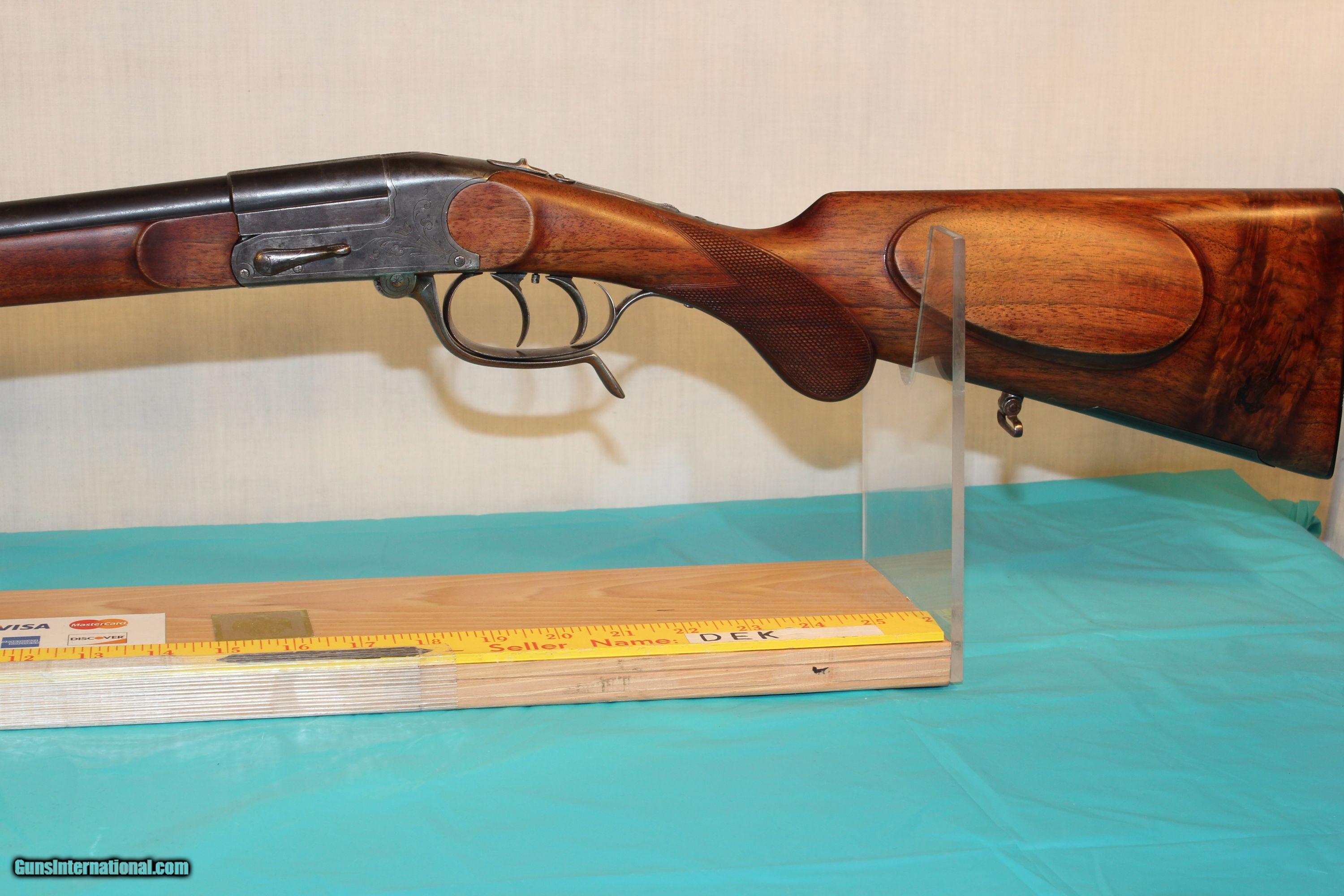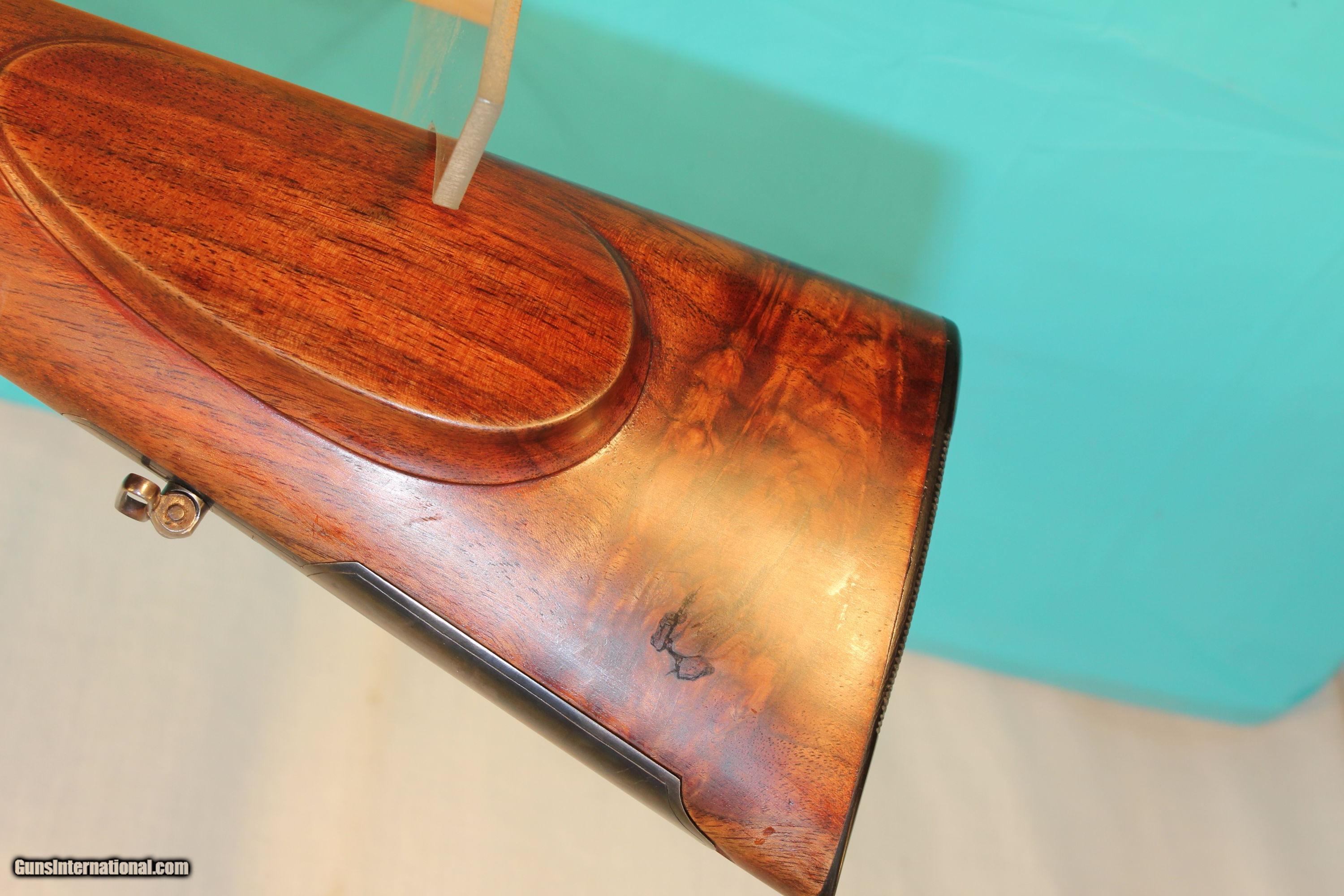 Description: Sauer Tell rifle in 9.3x57R caliber. Leaf sights are marked for 80 and 175 meters. Very good bore with Henry rifling. This is a take down rifle and has excellent wood. Peep sight folds into tang. The gun has double set triggers and sling swivels. There is a trap in the toe of the stock for four cartridges. A very nice rifle that only weighs 5 pounds and 6.5 ounces. 26 3/4 inch barrel. This caliber is also known as the 360 Express and I have 18 new cartridge cases that will go with the gun. Antique. C&R or FFL Shipping and insurance via Priority Mail $30.00 I take plastic for 5% SOLD Curio/Relic: Yes |
