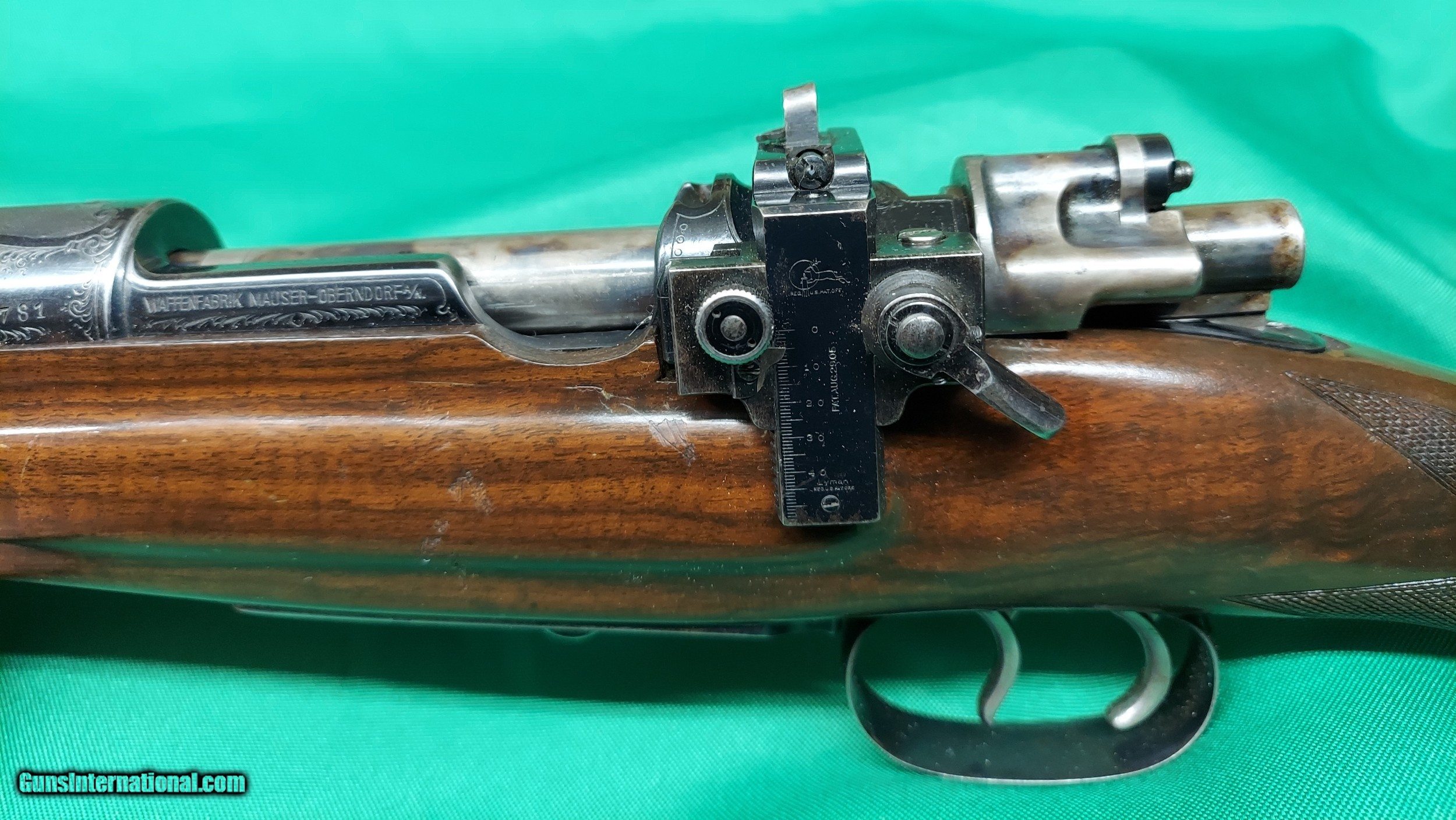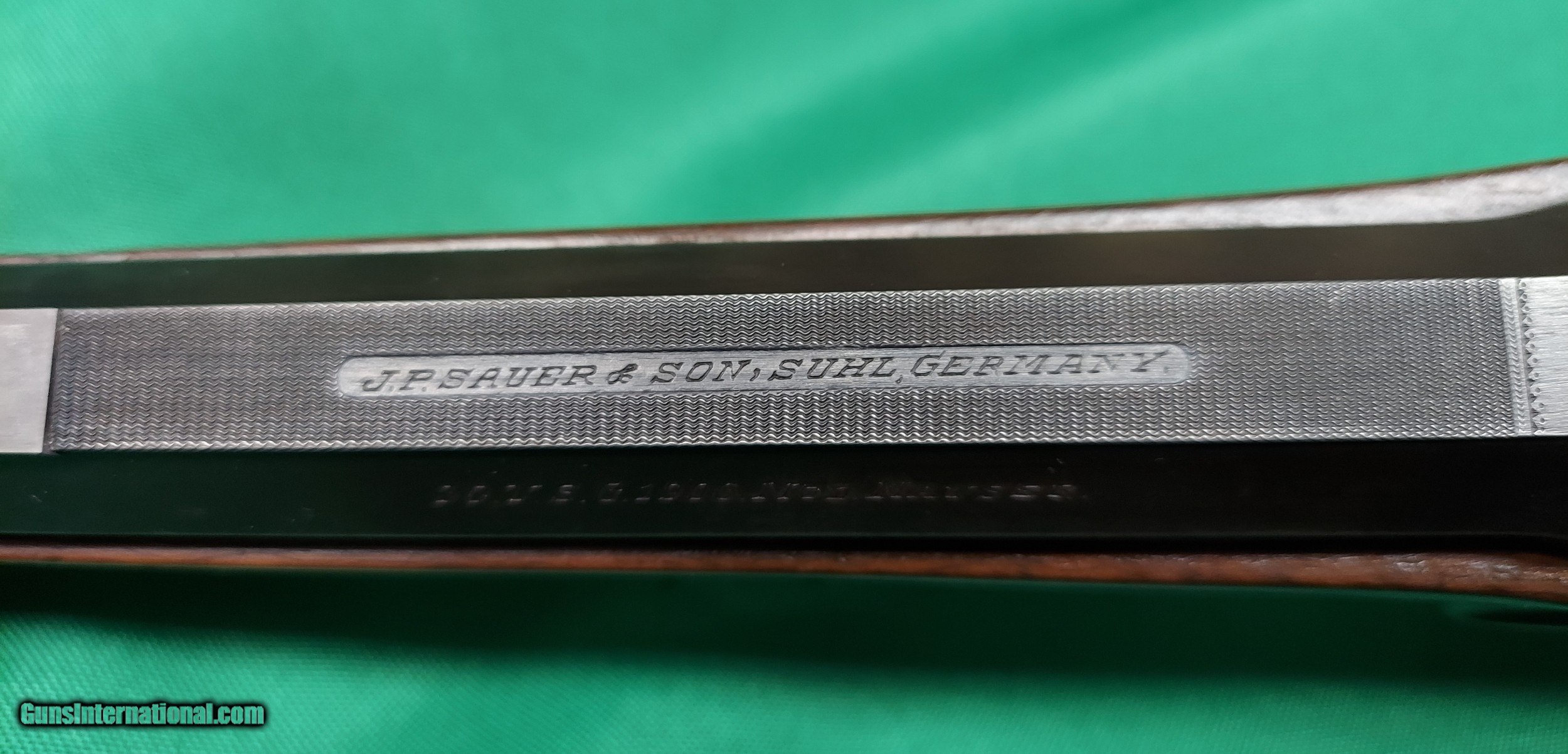 Description: J.P. Sauer & Son 1906 Model Mauser sporting rifle. Made in 1923 it is a factory custom .30-06 built on a 98 military Mauser action. The Mauser action is #80781, and the J.P Sauer serial number is #218937. Barrel is stamped "J.P. Sauer & Son, Suhl, Germany" and “30. US. SG. 1906. Mod. Mauser” and receiver is stamped “Waffenfabrik Mauser-Oberndorf”. It has a 21” barrel that is half octagon and half round with a full rib. The metal work features the engravings of two deer on the trigger guard and floor plate and engravings on receiver and bolt handle. The rifle has the original double set trigger and its original horn pistol grip cap and sling swivels. The receiver sight is a Lyman 35 and is set up for a quicker removal by having its own bolt stop and if you remove the bolt stop and sight, you can then put on the original bolt stop to make way for the scope. Some modifications have been done to the original rifle. The barrel has been drilled and taped for a one-piece Redfield or Buehler scope mount base. The bolt handle has been modified to open so that it will not hit a scope if one is mounted. The original folding sight is missing, and an insert added in its place. A Buehler scope safety replaced the original military safety. The front sight has an insert riser, and an extra bolt stop has been added to the Lyman sight. The original finish on the barrel has about 90% remaining. The stock shows age and wear including dings and scratches. The bore is in good condition, with some pitting, and the rifling is strong. SOLD Manufacturer: J.P. Sauer Model: 1906 Serial Number: 218937 Barrel Length: 21 |