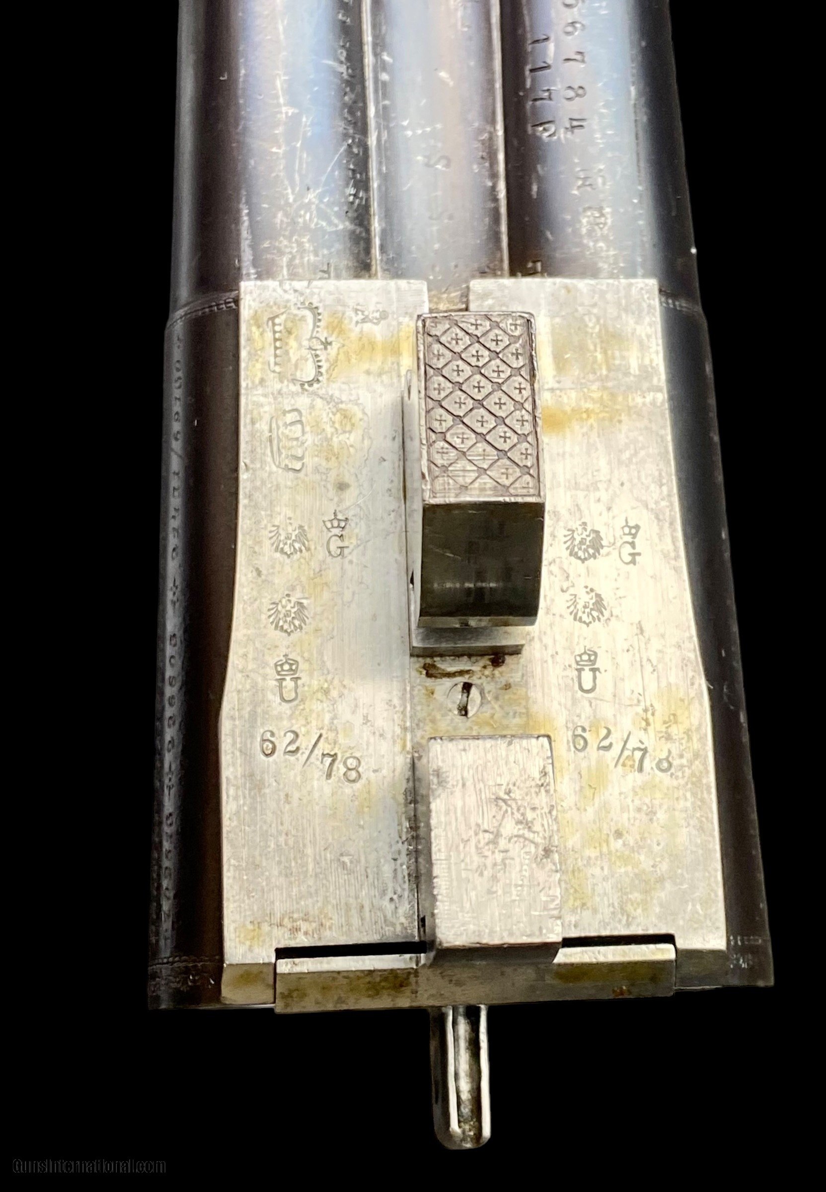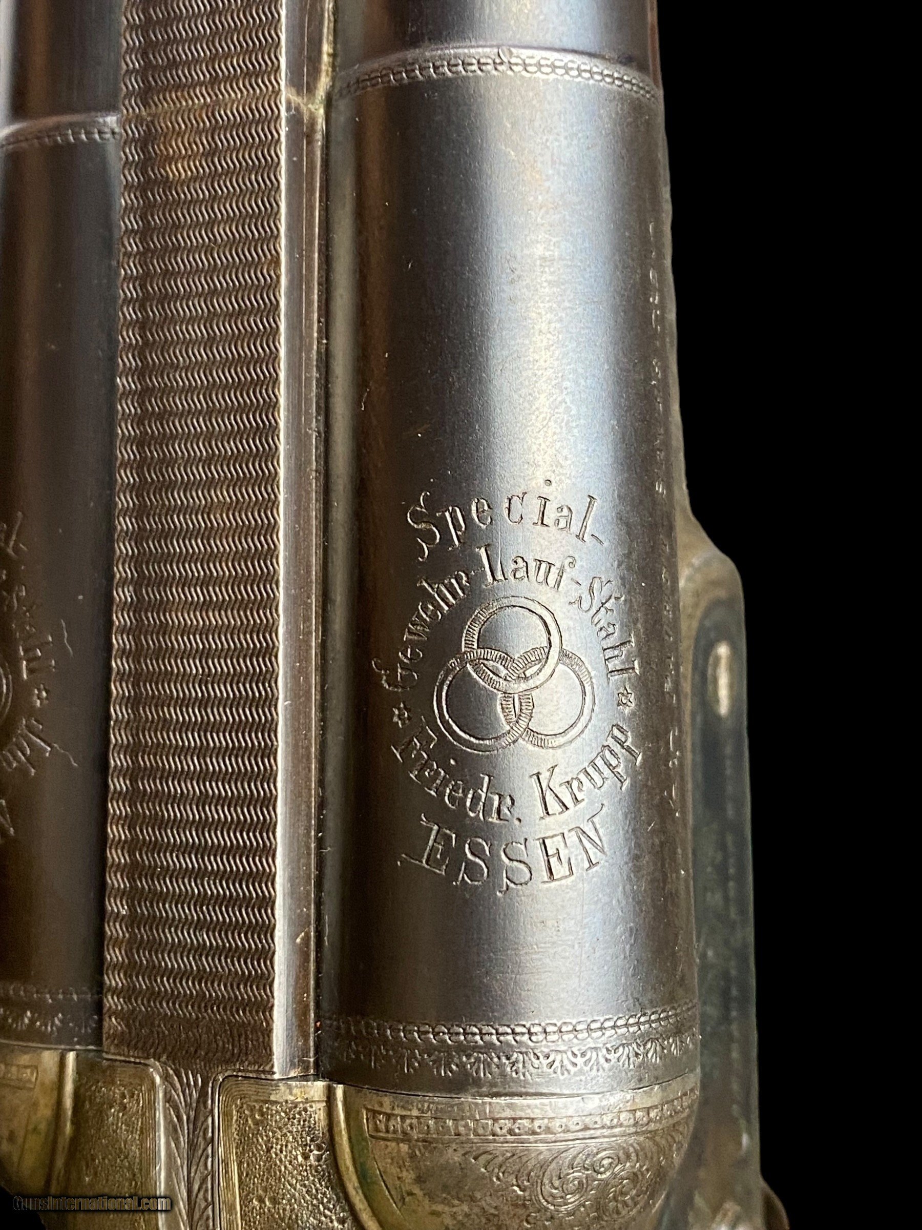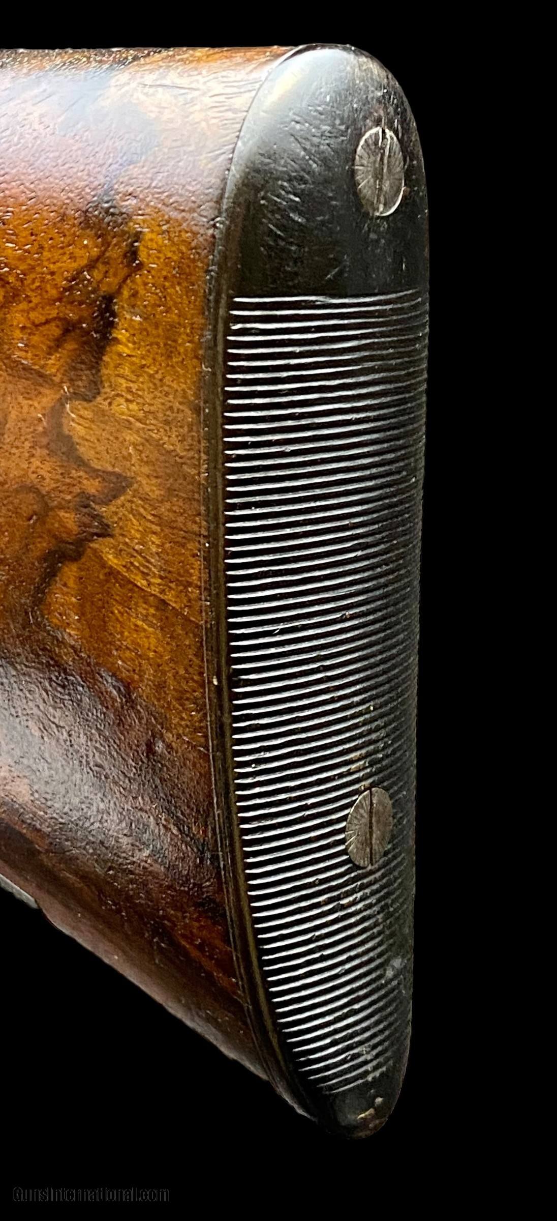 Description: JP SAUER - GERMANY CAL: 43 MAUSER OR 11 X 68MM MODEL: SIDELOCK DOUBLE RIFLE 35% SCROLL ENGRAVING AND MARKED " J.P. SAUER & SOHN SUHL" & CLOCKHAND COCKING INDICATORS DOUBLE TRIGGERS & EXTRACTORS UNIQUE FLUSH MOUNT FOLD-UP AND ADJUSTABLE TANG MOUNTED PEEP SIGHT. 23.5" STEEL BARRELS W/ ONE STANDING - ONE FOLDING REAR SIGHT (MARKED 175) EUROPEAN WALNUT STOCK WITH SHADOWLINE CHEEKPIECE, STEEL CAPPED PISTOL GRIP, BULLET TRAP (HOLDS 4 ROUNDS) AND BLACK BUTTPLATE LOP: 14" WEIGHT: 6LBS 15OZ CONDITION: GUN IS IN GOOD OVERALL ORIGINAL CONDITION. BARRELS SLIGHTLY OFF-FACE. SHOWING 90% ORIGINAL BLUE. CASE COLOR ACTION IS MOTTLED. WOOD HAS ORIGINAL OIL FINISH WITH HANDLING MARKS COMMENSURATE WITH AGE. MECHANICALLY SOUNDS. COCKING INDICATORS WORK AS DESIGNED. STRONG RIFLING WITH FROSTING ON EDGES. GENTLEMEN, THIS IS A UNIQUE SAUER DOUBLE RIFLE AND AN EARLY EXAMPLE OF SAUER'S FINE CRAFTSMANSHIP. A GREAT ADDITION TO ANY SAUER COLLECTION! WOULD MAKE FOR A GREAT NORTH AMERICAN FIELD GUN! PLEASE CALL NOW! SOLD Curio/Relic: Yes Manufacturer: JP SAUER Model: DOUBLE RIFLE Serial Number: 56784 Barrel Length: 23.5 |