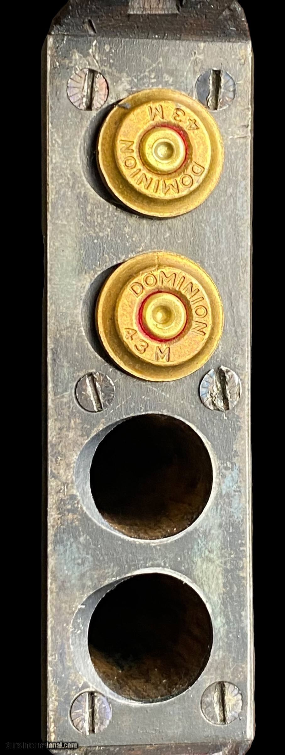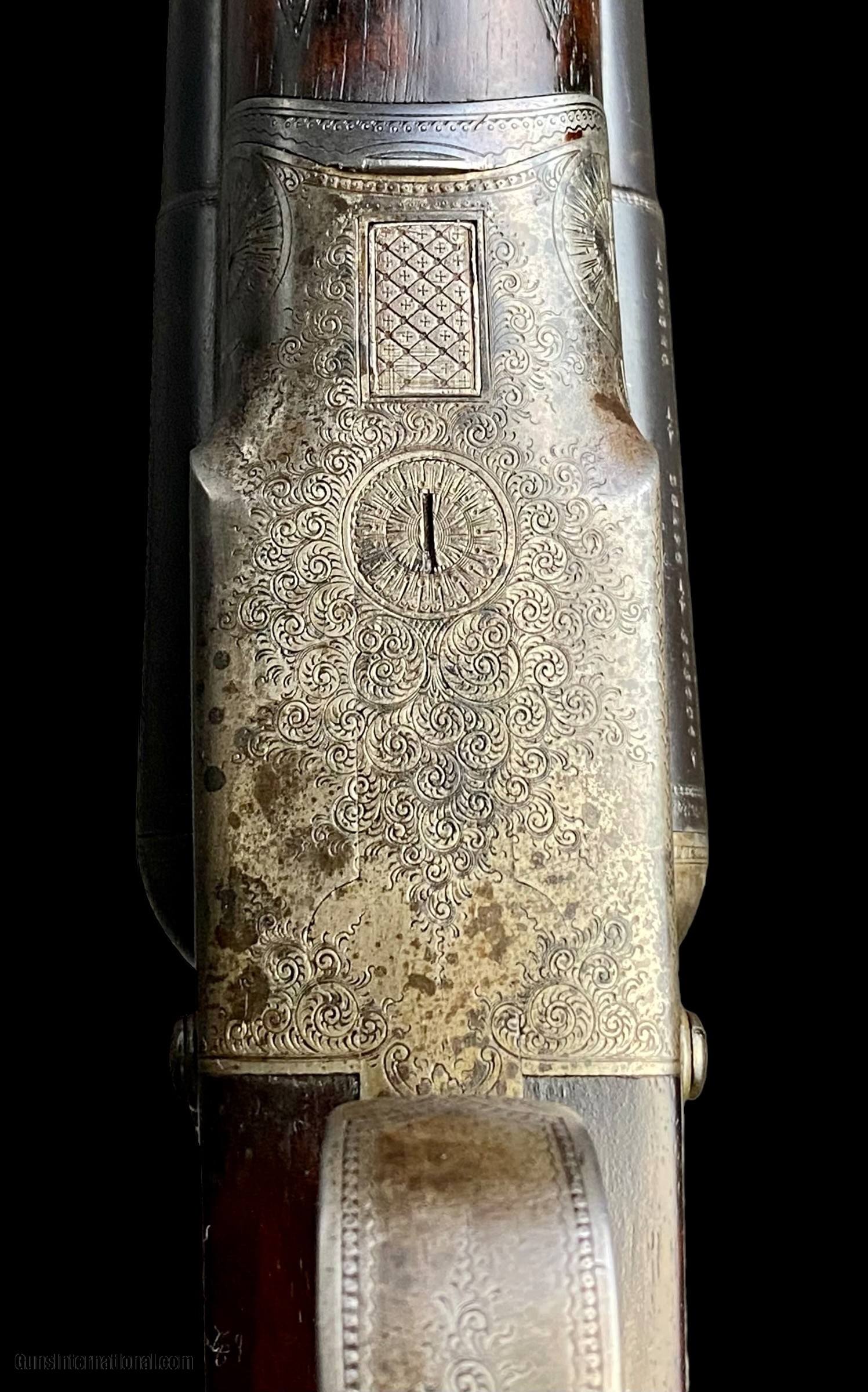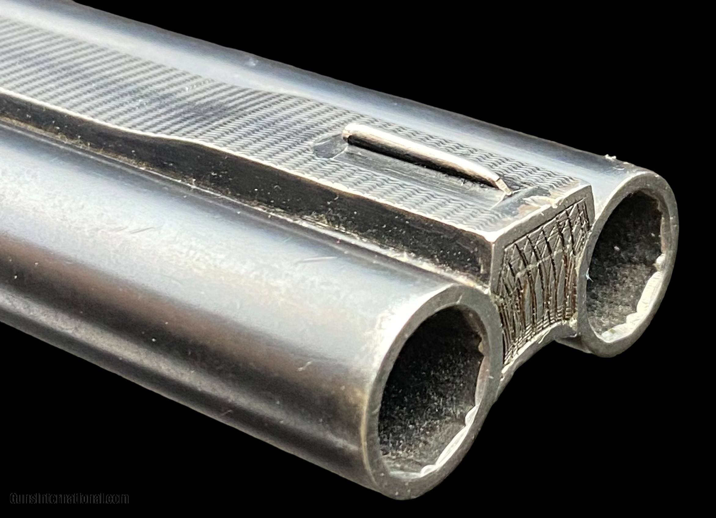 Description: JP SAUER - GERMANY CAL: 43 MAUSER OR 11 X 68MM MODEL: SIDELOCK DOUBLE RIFLE 35% SCROLL ENGRAVING AND MARKED " J.P. SAUER & SOHN SUHL" & CLOCKHAND COCKING INDICATORS DOUBLE TRIGGERS & EXTRACTORS UNIQUE FLUSH MOUNT FOLD-UP AND ADJUSTABLE TANG MOUNTED PEEP SIGHT. 23.5" STEEL BARRELS W/ ONE STANDING - ONE FOLDING REAR SIGHT (MARKED 175) EUROPEAN WALNUT STOCK WITH SHADOWLINE CHEEKPIECE, STEEL CAPPED PISTOL GRIP, BULLET TRAP (HOLDS 4 ROUNDS) AND BLACK BUTTPLATE LOP: 14" WEIGHT: 6LBS 15OZ CONDITION: GUN IS IN GOOD OVERALL ORIGINAL CONDITION. BARRELS SLIGHTLY OFF-FACE. SHOWING 90% ORIGINAL BLUE. CASE COLOR ACTION IS MOTTLED. WOOD HAS ORIGINAL OIL FINISH WITH HANDLING MARKS COMMENSURATE WITH AGE. MECHANICALLY SOUNDS. COCKING INDICATORS WORK AS DESIGNED. STRONG RIFLING WITH FROSTING ON EDGES. GENTLEMEN, THIS IS A UNIQUE SAUER DOUBLE RIFLE AND AN EARLY EXAMPLE OF SAUER'S FINE CRAFTSMANSHIP. A GREAT ADDITION TO ANY SAUER COLLECTION! WOULD MAKE FOR A GREAT NORTH AMERICAN FIELD GUN! PLEASE CALL NOW! SOLD Curio/Relic: Yes Manufacturer: JP SAUER Model: DOUBLE RIFLE Serial Number: 56784 Barrel Length: 23.5 |