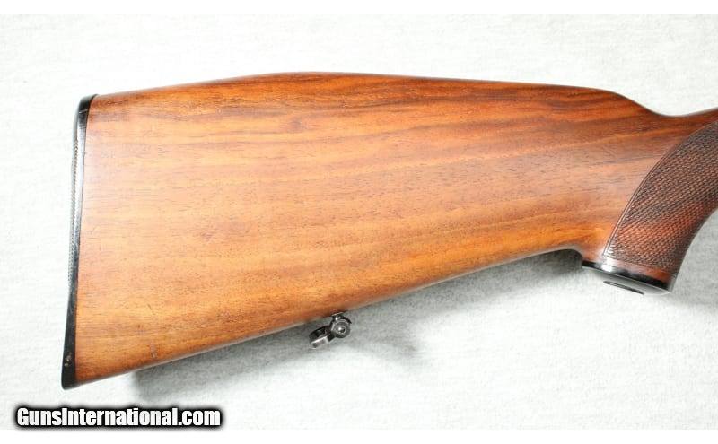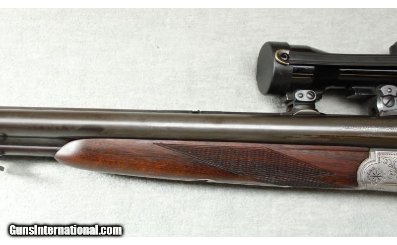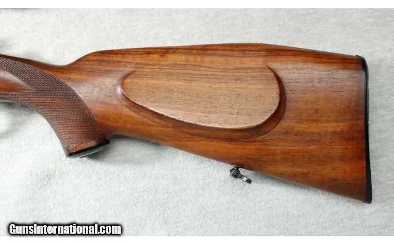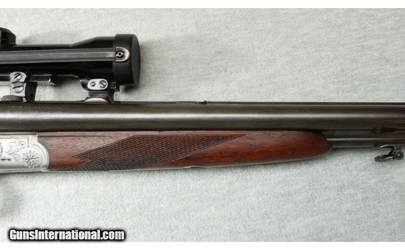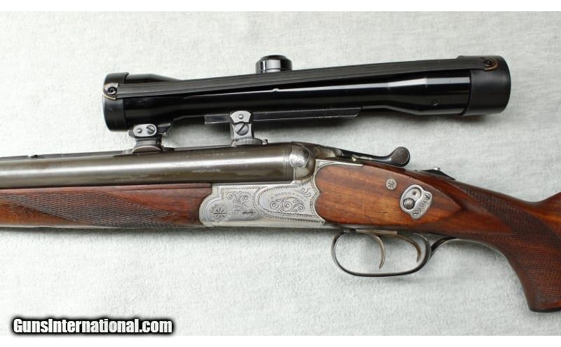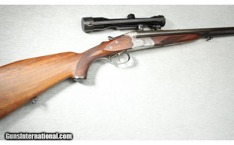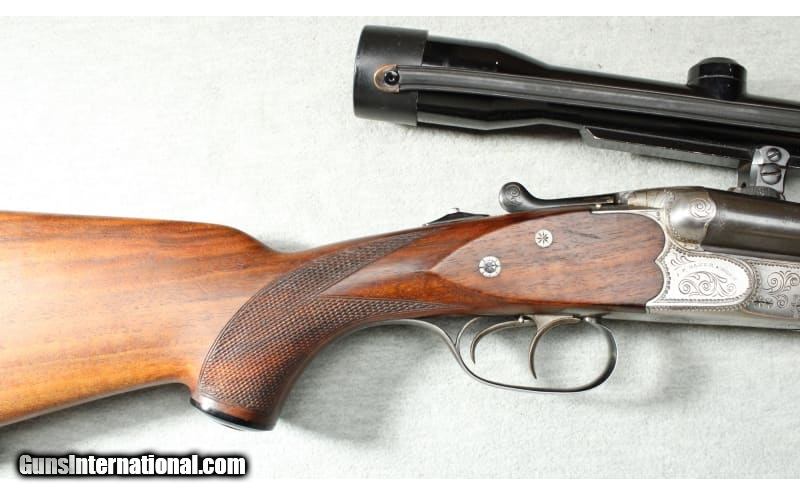 Description: J.P. Sauer & Sohn Model 32 Drilling chambered in 16 Gauge and 7x65R. J.P. Sauer & Sohn firm which was first established in 1751 and Germany's oldest gunmaker. This J.P. Sauer & Sohn drilling remains a spectacular work of fine craftsmanship today. This is a Post-War version as it is stamped "MADE IN W-GERMANY". The shotgun barrels are choked Full/Half-Full (Modified) and are chambered for 2 3/4-inch shell. The barrels are bright, and the rifle barrel has strong rifling. It uses a scalloped boxlock design which is very strong with two locking lugs on the bottom of the barrels in addition to a "Greener" designed crossbolt. It has 16 gauge barrels over a rifle barrel chambered in the 7x65R Mauser Rimmed cartridge. It featured a top tang-mounted selector which when on the rifle setting raises a rear sight blade on the rib with a zero setting of 100 meters. The double triggers worked as any other double barrel shotgun when the selector was set for the shotgun, but when the rifle barrel was selected only the front trigger was used. The safety is mounted on the left side of the stock and is inlaid above the double triggers. This drilling also features cocking indicators, located on the top of the upper tang on either side of the action lever. This drilling has double claw mount scope bases which allow use of fixed sights with a mounted scope. It has a Hensoldt Wetzlar Diatal-D 4x32 Rifle scope. 16/7X65R SOLD Chambers: 2 3/4 Inches Metal Condition: Very good Wood Condition: Very good with very minor handling marks Bore Condition: Bright Barrels: 25 1/2 Inches Triggers: Double triggers Stock Dimensions: LOP 14 1/2 Inches from front trigger Fore End: Checkered walnut Butt Pad: Plastic pad Weight: 6 Lbs 9 oz Sights: "Rear rifle sight that pops up when the rifle is selected, Hensoldt Wetzlar Diatal-D 4x32 Rifle scope Item Location: La Vista, NE |