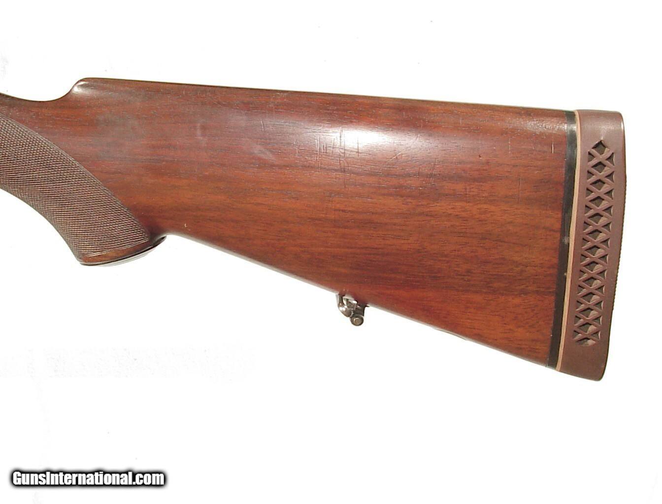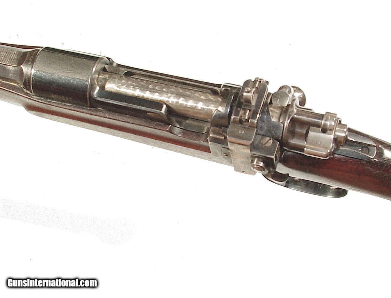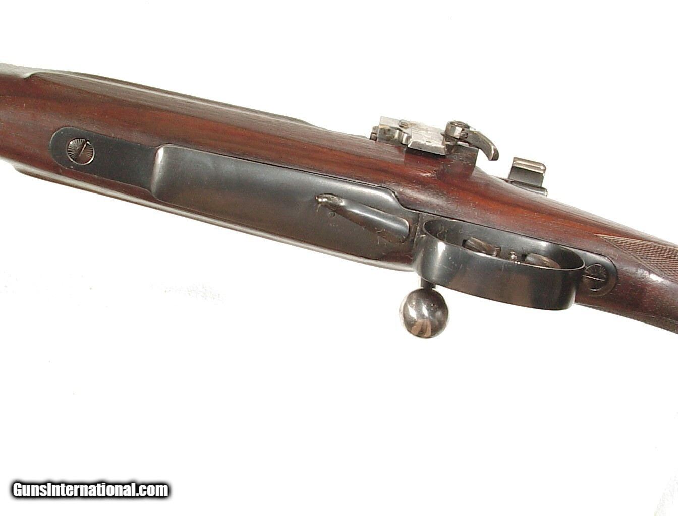 Description: 8X57S caliber, 22" barrel with raised rib mid mounted folding express sight. Blade front sight and Lyman 48 rear receiver sight. Finished blue overall with lever actuated hinged floorplate and jeweled bolt. Double set triggers, factory sling swivels. Checkered walnut pistol grip buttstock ending with a hardrubber pad. LOP: 13 7/8" from the front trigger. Retaining all of the blue, mint bore and excellent wood and checkering. Curio/Relic: Yes Price: $2,250.00 Contact Seller |